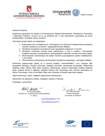 Szanowni Państwo, Serdecznie zapraszamy do udziału w II Powszechnym Zjeździe Ekonomistów, Menedżerów, Prawników i Historyków Morskich. Liczymy na to, że podobnie jak w roku poprzednim, zgromadzą się licznie profesjonaliści i entuzjaści spraw morskich. Cele tegorocznego Zjazdu są następujące: 1. Rozpoczęcie prac foresightowych, zmierzających do stworzenia długookresowej prognozy wyzwań związanych ze stanem i zagospodarowaniem Bałtyku. 2. Określenie perspektyw rozwojowych branż gospodarki związanych z morzem. 3. Określenie możliwości rozwoju miast nadmorskich, w tym w związku z koncepcjami miejskich obszarów funkcjonalnych, metropolitalnych obszarów wzrostu oraz Kartą Lipską. 4. Sformułowanie rekomendacji dla polityk morskich poszczególnych państw nadbałtyckich, w tym Polski. 5. Sformułowanie rekomendacji dla kierunków kształcenia związanego z potrzebami Bałtyku. Partnerami tegorocznego Zjazdu są w ramach projektu „GenerationBALT” m.in. Krajowa Izba Gospodarki Morskiej, Linnaeus University, Klaipeda University, Uniwersytet Szczeciński, Politechnika Gdańska, Baltic Fishing Fleet State Academy (Kaliningrad), Instytut Oceanologii Polskiej Akademii Nauk, Instytut Morski w Gdańsku, Klaipeda Science and Technology Park, German Association for Marine Technology, Union of the Baltic Cities oraz University of Rostock jako lider projektu. Języki konferencji: polski i angielski (zapewniamy tłumaczenie). Zapraszamy do zgłaszania udziału, wystąpień i głosów w dyskusji. Pozostając z szacunkiem Dr Piotr Dwojacki Uczelnia im. Eugeniusza Kwiatkowskiego w Gdyni www.GenerationBALT.pl (EN) www.kwiatkowski.edu.pl (PL) Dr Frank Hansen Project Manager University of Rostock 12:00 Rejestracja uczestników 13:00 Otwarcie Zjazdu: - Prof. Jerzy Młynarczyk, WSAiB im. E. Kwiatkowskiego Prof. Gerhard Graf, University of Rostock Wprowadzenie do tematyki Zjazdu i dyskusji panelowych 14:00 Lunch 14:45 Dyskusje panelowe 1 UNDERWATER górnictwo podmorskie ● infrastruktura: sieci energetyczne, rurociągi, tunele ● zagrożenia chemiczne, miny ● wraki – eksploracja miejsc historii morskiej ● wyzwania dla R&D i edukacji 2 ON AND OVER THE SEA żegluga na Bałtyku ● porty bałtyckie ● farmy wiatrowe i energia z morza ● zabudowa wód morskich ● turystyka i życie na morza ● wyzwania dla R&D i edukacji 3 THE SEA AND THE CITY miasto i morze ● miejskie obszary funkcjonalne ● MEGA – metropolitalne obszary wzrostu ● planowanie przestrzenne ● waterfronts ● budowle nadbrzeżne (na lądzie i wodzie) ● kultura, turystyka i wypoczynek nad morzem ● przyroda obszarów przybrzeżnych i nadbrzeżnych ● wyzwania dla R&D i edukacji 4 LASTADIA przemysł stoczniowy ● budowa statków ● remonty statków ● restrukturyzacja ● dywersyfikacja ● przyszłe możliwości rozwoju ● wyzwania dla R&D i edukacji 5 NETWORKING klastry morskie ● klastry związane z Morzem Bałtyckim i terenami nadmorskimi ● klastry, izby gospodarcze, związki pracodawców i samorząd terytorialny ● współpraca triple helix ● wyzwania dla R&D i edukacji 17:30 Podsumowanie dyskusji panelowych 18:30 Zakończenie Uczestnicy Projektu GenerationBALT – partnerzy Zjazdu: University of Rostock – lider projektu Wyższa Szkoła Administracji i Biznesu im. E. Kwiatkowskiego w Gdyni Uniwersytet Szczeciński Politechnika Gdańska Klaipeda University Krajowa Izba Gospodarki Morskiej Klaipeda Science and Technology Park Linnaeus University Associated Organizations Baltic Fishing Fleet State Academy (Kaliningrad) Baltic University Programme Chamber of Industry and Commerce in Rostock Fundacja Gdyńska Inicjatywa Akademicka German Association for Marine Technology Instytut Morski w Gdańsku Instytut Oceanologii Polskiej Akademii Nauk Marint Centrum, Simrishamns Municipality Pomorski Klaster Morza i Zlewiska Wisły Union of the Baltic Cities Biuro Zjazdu: Wyższa Szkoła Administracji i Biznesu im. E. Kwiatkowskiego w Gdyni 81-303 Gdynia, ul. Kielecka 7, Tel. 58/660-74-29, Fax 58/621-12-70 e-mail: [email protected] Szef projektu: dr Piotr Dwojacki, Tel. +48/606121048, e-mail: [email protected]