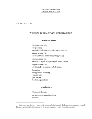 ROCZNIKI TEOLOGICZNE Tom LXI, zeszyt 5 — 2014 JOLANTA KOZIEJ WIERSZE O TEMATYCE UZDROWIENIA Uzdrów co chore Dopuszczam Cie˛ do podróży po ścieżkach przeze mnie wytyczonych dopuszczam Cie˛ do wyobraźni określonej moja˛ wizja˛ dopuszczam Cie˛ do mych myśli wytyczonych moja˛ miara˛ dopuszczam Cie˛ do filozofii z moich próbek życia bezradny moja˛ chora˛ ciasnota˛ wciśnij sie˛ jak lekarz boskim sposobem Inwalidztwo Czasami choruje˛ na migotanie przedsionków nadziei Mgr JOLANTA KOZIEJ − pracownik Instytutu Leksykografii KUL, asystent naukowy w dziale literatury polskiej i światowej; adres do korespondencji: e-mail: [email protected] 182 ŹRÓDŁA I MATERIAŁY na przewlekły ból cnoty na ostre zapalenie uczucia na zanik mie˛śni roztropności na przewe˛żenie kanalików dobroci na zawał mie˛śnia madrości ˛ na schizofrenie˛ prawdy wybieram sie˛ do Lekarza Modlitwa chorego Ulecz moje oczy chce˛ ogladać ˛ pie˛kno dzieł rak ˛ Twoich ulecz moje uszy chce˛ na nowo usłyszeć pieśń Oblubieńca ulecz moje gardło bym z cała˛ moca˛ mogła śpiewać radosne Alleluja ulecz moje serce niech pulsuje w rytmie miłości ulecz moje płuca niech zaczerpna˛ powiewu Ducha ulecz moje re˛ce niech dźwigaja˛ z pokora˛ brzemiona innych ulecz moje ramiona ŹRÓDŁA I MATERIAŁY by poniosły Twój krzyż na Golgote˛ ulecz moje nogi by mogły nieść Dobra˛ Nowine˛ Matka Teresa Nadal z lampa˛ panny roztropnej rozpraszasz ciemności poniżenia pochylona mocno nad ziemska˛ ułomnościa˛ zakochana w godności stworzeń wciaż ˛ wierzysz w człowieka wychodzisz do mnie by opatrzyć wszystkie rany czuje˛ twe otwarte ramiona Bernadetto Bernadetto nie poznałabyś swego miasteczka gwar wokół kwitnacego ˛ biznesu poletko Boże pod skała˛ oblegane wciaż ˛ przez tych którzy z wiara˛ pija˛ wode˛ czekajacy ˛ jak niewidomy przy sadzawce Bernadetto zdradź tajemnice˛ biednego szcze˛ścia niech odchodza˛ nawet chorzy ale w pokoju 183 184 ŹRÓDŁA I MATERIAŁY List do Bartymeusza Siedziałam koło ciebie i tak jak ty żebrałam o miske˛ strawy o pieniadze... ˛ ... o miłość pewnego dnia uzdrowił mnie Pan z duchowej ślepoty niemocy wiary paraliżu nadziei płaszcz oddałam bardziej ubogim Sadzawka nowego życia Zasiedziałam sie˛ w różnych krużgankach cierpienia nie zawsze słyszałam poruszenia wody sadzawke˛ omijałam szerokim łukiem dziś Jezus zaszedł po mnie poruszył toń mego serca Anioł zabrał łoże i cie˛żki bagaż przeszłości Do Matki Dobrego Pasterza Dzie˛ki Ci Matko za Twoje fiat cicha˛ odwage˛ na weselu w Kanie Galilejskiej ŹRÓDŁA I MATERIAŁY spojrzenie zrozumienia gdy wyruszałem w droge˛ misyjna˛ dyskretna˛ miłość w codziennym utrudzeniu ból nadziei przy moim konaniu nadal pomagasz mi wzruszam sie˛ ilekroć czule opatrujesz rany zagubionych to w Twoich ramionach bezpiecznie wracaja˛ do życia Troska o zdrowie Strawa ziemska codziennie spożywana w pe˛dzie i zachłannie wymagajaca ˛ jednak promocji narzucajaca ˛ sie˛ świeżościa˛ wabiaca ˛ zapachem stale walczaca ˛ o jakość i o klienta ......... pokarm niebieski skromny delikatnościa˛ ale jakże sycacy ˛ pokornie czekajacy ˛ na opieszałych wymagajacy ˛ jedynie nakładu serca 185