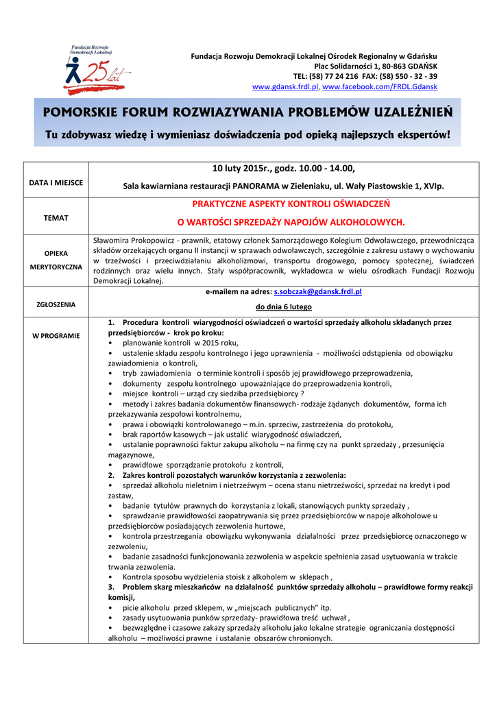 Fundacja Rozwoju Demokracji Lokalnej Ośrodek Regionalny w Gdańsku Plac Solidarności 1, 80-863 GDAŃSK TEL: (58) 77 24 216 FAX: (58) 550 - 32 - 39 www.gdansk.frdl.pl, www.facebook.com/FRDL.Gdansk 10 luty 2015r., godz. 10.00 - 14.00, DATA I MIEJSCE Sala kawiarniana restauracji PANORAMA w Zieleniaku, ul. Wały Piastowskie 1, XVIp. PRAKTYCZNE ASPEKTY KONTROLI OŚWIADCZEŃ TEMAT O WARTOŚCI SPRZEDAŻY NAPOJÓW ALKOHOLOWYCH. MERYTORYCZNA Sławomira Prokopowicz - prawnik, etatowy członek Samorządowego Kolegium Odwoławczego, przewodnicząca składów orzekających organu II instancji w sprawach odwoławczych, szczególnie z zakresu ustawy o wychowaniu w trzeźwości i przeciwdziałaniu alkoholizmowi, transportu drogowego, pomocy społecznej, świadczeń rodzinnych oraz wielu innych. Stały współpracownik, wykładowca w wielu ośrodkach Fundacji Rozwoju Demokracji Lokalnej. e-mailem na adres: [email protected] ZGŁOSZENIA do dnia 6 lutego OPIEKA W PROGRAMIE 1. Procedura kontroli wiarygodności oświadczeń o wartości sprzedaży alkoholu składanych przez przedsiębiorców - krok po kroku: • planowanie kontroli w 2015 roku, • ustalenie składu zespołu kontrolnego i jego uprawnienia - możliwości odstąpienia od obowiązku zawiadomienia o kontroli, • tryb zawiadomienia o terminie kontroli i sposób jej prawidłowego przeprowadzenia, • dokumenty zespołu kontrolnego upoważniające do przeprowadzenia kontroli, • miejsce kontroli – urząd czy siedziba przedsiębiorcy ? • metody i zakres badania dokumentów finansowych- rodzaje żądanych dokumentów, forma ich przekazywania zespołowi kontrolnemu, • prawa i obowiązki kontrolowanego – m.in. sprzeciw, zastrzeżenia do protokołu, • brak raportów kasowych – jak ustalić wiarygodność oświadczeń, • ustalanie poprawności faktur zakupu alkoholu – na firmę czy na punkt sprzedaży , przesunięcia magazynowe, • prawidłowe sporządzanie protokołu z kontroli, 2. Zakres kontroli pozostałych warunków korzystania z zezwolenia: • sprzedaż alkoholu nieletnim i nietrzeźwym – ocena stanu nietrzeźwości, sprzedaż na kredyt i pod zastaw, • badanie tytułów prawnych do korzystania z lokali, stanowiących punkty sprzedaży , • sprawdzanie prawidłowości zaopatrywania się przez przedsiębiorców w napoje alkoholowe u przedsiębiorców posiadających zezwolenia hurtowe, • kontrola przestrzegania obowiązku wykonywania działalności przez przedsiębiorcę oznaczonego w zezwoleniu, • badanie zasadności funkcjonowania zezwolenia w aspekcie spełnienia zasad usytuowania w trakcie trwania zezwolenia. • Kontrola sposobu wydzielenia stoisk z alkoholem w sklepach , 3. Problem skarg mieszkańców na działalność punktów sprzedaży alkoholu – prawidłowe formy reakcji komisji, • picie alkoholu przed sklepem, w „miejscach publicznych” itp. • zasady usytuowania punków sprzedaży- prawidłowa treść uchwał , • bezwzględne i czasowe zakazy sprzedaży alkoholu jako lokalne strategie ograniczania dostępności alkoholu – możliwości prawne i ustalanie obszarów chronionych. Fundacja Rozwoju Demokracji Lokalnej Ośrodek Regionalny w Gdańsku Plac Solidarności 1, 80-863 GDAŃSK TEL: (58) 77 24 216 FAX: (58) 550 - 32 - 39 www.gdansk.frdl.pl, www.facebook.com/FRDL.Gdansk 10 luty 2015r., godz. 10.00 - 14.00 PRAKTYCZNE ASPEKTY KONTROLI OŚWIADCZEŃ O WARTOŚCI SPRZEDAŻY NAPOJÓW ALKOHOLOWYCH. KARTA ZGŁOSZENIA ........................................................ (nazwa instytucji zgłaszającej) imię i nazwisko, stanowisko: ……………………………………………………………………………………………………………………………… tel./fax……………………………………………………………………………………. e-mail:……………………………………………………………… □ osoba zrzeszona w Pomorskim Forum RPU (lub w zastępstwie członka Forum) – 0 zł □ osoba dodatkowa z jednostki zrzeszonej w PFRPU – 180 zł □ osoba dodatkowa, z jednostki niezrzeszonej w PFRPU ale zrzeszonej w innych Forach FRDL – 280 zł □ osoba dodatkowa z jednostki niezrzeszonej w Forach FRDL – 500 zł (właściwe zaznaczyć) ....................... dn. ......................r. podpis……………………………………….