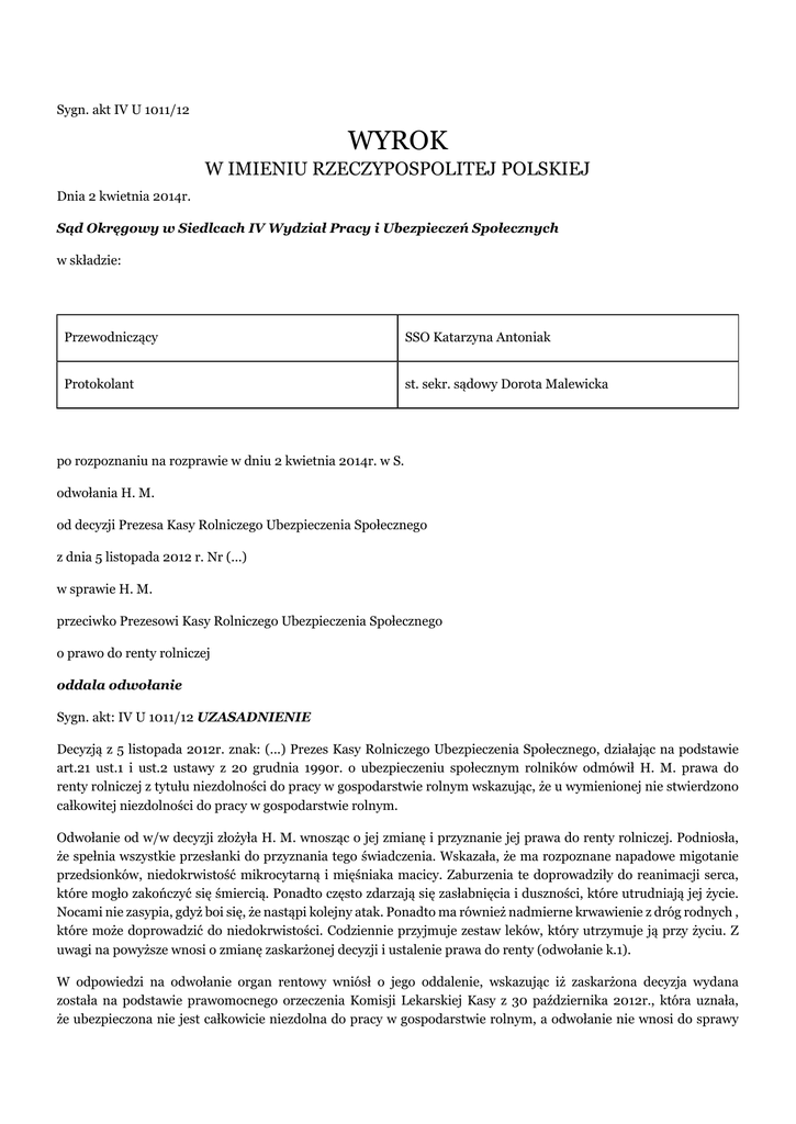 Sygn. akt IV U 1011/12 WYROK W IMIENIU RZECZYPOSPOLITEJ POLSKIEJ Dnia 2 kwietnia 2014r. Sąd Okręgowy w Siedlcach IV Wydział Pracy i Ubezpieczeń Społecznych w składzie: Przewodniczący SSO Katarzyna Antoniak Protokolant st. sekr. sądowy Dorota Malewicka po rozpoznaniu na rozprawie w dniu 2 kwietnia 2014r. w S. odwołania H. M. od decyzji Prezesa Kasy Rolniczego Ubezpieczenia Społecznego z dnia 5 listopada 2012 r. Nr (...) w sprawie H. M. przeciwko Prezesowi Kasy Rolniczego Ubezpieczenia Społecznego o prawo do renty rolniczej oddala odwołanie Sygn. akt: IV U 1011/12 UZASADNIENIE Decyzją z 5 listopada 2012r. znak: (...) Prezes Kasy Rolniczego Ubezpieczenia Społecznego, działając na podstawie art.21 ust.1 i ust.2 ustawy z 20 grudnia 1990r. o ubezpieczeniu społecznym rolników odmówił H. M. prawa do renty rolniczej z tytułu niezdolności do pracy w gospodarstwie rolnym wskazując, że u wymienionej nie stwierdzono całkowitej niezdolności do pracy w gospodarstwie rolnym. Odwołanie od w/w decyzji złożyła H. M. wnosząc o jej zmianę i przyznanie jej prawa do renty rolniczej. Podniosła, że spełnia wszystkie przesłanki do przyznania tego świadczenia. Wskazała, że ma rozpoznane napadowe migotanie przedsionków, niedokrwistość mikrocytarną i mięśniaka macicy. Zaburzenia te doprowadziły do reanimacji serca, które mogło zakończyć się śmiercią. Ponadto często zdarzają się zasłabnięcia i duszności, które utrudniają jej życie. Nocami nie zasypia, gdyż boi się, że nastąpi kolejny atak. Ponadto ma również nadmierne krwawienie z dróg rodnych , które może doprowadzić do niedokrwistości. Codziennie przyjmuje zestaw leków, który utrzymuje ją przy życiu. Z uwagi na powyższe wnosi o zmianę zaskarżonej decyzji i ustalenie prawa do renty (odwołanie k.1). W odpowiedzi na odwołanie organ rentowy wniósł o jego oddalenie, wskazując iż zaskarżona decyzja wydana została na podstawie prawomocnego orzeczenia Komisji Lekarskiej Kasy z 30 października 2012r., która uznała, że ubezpieczona nie jest całkowicie niezdolna do pracy w gospodarstwie rolnym, a odwołanie nie wnosi do sprawy żadnych nowych dowodów faktycznych i prawnych, które miałyby wpływ na zmianę zaskarżonej decyzji (odpowiedź organu rentowego na odwołanie k.2). Sąd ustalił, co następuje: Ubezpieczona H. M. jest rolniczką. Ma 49 lat. Decyzją z 7 listopada 2011r. organ rentowy przyznał ubezpieczonej prawo do renty rolniczej od 15 października 2011r. do 31 października 2012r. (decyzja z 7 listopada 2011r. k.39-40 akt rentowych). W dniu 3 września 2012r. ubezpieczona wystąpiła do Kasy Rolniczego Ubezpieczenia Społecznego z wnioskiem o ustalenie prawa do renty rolniczej na dalszy okres (wniosek k.44 akt rentowych). Rozpoznając wniosek organ rentowy skierował ubezpieczoną na badanie przez Lekarza Rzeczoznawcę, który w orzeczeniu z 5 października 2012r. uznał ubezpieczoną za nadal całkowicie niezdolną do pracy w gospodarstwie rolnym do września 2015r. (wypis z orzeczenia Lekarza Rzeczoznawcy z 5 października 2012r. k.55 akt rentowych). Na skutek wniesienia przez Regionalnego Inspektora Orzecznictwa Lekarskiego KRUS zarzutu wadliwości powyższego orzeczenia ubezpieczona skierowana została na badanie przez Komisję Lekarską Kasy, która w orzeczeniu z 30 października 2012r. nie uznała ubezpieczonej za całkowicie niezdolną do pracy w gospodarstwie rolnym (zarzut wadliwości orzeczenia Lekarza Rzeczoznawcy k.56v i wypis z orzeczenia Komisji Lekarskiej Kasy z 30 października 2012r. k.62 akt rentowych). Na podstawie powyższego orzeczenia, zaskarżoną decyzją z 5 listopada 2012r. Prezes Kasy Rolniczego Ubezpieczenia Społecznego odmówił ubezpieczonej prawa do renty rolniczej z tytułu niezdolności do pracy (decyzja z 5 listopada 2012r. k.64 akt rentowych). Biegli lekarze o specjalizacjach kardiolog i neurolog w opinii sporządzonej na zlecenie sądu rozpoznali u ubezpieczonej nadciśnienie tętnicze zredukowane, napadowe migotanie przedsionków, otyłość, hipercholesterolemię, okresowy zespół bólowy kręgosłupa szyjnego i lędźwiowo-krzyżowego bez upośledzenia funkcji ruchowej i stwierdzili, że stan zaawansowania tych schorzeń nie powoduje u ubezpieczonej całkowitej niezdolności do pracy w gospodarstwie rolnym. Ubezpieczona od kilku lat leczona jest nadciśnienie tętnicze oraz napadowe migotanie przedsionków i pozostaje na przewlekłym leczeniu przeciwzakrzepowym. W 2011r. z powodu napadowego migotania przedsionków wymagała hospitalizacji. Obecnie nadciśnienie tętnicze jest dobrze kontrolowane, a czynność serca jest miarowa, ponadto nie stwierdza się zastoju nad polami płucnymi oraz obrzęków kończyn. W zakresie narządu ruchu – rtg kręgosłupa szyjnego wskazuje na obniżenie wysokości krążków międzykręgowych na poziomie C6-C7, C7-Th1, a rtg kręgosłupa piersiowego i L-S wskazuje na stan granicach normy. Przedmiotowe badanie neurologiczne nie ujawnia objawów uszkodzenia ośrodkowego i obwodowego układu nerwowego. Układ ruchu pozostaje w granicach normy, gdyż ruchomość całego kręgosłupa jest prawidłowa, bez objawów ubytkowych korzeniowych (opinia biegłych lekarzy kardiologa D. W. i neurologa E. K. k.7-8 akt sprawy i opinia uzupełniająca tych samych biegłych k.19 akt sprawy). Analogiczną ocenę stanu zdrowia ubezpieczonej w kontekście zdolności do pracy w gospodarstwie rolnym przedstawił kolejny biegły kardiolog Z. K., który rozpoznał u ubezpieczonej nadciśnienie tętnicze unormowane, napadowe migotanie przedsionków w wywiadzie, przewlekłe leczenie przeciwzakrzepowe oraz zaburzenia gospodarki lipidowej i otyłość stwierdzając, że schorzenia te nie powodują całkowitej niezdolności ubezpieczonej do pracy w gospodarstwie rolnym. Od czasu hospitalizacji ubezpieczonej w 2011r. nie występują u niej nawroty zaburzeń rytmu serca wymagające hospitalizacji. Nie występuje jawna niewydol