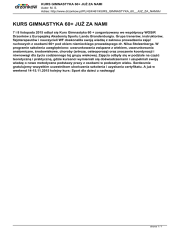 KURS GIMNASTYKA 60+ JUŻ ZA NAMI Autor: M. S. Adres: http://www.drzonkow.pl/PL/424/461/KURS_GIMNASTYKA_60__JUZ_ZA_NAMI/k/ KURS GIMNASTYKA 60+ JUŻ ZA NAMI 7 i 8 listopada 2015 odbył się Kurs Gimnastyka 60 + zorganizowany we współpracy WOSiR Drzonków z Europejską Akademią Sportu Landu Brandenburgia. Grupa trenerów, instruktorów, fizjoterapeutów i nauczycieli WF doskonaliła swoją wiedzę z zakresu prowadzenia zajęć ruchowych z osobami 60+ pod okiem niemieckiego prowadzącego dr. Nilsa Stolzenberga. W programie szkolenia uwzględniono: uwarunkowania związane z wiekiem, uwarunkowania anatomiczne, środowiskowe, choroby (artrozę, osteoporozę) oraz znaczenie koordynacji i równowagi dla życia codziennego tej grupy wiekowej. Zajęcia odbyły się w podziale na część teoretyczną i praktyczną, gdzie kursanci wymieniali się doświadczeniami i uzupełniali swoją wiedzę o nowe metodyczne podstawy pracy z osobami w podeszłym wieku. Serdecznie gratulujemy wszystkim uczestnikom ukończenia szkolenia i uzyskania certyfikatu. A już w weekend 14-15.11.2015 kolejny kurs: Sport dla dzieci z nadwagą! strona 1 / 1 Powered by TCPDF (www.tcpdf.org)