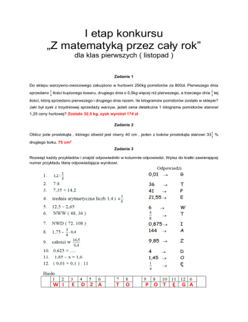 I etap konkursu „Z matematyką przez cały rok” dla klas pierwszych ( listopad ) Zadanie 1 Do sklepu warzywno-owocowego zakupiono w hurtowni 250kg pomidorów za 800zł. Pierwszego dnia 1 2 4 3 sprzedano ilości kupionego towaru, drugiego dnia o 5,5kg więcej niż pierwszego, a trzeciego dnia tej ilości, którą sprzedano pierwszego i drugiego dnia razem. Ile kilogramów pomidorów zostało w sklepie? Jaki był zysk z trzydniowej sprzedaży warzyw, jeżeli cena detaliczna 1 kilograma pomidorów stanowi 1,25 ceny hurtowej? Zostało 32,5 kg, zysk wyniósł 174 zł Zadanie 2 1 Oblicz pole prostokąta , którego obwód jest równy 40 cm , jeden z boków prostokąta stanowi 33 % 3 drugiego boku. 75 cm2 Zadanie 3 Rozwiąż każdy przykładów i znajdź odpowiedniki w kolumnie odpowiedzi. Wpisz do kratki zawierającej numer przykładu literę odpowiadająca wynikowi. W I E D Z A T O P O T Ę G A