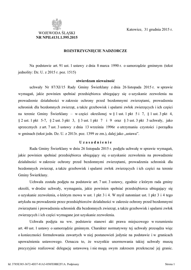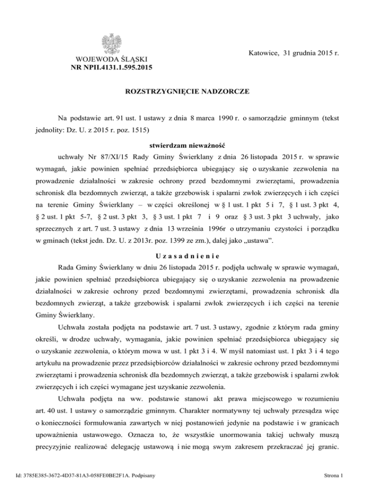 Katowice, 31 grudnia 2015 r. WOJEWODA ŚLĄSKI NR NPII.4131.1.595.2015 ROZSTRZYGNIĘCIE NADZORCZE Na podstawie art. 91 ust. 1 ustawy z dnia 8 marca 1990 r. o samorządzie gminnym (tekst jednolity: Dz. U. z 2015 r. poz. 1515) stwierdzam nieważność uchwały Nr 87/XI/15 Rady Gminy Świerklany z dnia 26 listopada 2015 r. w sprawie wymagań, jakie powinien spełniać przedsiębiorca ubiegający się o uzyskanie zezwolenia na prowadzenie działalności w zakresie ochrony przed bezdomnymi zwierzętami, prowadzenia schronisk dla bezdomnych zwierząt, a także grzebowisk i spalarni zwłok zwierzęcych i ich części na terenie Gminy Świerklany – w części określonej w § 1 ust. 1 pkt 5 i 7, § 1 ust. 3 pkt 4, § 2 ust. 1 pkt 5-7, § 2 ust. 3 pkt 3, § 3 ust. 1 pkt 7 i 9 oraz § 3 ust. 3 pkt 3 uchwały, jako sprzecznych z art. 7 ust. 3 ustawy z dnia 13 września 1996r o utrzymaniu czystości i porządku w gminach (tekst jedn. Dz. U. z 2013r. poz. 1399 ze zm.), dalej jako „ustawa”. Uzasadnienie Rada Gminy Świerklany w dniu 26 listopada 2015 r. podjęła uchwałę w sprawie wymagań, jakie powinien spełniać przedsiębiorca ubiegający się o uzyskanie zezwolenia na prowadzenie działalności w zakresie ochrony przed bezdomnymi zwierzętami, prowadzenia schronisk dla bezdomnych zwierząt, a także grzebowisk i spalarni zwłok zwierzęcych i ich części na terenie Gminy Świerklany. Uchwała została podjęta na podstawie art. 7 ust. 3 ustawy, zgodnie z którym rada gminy określi, w drodze uchwały, wymagania, jakie powinien spełniać przedsiębiorca ubiegający się o uzyskanie zezwolenia, o którym mowa w ust. 1 pkt 3 i 4. W myśl natomiast ust. 1 pkt 3 i 4 tego artykułu na prowadzenie przez przedsiębiorców działalności w zakresie ochrony przed bezdomnymi zwierzętami i prowadzenia schronisk dla bezdomnych zwierząt, a także grzebowisk i spalarni zwłok zwierzęcych i ich części wymagane jest uzyskanie zezwolenia. Uchwała podjęta na ww. podstawie stanowi akt prawa miejscowego w rozumieniu art. 40 ust. 1 ustawy o samorządzie gminnym. Charakter normatywny tej uchwały przesądza więc o konieczności formułowania zawartych w niej postanowień jedynie na podstawie i w granicach upoważnienia ustawowego. Oznacza to, że wszystkie unormowania takiej uchwały muszą precyzyjnie realizować delegację ustawową i nie mogą swym zakresem przekraczać jej granic. Id: 3785E385-3672-4D37-81A3-058FE0BE2F1A. Podpisany Strona 1 W wyroku z dnia z 26 maja 1992 r. Naczelny Sąd Administracyjny podkreśla w tezie pierwszej, że "rady gmin stanowiące akty prawa miejscowego (...) winny treść swoich regulacji dostosować ściśle do zakresu przyznanego im upoważnienia i przysługujących im kompetencji (...), a w razie wątpliwości co do zakresu tego upoważnienia wyjaśnić te wątpliwości przez zastosowanie wykładni zawężającej" (sygn. akt SA/Wr 310/92, publ. "Wspólnota" 1993, nr 2, s. 21). Ustawodawca, kształtując w przepisie art. 7 ust. 3 ustawy upoważnienie rady gminy do podjęcia przedmiotowej uchwały, precyzyjnie wskazał kwestie, które pozostawił regulacji organu stanowiącego jednostki samorządu terytorialnego. Rada gminy, w oparciu o ten przepis uprawniona jest do określenia wymagań, jakie powinien spełniać przedsiębiorca ubiegający się o uzyskanie przedmiotowych zezwoleń. Oznacza to, że uchwała w sprawie wymagań kierowana jest do podmiotów, które dopiero zamierzają podjąć na danym terenie wskazaną w art. 7 ust. 1 pkt 3 i 4 ustawy działalność. W związku z tym nie może ona formułować dowolnych wymagań, ale tylko takie, które możliwe są przez te podmioty do spełnienia przed uzyskaniem określonego zezwolenia. Wojewódzki Sąd Administracyjny w Gliwicach w wyroku z dnia 29 września 2010r. (sygn. akt II SA/GL 354/10, http://orzeczenia.nsa.gov.pl) jednoznacznie wskazał, iż „w ustawowym upoważnieniu do podjęcia uchwały nie mieściło się bowiem uprawnienie do regulowania jakichkolwiek kwestii nie odnoszących się do etapu ubiegania się przedsiębiorcy o uzyskanie zezwolenia. W konsekwencji inkryminowane passusy jako wykraczające poza zakres ustawowej delegacji naruszają prawo”. W innym wyroku Sąd ten stwierdził, iż „określenie innych wymagań, a w szczególności tych, które dotyczą obowiązków przedsiębiorcy w czasie wykonywania działalności już po uzyskaniu zezwolenia, wykracza poza delegację ustawową zawartą w art. 7 ust. 3a ustawy. Takie wykroczenie świadczy o wadliwości uchwalanych zapisów uzasadniającej wyeliminowanie z obrotu prawnego zaskarżonej uchwały w części” (wyrok WSA w Gliwicach z dnia 15 września 2010, sygn. akt II SA/GL 355/10, http://orzeczenia.nsa.gov.pl). Przy czym cytowane powyżej tezy orzeczeń sądów administracyjnych znajdą zastosowanie przy dokonywaniu oceny zarówno uchwał podejmowanych na podstawie art. 7 ust. 3a, jak i art. 7 ust. 3 ustawy. Chodzi więc o wskazanie w uchwale wyłącznie takich wymagań, spełnieniem których przedsiębiorca może się wykazać na etapie ubiegania się przez niego o zezwolenie. Tymczasem, w ocenie organu nadzoru, niektóre regulacje przedmiotowej uchwały wykraczają poza zakres przekazanego Radzie Gminy upoważnienia ustawowego z art. 7 ust. 3 ustawy. Wymagania te nie są bowiem możliwe do zweryfikowania na etapie poprzedzającym wydanie zezwolenia – albowiem dotyczą czynności realizowanych przez przedsiębiorcę w trakcie prowadzenia określonego rodzaju działalności. Zdaniem organu nadzoru nie sposób bowiem na etapie postępowania poprzedzającego wydanie decyzji w sprawie udzielenia zezwolenia na prowadzenie określonej działalności zweryfikować: Id: 3785E385-3672-4D37-81A3-058FE0BE2F1A. Podpisany Strona 2 - czy przedsiębiorca będzie posiadać umowę o współpracy z lekarzem weterynarii (§ 1 ust. 1 pkt 5 i § 2 ust. 1 pkt 5 i § 3 ust. 1 pkt 9 uchwały), - czy przedsiębiorca będzie posiadać odpowiednio wykształco