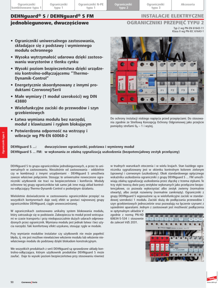 Ograniczniki kombinowane typu 1 Ograniczniki typu 1 Ograniczniki N-PE typu 1 DEHNguard® S / DEHNguard® S FM jednobiegunowe, dwuczęściowe Ograniczniki typu 2 Ograniczniki typu 3 Akcesoria INSTALACJE ELEKTRYCZNE OGRANICZNIKI PRZEPIĘĆ TYPU 2 Typ 2 wg PN-EN 61643-11 Klasa II wg PN-IEC 61643-1 • Ograniczniki uniwersalnego zastosowania, składające się z podstawy i wymiennego modułu ochronnego • Wysoka wytrzymałość udarowa dzięki zastosowaniu warystorów z tlenku cynku • Wysoki poziom bezpieczeństwa dzięki urządzeniu kontrolno-odłączającemu ”ThermoDynamik-Control” • Energetycznie skoordynowany z innymi produktami Czerwonej/Serii • Małe wymiary (1 moduł szerokości) wg DIN 43880 • Wielofunkcyjne zaciski do przewodów i szyn grzebieniowych Ograniczniki typu 2 • Łatwa wymiana modułu bez narzędzi, moduł z klawiszami i ryglem blokującym Do ochrony instalacji niskiego napięcia przed przepięciami. Do stosowania zgodnie ze Strefową Koncepcją Ochrony Odgromowej jako przejście pomiędzy strefami 0B – 1 i wyżej. • Potwierdzona odporność na wstrząsy i wibracje wg PN-EN 60068-2 DEHNguard S ...: dwuczęściowe ograniczniki, podstawa i wymienny moduł DEHNguard S ... FM: w wykonaniu ze zdalną sygnalizacją uszkodzenia (bezpotencjałowy zestyk przełączny) DEHNguard S to grupa ograniczników jednobiegunowych, a przez to uniwersalnych w zastosowaniu. Niezależnie od zastosowania - oddzielnie czy w kombinacji z innymi urządzeniami - DEHNguard S umożliwia zawsze właściwe połączenie. Stosując te uniwersalne nowoczesne ograniczniki użytkownik nie traci na bezpieczeństwie i komforcie. Moduły ochronne tej grupy ograniczników tak samo jak inne mają układ kontrolno-odłączający Thermo-Dynamik-Control o podwójnym działaniu. Wieloletnie doświadczenie w zastosowaniu ograniczników przepięć na wszystkich kontynentach daje swój efekt w postaci najnowszej grupy ograniczników DEHNguard, ciągle unowocześnianej. W ogranicznikach zastosowano unikalny system blokowania modułu, który zatrzaskuje się w podstawie. Zabezpiecza to moduł przed wstrząsami w czasie transportu i przy niedopuszczalnie dużych udarach odprowadzonych przez ogranicznik. Wymiana modułu jest jednak łatwa i bez użycia narzędzi. Taki komfortowy efekt uzyskano, stosując rygle w module. w trudnych warunkach otoczenia i w wielu krajach. Stan każdego ogranicznika sygnalizowany jest w okienku kontrolnym kolorem zielonym (sprawny) i czerwonym (uszkodzony). Obok standardowego optycznego wskaźnika uszkodzenia ograniczniki z grupy DEHNguard S ... FM umożliwiają zdalną sygnalizację uszkodzenia przez złączkę z trzema stykami. Te trzy styki tworzą dwie pary zestyków wykonanych jako przełączne bezpotencjałowe, co pozwala wykorzystać albo zestyk zwierny (normalnie otwarty), albo zestyk rozwierny (normalnie zamknięty). Ograniczniki z grupy DEHNguard S wyposażone są w wielofunkcyjne zaciski w standardowej szerokości 1 modułu. Zaciski służą do podłączania przewodów i szyn grzebieniowych jednocześnie oraz pozwalają na łączenie szynami z sąsiednimi aparatami. Jednym z zastosowań jest możliwość podłączenia w optymalnym układzie V zgodnie z normą PN-HD 60634-5-534 i stosownie do zaleceń VdS 2031. Przy wymianie modułów instalator czy użytkownik nie może popełnić błędu, tj. nie jest możliwe niewłaściwe włożenie modułu lub włożenie niewłaściwego modułu do podstawy dzięki blokadom konstrukcyjnym. We wszystkich produktach z serii DEHNguard są sprawdzone układy kontrolno-odłączające, którym użytkownik produktów DEHNguard S może zaufać. Daje to wysoki poziom bezpieczeństwa przy stosowaniu również 90 www.dehn.pl Ograniczniki kombinowane typu 1 Ograniczniki typu 1 Ograniczniki N-PE typu 1 Ograniczniki typu 2 DEHNguard® S / DEHNguard® S FM DEHNguard S ... FM Ograniczniki typu 3 Akcesoria INSTALACJE ELEKTRYCZNE OGRANICZNIKI PRZEPIĘĆ TYPU 2 Wysokość do szyny 12 11 14 Schemat połączeń DG S ... FM Rysunek wymiarowy DG S ... FM DG S ... FM: jednobiegunowe, modułowe ograniczniki, podstawa i wymienny moduł; ze zdalną sygnalizacją uszkodzenia (bezpotencjałowy zestyk przełączny) Ograniczniki typu 2 DG S 48 FM DG S 75 FM DG S 150 FM DG S 275 FM DG S 320 FM DG S 385 FM DG S 440 FM DG S 600 FM Ogranicznik wg PN-EN 61643-11 Typ 2 Typ 2 Typ 2 Typ 2 Typ 2 Typ 2 Typ 2 Typ 2 Ogranicznik wg PN-IEC 61643-1 Klasa II Klasa II Klasa II Klasa II Klasa II Klasa II Klasa II Klasa II Największe napięcie pracy AC UC 48 V 75 V 150 V 275 V 320 V 385 V 440 V 600 V Największe napięcie pracy DC UC 60 V 100 V 200 V 350 V 420 V 500 V 585 V 600 V Znam. prąd wyładowczy (8/20) In 10 kA 10 kA 15 kA 20 kA 20 kA 20 kA 20 kA 15 kA Maks. prąd wyładowczy (8/20) Imax 25 kA 40 kA 40 kA 40 kA 40 kA 40 kA 40 kA 30 kA Napięciowy poziom ochrony UP ≤ 0,3 kV ≤ 0,4 kV ≤ 0,7 kV ≤ 1,25 kV ≤ 1,5 kV ≤ 1,75 kV ≤ 2 kV ≤ 2,5 kV Nap. poziom ochrony przy 5 kA UP ≤ 0,25 kV ≤ 0,35 kV ≤ 0,55 kV ≤ 1 kV ≤ 1,2 kV ≤ 1,35 kV ≤ 1,7 kV ≤ 2 kV Czas zadziałania tA ≤ 25 ns ≤ 25 ns ≤ 25 ns ≤ 25 ns ≤ 25 ns ≤ 25 ns ≤ 25 ns ≤ 25 ns Maks. bezpiecznik dodatkowy 125 A gL/gG 125 A gL/gG 125 A gL/gG 125 A gL/gG 125 A gL/gG 125 A gL/gG 125 A gL/gG 100 A gL/gG Wytrzymałość zwarciowa przy maks. bezpieczniku 50 kAeff 50 kAeff 50 kAeff 50 kAeff 25 kAeff 25 kAeff 25 kAeff 25 kAeff Przepięcie dorywcze UT 70 V / 5 sekund 90 V / 5 sekund 175 V / 5 sekund 335 V / 5 sekund 335 V / 5 sekund 385 V / 5 sekund 580 V / 5 sekund 600 V / 5 sekund Przepięcia dorywcze - cecha wytrzymały wytrzymały wytrzymały wytrzymały wytrzymały wytrzymały wytrzymały wytrzymały Zakres temperatur pracy TU -40°C...+80°C -40°C...+80°C -40°C...+80°C -40°C...+80°C -40°C...+80°C -40°C...+80°C -40°C...+80°C -40°C...+80°C Wskaźnik działania / uszkodzenia zielony/czerwony zielony/czerwony zielony/czerwony zielony/czerwony zielony/czerwony zielony/czerw
