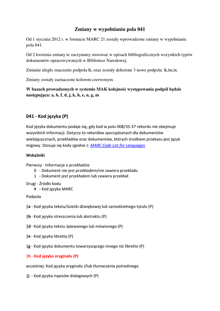 Zmiany w wypełnianiu pola 041 Od 1 stycznia 2012 r. w formacie MARC 21 zostały wprowadzone zmiany w wypełnianiu pola 041. Od 2 kwietnia zmiany te zaczynamy stosować w opisach bibliograficznych wszystkich typów dokumentów opracowywanych w Bibliotece Narodowej. Zmianie uległo znaczenie podpola |h, oraz zostały dołożone 3 nowe podpola: |k,|m,|n. Zmiany zostały zaznaczone kolorem czerwonym. W bazach prowadzonych w systemie MAK kolejność występowania podpól będzie następująca: a, b, f, d, j, k, h, e, n, g, m 041 - Kod języka (P) Kod języka dokumentu podaje się, gdy kod w polu 008/35-37 rekordu nie obejmuje wszystkich informacji. Dotyczy to rekordów sporządzanych dla dokumentów wielojęzycznych, przekładów oraz dokumentów, których środkiem przekazu jest język migowy. Stosuje się kody zgodne z: MARC Code List for Languages Wskaźniki Pierwszy - Informacje o przekładzie 0 - Dokument nie jest przekładem/nie zawiera przekładu 1 - Dokument jest przekładem lub zawiera przekład Drugi - Źródło kodu # - Kod języka MARC Podpola |a - Kod języka tekstu/ścieżki dźwiękowej lub samodzielnego tytułu (P) |b - Kod języka streszczenia lub abstraktu (P) |d - Kod języka tekstu śpiewanego lub mówionego (P) |e - Kod języka libretta (P) |g - Kod języka dokumentu towarzyszącego innego niż libretto (P) |h - Kod języka oryginału (P) wcześniej: Kod języka oryginału i/lub tłumaczenia pośredniego |j - Kod języka napisów dialogowych (P) |k – Kod języka przekładu pośredniego (P) Kod języka przekładu pośredniego poprzedza kody języka oryginału. |m – Kod języka oryginału dokumentu towarzyszącego innego niż libretto (P) |n – Kod języka oryginału libretta (P) Przykłady 041 1#|apol|keng|hchi Dokument w języku polskim, tłumaczony z angielskiego, oryginał w języku chińskim. 041 1#|aeng|kger|hswe Dokument w języku angielskim, tłumaczony z niemieckiego, oryginał w języku szwedzkim. 041 1#|dfre|hita|eeng|efre|eger|eita|geng|gfre|gger|gita|mger Dokument dźwiękowy (śpiew lub mowa) w języku francuskim, oryginał w języku włoskim, libretto w języku angielskim, francuskim, niemieckim, włoskim, dokument towarzyszący inny niż libretto w języku angielskim, francuskim, włoskim, oryginał dokumentu towarzyszącego innego niż libretto w języku niemieckim. 041 1#|deng|hrus|eeng|nrus|geng|gfre|gger Dokument dźwiękowy (śpiew lub mowa) w języku angielskim, oryginał w języku rosyjskim, libretto w języku angielskim, oryginał libretta w języku rosyjskim, dokument towarzyszący inny niż libretto w języku angielskim, francuskim i niemieckim.