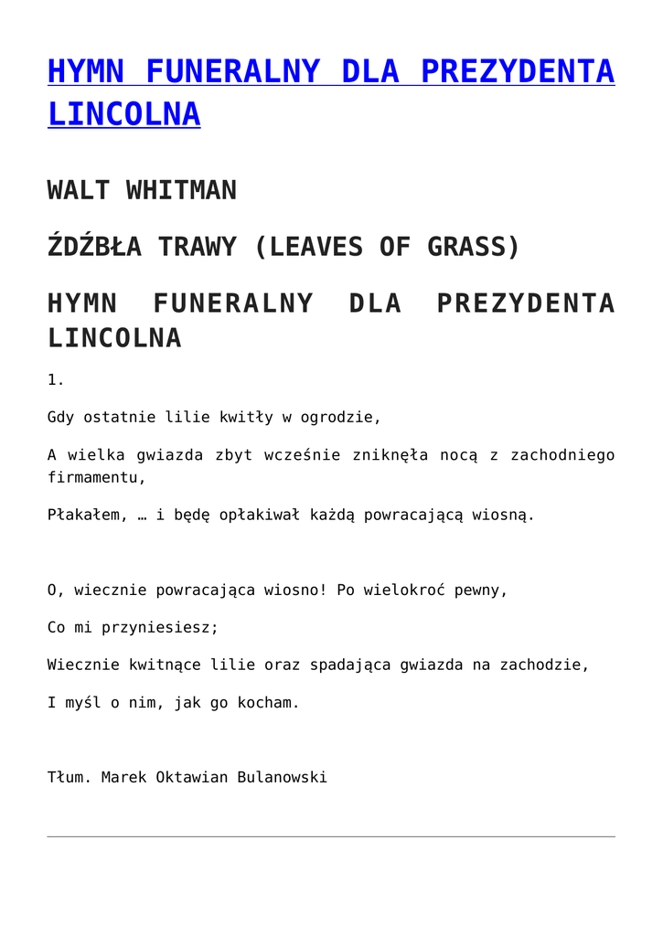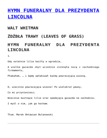 HYMN FUNERALNY DLA PREZYDENTA LINCOLNA WALT WHITMAN ŹDŹBŁA TRAWY (LEAVES OF GRASS) HYMN FUNERALNY LINCOLNA DLA PREZYDENTA 1. Gdy ostatnie lilie kwitły w ogrodzie, A wielka gwiazda zbyt wcześnie zniknęła nocą z zachodniego firmamentu, Płakałem, … i będę opłakiwał każdą powracającą wiosną. O, wiecznie powracająca wiosno! Po wielokroć pewny, Co mi przyniesiesz; Wiecznie kwitnące lilie oraz spadająca gwiazda na zachodzie, I myśl o nim, jak go kocham. Tłum. Marek Oktawian Bulanowski #ORFEUSZDOZOLWIA (TWITTERATURA) #ORFEUSZDOZOLWIA @MALYORFE przestałeś się ścigać, możesz okiem przestać klikać, co mi powiesz o Achillesie, jakiś komentarz o ojczyźnie? @SZYBKIZOŁW lubię wygrywać, nawet z Achillesem, lecz o twej ojczyźnie piszę tylko w bieliźnie @BOktawian któż by myślał, ojczyzna w potrzebie, a wy gdzie? Przy ambonie, przy stoliku w kawiarni? @MALYORFE przyjechałem z dalekiego kraju, zatem ręce umywaju, nie wiem co na prawo, nie oglądam się na lewo, idźcie zawsze prosto, mówcie zawsze ostro @SZYBKIZOLW demokracja ateńska to nie bałagan w głowach smoleński, ruszaj polsko, umyć się w trudzie, bo szybko zginiesz w brudzie (umysłowym!) BESTIARIUSZ LUB ORFEUSZA: ORFEUSZ POCHÓD Guillaume Apollinaire BESTIARIUSZ LUB POCHÓD ORFEUSZA ORFEUSZ Podziwiaj wielką moc: I szlachetność linii: Ona to głos który słyszymy dzięki światłu I o którym mówi Hermes Trismegistos I Poimandres Przeł. Marek Oktawian Bulanowski ZACZNĘ OD PAUMANOK (20) ZACZNĘ OD PAUMANOK (20) Walt Whitman 20. O, bliski Camerado! Wreszcie ty i ja – i tylko my dwaj. O, słowo, którym zawsze będziesz przecierać szlak przed nami! O, to coś ekstatycznego i nie do ukazania! O, dzika muzyko! O, teraz zwyciężam – i ty także; O, ręka w rękę – o wielka przyjemności – O, jeszcze jeden Pragnący i kochanek! O, spieszyć się, trzymając mocno – spieszyć się, Ciągle, wraz ze mną. Z cyklu „PIEŚNI O DEMOKRACJI”, Źdźbła trawy, 1900 Przeł. Marek Oktawian Bulanowski ZACZNĘ OD PAUMANOK ZACZNĘ OD PAUMANOK (19) Walt Whitman 19. Patrz! Parowce puszczają parę w moich wierszach! Ujrzyj w moich poematach imigrantów, którzy stale nadchodzą i osiedlają się; spójrz do tyłu, tam wigwam, ślad, chata myśliwego, tratwy, liście kukurydzy, skargi, proste płoty, wioski w matecznikach; zobacz, z jednej strony brzeg Pacyfiku, z drugiej – Atlantyku, jak zbliżają się i odchodzą z moich poematów jak i swoich brzegów; zobacz łąki i lasy w mych wierszach – zwierzęta, dzikie i oswojone – tam, za Kansas, niezliczone stada bizonów, karmiących się niewielkimi i kręconymi źdźbłami traw; zobacz w mych poematach miasta, silne, rozległe, we wnętrzu kraju, z brukowanymi ulicami, budynkami ze stali i kamienia, jak pojazdy mkną bez ustanku i wre biznes; popatrz na wielocylindrowe prasy drukarskie – także telegraf, łączący Kontynent od Pacyfiku do Manhatanu; zobacz w głębinach Atlantyku puls Ameryki, sięgający pulsu Europy, który szybko wraca; zobacz silną i szybką lokomotywę, jak odjeżdża, dyszy, gwiżdże ulatującymi dźwiękami pary; zobacz farmerów, orających swe pola – zobacz górników, dobywających urobek – zobacz niezliczone fabryki; zobacz mechaników, jak pracują narzędziami przy swych ławach; zobacz spomiędzy nich pochodzących sędziów, filozofów, prezydentów, jak wyłaniają się z ubrań roboczych; zobacz włóczęgów chodzących po sklepach i polach Stanów, mnie, ukochanego, w ramionach dnia i nocy; usłysz głośne echa moich pieśni! Przeczytaj jak moje rady wreszcie nadejdą. Z cyklu „PIEŚNI O DEMOKRACJI”, Źdźbła trawy, 1900 Przeł. Marek Oktawian Bulanowski LAST POET PRACTICES HIS MORAL VIEWS LAST POET PRACTICES HIS MORAL VIEWS To the left, to the right, He rhythmically sways his hips In the cycles of changes Of his sexual orientation Today he defends those Not conceived Slow-witted With reason disorders But joyfully trimming their beards Tomorrow he his going to vote for Those conceived but unhappy Righteously on their knees in bed And reading Kant But not avoiding taxes And witty paying them in Cyprus Last Poet is in good humour He remembers well his grandmather’s teachings Humility gets you everywhere That is why he is glad With his flexible views Really based on morals 2015-06-02 OSTATNI POETA PRZEMAWIA DO PRZYWÓDCÓW OJCZYZNY OSTATNI POETA PRZEMAWIA DO PRZYWÓDCÓW OJCZYZNY Drodzy przywódcy Dziękuję wam Że jesteście przywódcami Kocham wasze dzieci I wszystkie całuję w czółko Zapraszam was Na uroczystą kolację Wtedy dam wam ordery I odznaczenia Za wytrwałą służbę Na niwie kultury Oddanie za sprawy narodu Nieprzespane noce w służbie dla ludu wybranego Wielkie datki na potrzeby ubogich Naprawdę Jesteście po prostu WIELCY A my ostatni poeci Będziemy głosić waszą chwałę Zarabiać na życie wierszówkami I karmić się Głuchą nadzieją Że się poprawimy Bo zgrzeszyliśmy przeciw wam Podnieśliśmy kamień na was Kochających Szczerze oddanych Ojców ojczyzny 2015-06-02 OSTATNI POETA CHCE BYĆ PROROKIEM WE WŁASNYM KRAJU OSTATNI POETA CHCE BYĆ PROROKIEM WE WŁASNYM KRAJU Jest taki dzień Kiedy prorocy będą zbawieni Będą prorokować Manna będzie spadać zawsze A gruszki na wierzbie To nie przenośnia W tym dniu Prorocy będą błogosławić swój lud A on będzie śpiewał pieśni Ojczyzna będzie silna I wielka od morza do morza Jej dzieci szczęśliwe Będzie panował postęp i bogactwo Ostatni Poeta wtedy wypowie Wielką prawdę o swym narodzie Jego synach Córkach Także wnukach i wnuczętach Pouczy babcie i dziadków A rodzicom odda w nagrodę Ich ciężki trud Ostatni Poeta Spłodzi naprawdę Ostatniego Poetę By głosić ostatni raz Frazę o prawdziwym szczęściu Alleluja i do przodu 2015-06-02 ZACZNĘ OD PAUMANOK (18) ZACZNĘ OD PAUMANOK (18) Walt Whitman 18. Och, ekspansja i szybkość! Och, odtąd Żywioły, rasy, regulacje, Niesforne, szybkie i