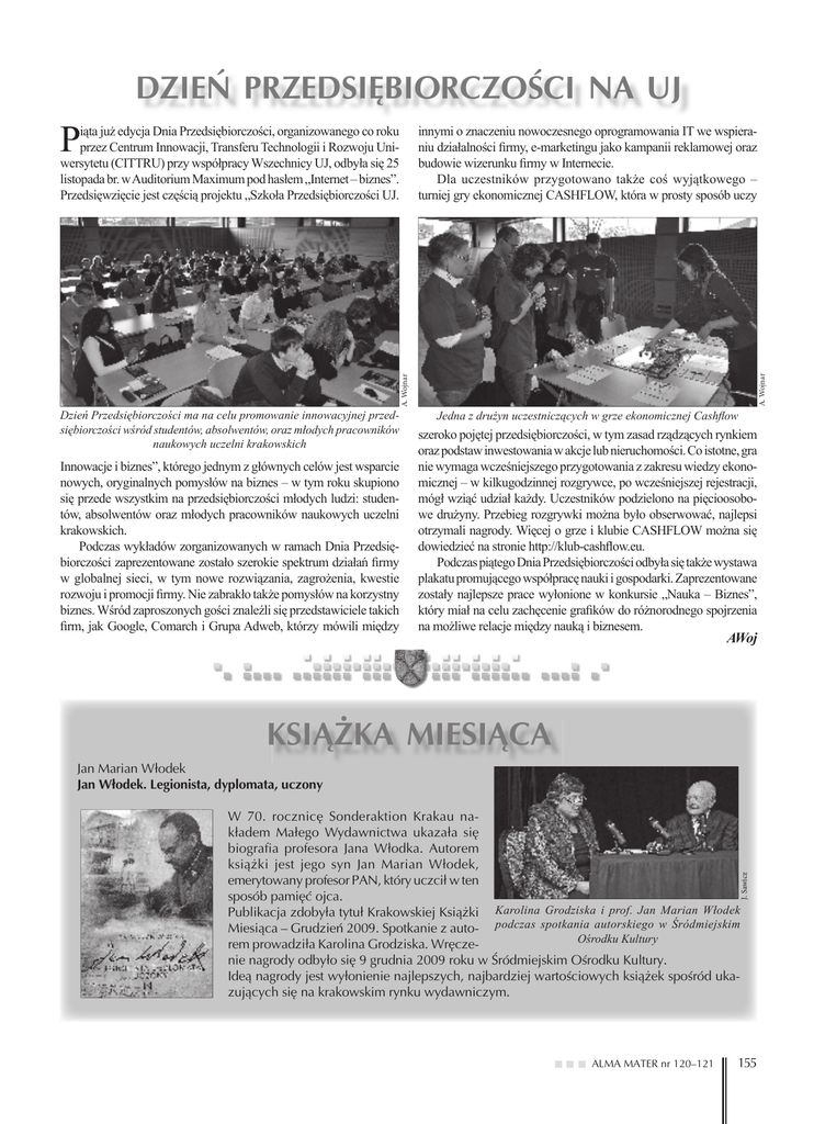 DZIEŃ PRZEDSIĘBIORCZOŚCI NA UJ P A. Wojnar innymi o znaczeniu nowoczesnego oprogramowania IT we wspieraniu działalności firmy, e-marketingu jako kampanii reklamowej oraz budowie wizerunku firmy w Internecie. Dla uczestników przygotowano także coś wyjątkowego – turniej gry ekonomicznej CASHFLOW, która w prosty sposób uczy A. Wojnar iąta już edycja Dnia Przedsiębiorczości, organizowanego co roku przez Centrum Innowacji, Transferu Technologii i Rozwoju Uniwersytetu (CITTRU) przy współpracy Wszechnicy UJ, odbyła się 25 listopada br. w Auditorium Maximum pod hasłem „Internet – biznes”. Przedsięwzięcie jest częścią projektu „Szkoła Przedsiębiorczości UJ. Dzień Przedsiębiorczości ma na celu promowanie innowacyjnej przedsiębiorczości wśród studentów, absolwentów, oraz młodych pracowników naukowych uczelni krakowskich Innowacje i biznes”, którego jednym z głównych celów jest wsparcie nowych, oryginalnych pomysłów na biznes – w tym roku skupiono się przede wszystkim na przedsiębiorczości młodych ludzi: studentów, absolwentów oraz młodych pracowników naukowych uczelni krakowskich. Podczas wykładów zorganizowanych w ramach Dnia Przedsiębiorczości zaprezentowane zostało szerokie spektrum działań firmy w globalnej sieci, w tym nowe rozwiązania, zagrożenia, kwestie rozwoju i promocji firmy. Nie zabrakło także pomysłów na korzystny biznes. Wśród zaproszonych gości znaleźli się przedstawiciele takich firm, jak Google, Comarch i Grupa Adweb, którzy mówili między Jedna z drużyn uczestniczących w grze ekonomicznej Cashflow szeroko pojętej przedsiębiorczości, w tym zasad rządzących rynkiem oraz podstaw inwestowania w akcje lub nieruchomości. Co istotne, gra nie wymaga wcześniejszego przygotowania z zakresu wiedzy ekonomicznej – w kilkugodzinnej rozgrywce, po wcześniejszej rejestracji, mógł wziąć udział każdy. Uczestników podzielono na pięcioosobowe drużyny. Przebieg rozgrywki można było obserwować, najlepsi otrzymali nagrody. Więcej o grze i klubie CASHFLOW można się dowiedzieć na stronie http://klub-cashflow.eu. Podczas piątego Dnia Przedsiębiorczości odbyła się także wystawa plakatu promującego współpracę nauki i gospodarki. Zaprezentowane zostały najlepsze prace wyłonione w konkursie „Nauka – Biznes”, który miał na celu zachęcenie grafików do różnorodnego spojrzenia na możliwe relacje między nauką i biznesem. AWoj KSIĄŻKA MIESIĄCA W 70. rocznicę Sonderaktion Krakau nakładem Małego Wydawnictwa ukazała się biografia profesora Jana Włodka. Autorem książki jest jego syn Jan Marian Włodek, emerytowany profesor PAN, który uczcił w ten sposób pamięć ojca. Publikacja zdobyła tytuł Krakowskiej Książki Karolina Grodziska i prof. Jan Marian Włodek Miesiąca – Grudzień 2009. Spotkanie z auto- podczas spotkania autorskiego w Śródmiejskim Ośrodku Kultury rem prowadziła Karolina Grodziska. Wręczenie nagrody odbyło się 9 grudnia 2009 roku w Śródmiejskim Ośrodku Kultury. Ideą nagrody jest wyłonienie najlepszych, najbardziej wartościowych książek spośród ukazujących się na krakowskim rynku wydawniczym. ALMA MATER nr 120–121 J. Sawicz Jan Marian Włodek Jan Włodek. Legionista, dyplomata, uczony 155