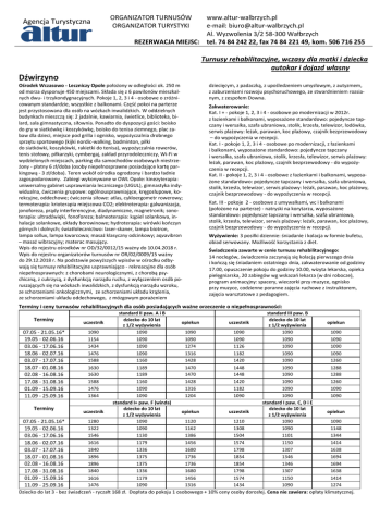 Agencja Turystyczna ORGANIZATOR TURNUSÓW ORGANIZATOR TURYSTYKI www.altur-walbrzych.pl e-mail: [email protected] Al. Wyzwolenia 3/2 58-300 Wałbrzych REZERWACJA MIEJSC: tel. 74 84 242 22, fax 74 84 221 49, kom. 506 716 255 Turnusy rehabilitacyjne, wczasy dla matki i dziecka autokar i dojazd własny Dźwirzyno Ośrodek Wczasowo - Leczniczy Opole położony w odległości ok. 250 m od morza dysponuje 450 miejscami. Składa się z 6 pawilonów mieszkalnych dwu- i trzykondygnacyjnych. Pokoje 1, 2, 3 i 4 - osobowe o zróżnicowanym standardzie, wszystkie z balkonami. Część pokoi na parterze jest przystosowana dla osób na wózkach inwalidzkich. W oddzielnych budynkach mieszczą się: 2 jadalnie, kawiarnia, świetlice, biblioteka, bilard, sala gimnastyczna, siłownia. Ponadto do dyspozycji gości: boisko do gry w siatkówkę i koszykówkę, boisko do tenisa ziemnego, plac zabaw dla dzieci, miejsce pod grilla i ognisko, wypożyczalnia drobnego sprzętu sportowego (kijki nordic-walking, badminton, piłki do siatkówki, koszykówki, rakietki do tenisa), wypożyczalnia rowerów, tenis stołowy, piłkarzyki, cymbergaj, zakład przyrodoleczniczy, Wi-Fi w wydzielonych miejscach, parking dla samochodów osobowych niestrzeżony - płatny 6 zł/doba (osoby niepełnosprawne posiadające kartę parkingową - 3 zł/doba). Teren wokół ośrodka ogrodzony i bardzo ładnie zagospodarowany. Zabiegi wykonywane w OWL Opole: kinezyterapia: uniwersalny gabinet usprawniania leczniczego (UGUL), gimnastyka indywidualna, ćwiczenia grupowe: ogólnousprawniające, kręgosłupowe, korekcyjne, oddechowe; ćwiczenia siłowe: atlas, cykloergometr rowerowy; termoterapia: krioterapia miejscowa CO2; elektroterapia: galwanizacja, jonoforeza, prądy interferencyjne, diadynamiczne, magnetronik; sonoterapia: ultradźwięki, fonoforeza; balneoterapia: kąpiel solankowa, inhalacje solankowe, okłady borowinowe; hydroterapia: wirówki kończyn górnych i dolnych; światłolecznictwo: laser-skaner, lampa biotron, lampa sollux, lampa kwarcowa; masaż klasyczny odcinkowy; aqvavibron – masaż wibracyjny; materac masujący. Wpis do rejestru ośrodków nr OD/32/0012/15 ważny do 10.04.2018 r. Wpis do rejestru organizatorów turnusów nr OR/02/0009/15 ważny do 29.12.2018 r. Na podstawie powyższych wpisów w ośrodku odbywają się turnusy rehabilitacyjne usprawniająco - rekreacyjne dla osób niepełnosprawnych: z chorobami neurologicznymi, z chorobą psychiczną, z cukrzycą, z dysfunkcją narządu ruchu, z wyłączeniem osób poruszających się na wózkach inwalidzkich, z dysfunkcją narządu wzroku, ze schorzeniami onkologicznymi, ze schorzeniami układu krążenia, ze schorzeniami układu oddechowego, z mózgowym porażeniem dziecięcym, z padaczką, z upośledzeniem umysłowym, z autyzmem, z zaburzeniami rozwoju psychoruchowego, ze stwardnieniem rozsianym, z zespołem Downa. Zakwaterowanie: Kat. I + - pokoje 1, 2, 3 i 4 - osobowe po modernizacji w 2012r. z łazienkami i balkonami, wyposażone standardowo: pojedyncze tapczany i wersalka, szafa ubraniowa, stolik, krzesła, telewizor, lodówka, serwis plażowy: leżak, parawan, koc plażowy, czajnik bezprzewodowy – do wypożyczenia w recepcji. Kat. I - pokoje 1, 2, 3 i 4 - osobowe po modernizacji, z łazienkami i balkonami, wyposażone standardowo: pojedyncze tapczany i wersalka, szafa ubraniowa, stolik, krzesła, telewizor, serwis plażowy: leżak, parawan, koc plażowy, czajnik bezprzewodowy - do wypożyczenia w recepcji. Kat. II - pokoje 1, 2, 3 i 4 - osobowe z łazienkami i balkonami, wyposażone standardowo: pojedyncze tapczany i wersalka, szafa ubraniowa, stolik, krzesła, telewizor, serwis plażowy: leżak, parawan, koc plażowy, czajnik bezprzewodowy - do wypożyczenia w recepcji. Kat. III - pokoje 2 - osobowe z umywalkami, wc i balkonami (położone na parterze) - natryski na korytarzu, wyposażone standardowo: pojedyncze tapczany i wersalka, szafa ubraniowa, stolik, krzesła, telewizor, serwis plażowy: leżak, parawan, koc plażowy, czajnik bezprzewodowy - do wypożyczenia w recepcji. Wyżywienie: 3 posiłki dziennie: śniadanie i kolacja w formie bufetu, obiad serwowany. Możliwość korzystania z diet. Świadczenia zawarte w cenie turnusu rehabilitacyjnego: 14 noclegów, świadczenia zaczynają się kolacją pierwszego dnia i kończą się śniadaniem ostatniego dnia, zakwaterowanie od godziny 17.00, opuszczenie pokoju do godziny 10.00, wizyta lekarska, opieka pielęgniarska, 20 zabiegów wg wskazań lekarza (w dni robocze), program animacyjny: spacery, wieczorki przy muzyce, ognisko przy muzyce, codzienne poranne zajęcia ruchowe z instruktorem, zajęcia warsztatowe z pedagogiem. Terminy i ceny turnusów rehabilitacyjnych dla osób posiadających ważne orzeczenie o niepełnosprawności: Terminy 07.05 - 21.05.16* 19.05 - 02.06.16 03.06 - 17.06.16 18.06 - 02.07.16 03.07 - 17.07.16 18.07 - 01.08.16 02.08 - 16.08.16 17.08 - 31.08.16 01.09 - 15.09.16 11.09 - 25.09.16 Terminy 07.05 - 21.05.16* 19.05 - 02.06.16 03.06 - 17.06.16 18.06 - 02.07.16 03.07 - 17.07.16 18.07 - 01.08.16 02.08 - 16.08.16 17.08 - 31.08.16 01.09 - 15.09.16 11.09 - 25.09.16 uczestnik 1090 1154 1434 1476 1588 1630 1630 1588 1476 1364 uczestnik 1280 1322 1546 1616 1840 1896 1896 1840 1616 1476 standard II paw. A i B dziecko do 10 lat z 1/2 wyżywienia 1090 1090 1090 1090 1160 1189 1189 1160 1090 1090 standard I+ paw. F (winda) dziecko do 10 lat z 1/2 wyżywienia 1090 1090 1130 1179 1336 1375 1375 1336 1179 1090 opiekun uczestnik 1090 1090 1274 1316 1428 1470 1470 1428 1316 1204 1090 1090 1126 1182 1420 1448 1448 1420 1182 1090 opiekun uczestnik 1120 1162 1386 1456 1680 1736 1736 1680 1456 1316 1210 1308 1504 1574 1798 1854 1854 1798 1574 1434 standard III paw. B dziecko do 10 lat z 1/2 wyżywienia 1090 1090 1090 1090 1090 1090 1090 1090 1090 1090 standard I paw. C, D i E dziecko do 10 lat z 1/2 wyżywienia 1090 1090 1101 1150 1307 1346 1346 1307 1150 1090 opiekun 1090 1090 1090 1090 1260 1288 1288 12