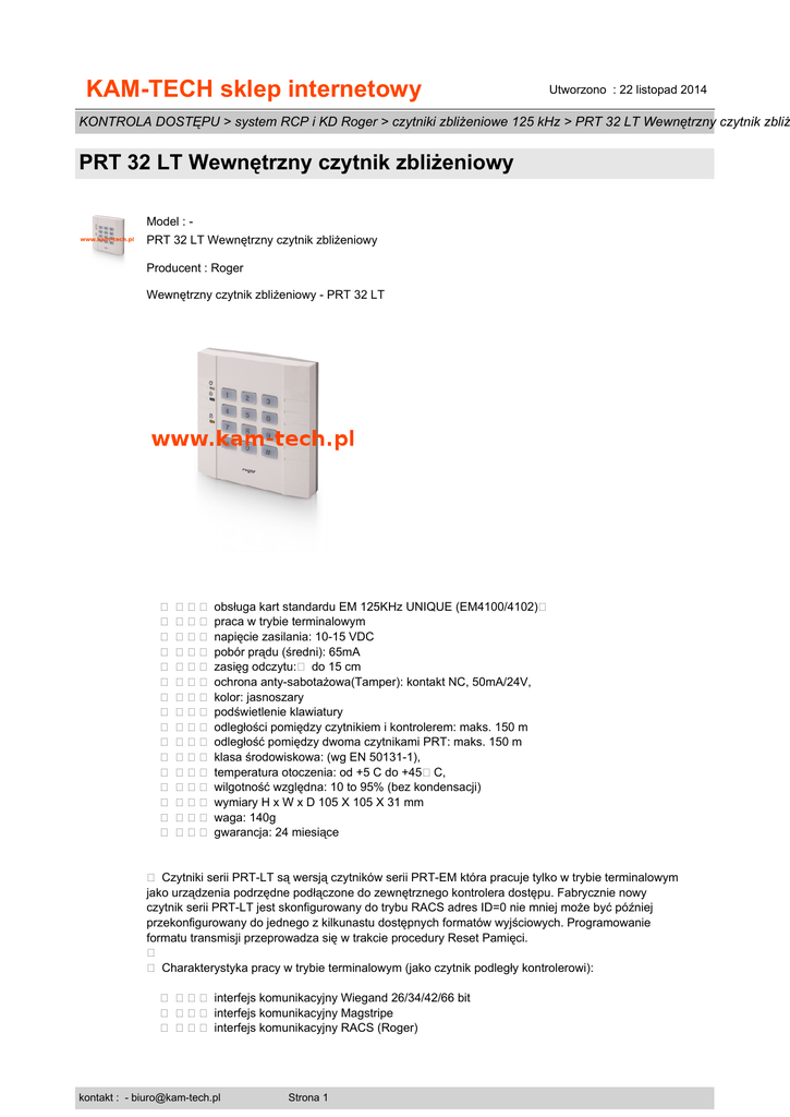 KAM-TECH sklep internetowy Utworzono : 22 listopad 2014 KONTROLA DOSTĘPU > system RCP i KD Roger > czytniki zbliżeniowe 125 kHz > PRT 32 LT Wewnętrzny czytnik zbliż PRT 32 LT Wewnętrzny czytnik zbliżeniowy Model : PRT 32 LT Wewnętrzny czytnik zbliżeniowy Producent : Roger Wewnętrzny czytnik zbliżeniowy - PRT 32 LT � ��� obsługa kart standardu EM 125KHz UNIQUE (EM4100/4102)� � ��� praca w trybie terminalowym � ��� napięcie zasilania: 10-15 VDC � ��� pobór prądu (średni): 65mA � ��� zasięg odczytu:� do 15 cm � ��� ochrona anty-sabotażowa(Tamper): kontakt NC, 50mA/24V, � ��� kolor: jasnoszary � ��� podświetlenie klawiatury � ��� odległości pomiędzy czytnikiem i kontrolerem: maks. 150 m � ��� odległość pomiędzy dwoma czytnikami PRT: maks. 150 m � ��� klasa środowiskowa: (wg EN 50131-1), � ��� temperatura otoczenia: od +5 C do +45�C, � ��� wilgotność względna: 10 to 95% (bez kondensacji) � ��� wymiary H x W x D 105 X 105 X 31 mm � ��� waga: 140g � ��� gwarancja: 24 miesiące � Czytniki serii PRT-LT są wersją czytników serii PRT-EM która pracuje tylko w trybie terminalowym jako urządzenia podrzędne podłączone do zewnętrznego kontrolera dostępu. Fabrycznie nowy czytnik serii PRT-LT jest skonfigurowany do trybu RACS adres ID=0 nie mniej może być później przekonfigurowany do jednego z kilkunastu dostępnych formatów wyjściowych. Programowanie formatu transmisji przeprowadza się w trakcie procedury Reset Pamięci. � � Charakterystyka pracy w trybie terminalowym (jako czytnik podległy kontrolerowi): � ��� interfejs komunikacyjny Wiegand 26/34/42/66 bit � ��� interfejs komunikacyjny Magstripe � ��� interfejs komunikacyjny RACS (Roger) kontakt : - [email protected] Strona 1 KAM-TECH sklep internetowy Utworzono : 22 listopad 2014 KONTROLA DOSTĘPU > system RCP i KD Roger > czytniki zbliżeniowe 125 kHz > PRT 32 LT Wewnętrzny czytnik zbliż PRT 32 LT Wewnętrzny czytnik zbliżeniowy � Wewnętrzny czytnik zbliżeniowy EM 125 kHz, zaciski śrubowe, silikonowa klawiatura z podświetleniem, możliwość samodzielnego przezbrojenia czytnika do wersji bez klawiatury. � Czytniki serii PRT-LT zostały zaprojektowane do stosowania w systemach kontroli dostępu opartych na identyfikatorach zbliżeniowych standardu EM 125 KHz oraz kodach PIN. Czytnik działa jako urządzenie podrzędne względem kontrolera dostępu i jego rola ogranicza się do odczytu numeru karty lub kodu PIN i przesłaniu odczytanych danych do kontrolera dostępu. � Czytniki PRT-LT zostały zaprojektowany do współpracy z kartami zbliżeniowymi standardu EM 125 KHz kompatybilnymi z układami EM 4100/4102. Czytnik przesyła numer karty bez bitów kontrolnych. Numer karty jest transmitowany od pozycji LSB do MSB i w zależności od wybranego formatu danych uzupełniany o wiodące zera lub redukowany na pozycjach MSB. � Czytniki PRT-LT oferują następujące formaty transmisji danych: � ��� Wiegand 26bit � ��� Wiegand 32bit, tryb normalny (od MSB do LSB) � ��� Wiegand 32bit, tryb rewersyjny (od LSB do MSB) � ��� Wiegand 34bit � ��� Wiegand 42bit � ��� Wiegand 66bit � ��� Magstripe (emulacja ABA Track II alternatywnie zwany Clock & Data) � ��� RACS adres ID0..3 (protokół adresowalny do współpracy z kontrolerami serii PR produkcji Roger) Cena : 201,72 zł Brutto ( 164,00 zł Netto) Dostępność: Produkt dostępny w naszym sklepie od 11 styczeń 2013 kontakt : - [email protected] Strona 2