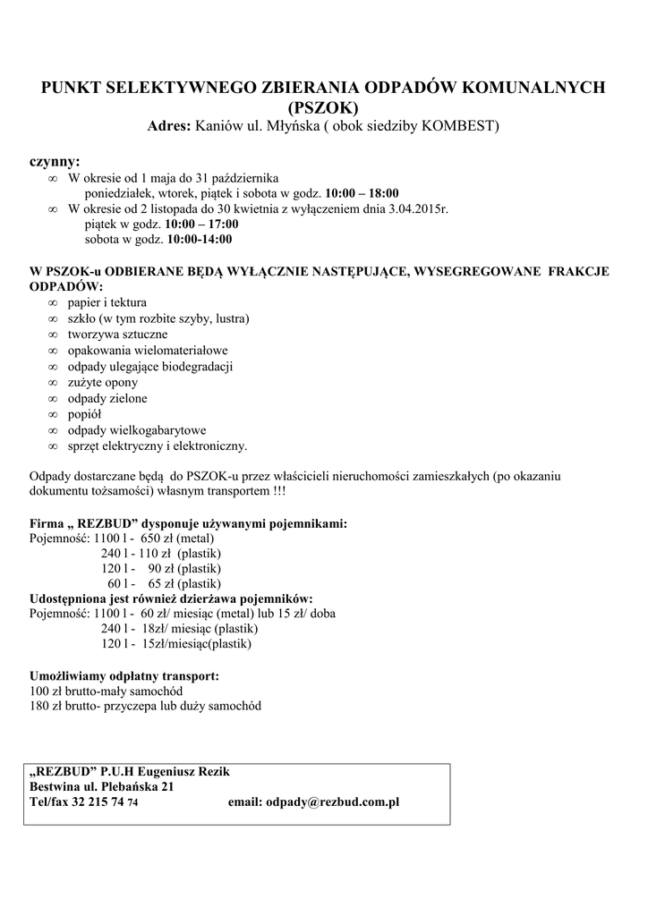 PUNKT SELEKTYWNEGO ZBIERANIA ODPADÓW KOMUNALNYCH (PSZOK) Adres: Kaniów ul. Młyńska ( obok siedziby KOMBEST) czynny: • • W okresie od 1 maja do 31 października poniedziałek, wtorek, piątek i sobota w godz. 10:00 – 18:00 W okresie od 2 listopada do 30 kwietnia z wyłączeniem dnia 3.04.2015r. piątek w godz. 10:00 – 17:00 sobota w godz. 10:00-14:00 W PSZOK-u ODBIERANE BĘDĄ WYŁĄCZNIE NASTĘPUJĄCE, WYSEGREGOWANE FRAKCJE ODPADÓW: • papier i tektura • szkło (w tym rozbite szyby, lustra) • tworzywa sztuczne • opakowania wielomateriałowe • odpady ulegające biodegradacji • zużyte opony • odpady zielone • popiół • odpady wielkogabarytowe • sprzęt elektryczny i elektroniczny. Odpady dostarczane będą do PSZOK-u przez właścicieli nieruchomości zamieszkałych (po okazaniu dokumentu tożsamości) własnym transportem !!! Firma „ REZBUD” dysponuje używanymi pojemnikami: Pojemność: 1100 l - 650 zł (metal) 240 l - 110 zł (plastik) 120 l - 90 zł (plastik) 60 l - 65 zł (plastik) Udostępniona jest również dzierżawa pojemników: Pojemność: 1100 l - 60 zł/ miesiąc (metal) lub 15 zł/ doba 240 l - 18zł/ miesiąc (plastik) 120 l - 15zł/miesiąc(plastik) Umożliwiamy odpłatny transport: 100 zł brutto-mały samochód 180 zł brutto- przyczepa lub duży samochód „REZBUD” P.U.H Eugeniusz Rezik Bestwina ul. Plebańska 21 Tel/fax 32 215 74 74 email: [email protected]