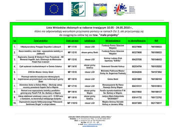 Lista Wniosków złożonych w naborze trwającym 10.05 - 24.05.2010 r., które nie odpowiadają warunkom przyznania pomocy w ramach Osi 3, ale przyczyniają się do osiągnięcia celów tej osi tzw. "małe projekty" Lp Tytuł projektu Znak sprawy Lokalizacja Wnioskodawca nr identyfikacyjny NIP 1. I Międzynarodowy Przegląd Zespołów Ludowych MP 1/1/10 obszar LGD Fundacja Pomoc Dzieciom Wiejskim 063279656 7661856523 2. Nasza świetlica, nasz klub - wyposażenie świetlicy w Jabłkowie MP 1/2/10 obszar gminy Skoki Fundacja Pomoc Dzieciom Wiejskim 063279656 7661856523 3. Regionalne Zawody W Skokach Przez Przeszkody - VIII Memoriał Angeliki Jach, Eliminacje do Mistrzostw Polski Koni 4-letnich MP 1/3/10 obszar LGD Gminny Ludowy Klub Sportowy "SOKÓŁ" 064257836 7661646435 4. Cykl wydarzeń środowiskowych w Gminie Gołańcz MP 1/4/10 obszar gminy Gołańcz Gołaniecki Ośrodek Kultury 062534704 7661639292 5. XVIII Dni Miasta i Gminy Skoki MP 1/5/10 obszar LGD Biblioteka Publiczna Miasta i Gminy Im. Eugeniusz Paukszty 063942836 7841973992 MP 1/6/10 obszar LGD Gmina Skoki 062619803 7661968104 Promocja walorów turystyczno-rekreacyjnych, 6. krajobrazowo-przyrodniczych oraz kulturowych gminy Skoki 7. Górnictwo Solne w Dolinie Wełny - Obchody setnej rocznicy powstania Kopalni Soli w Wapnie MP 1/7/10 obszar LGD Stowarzyszenie Na Rzecz Rozwoju Gminy Wapno 064318131 7661618812 8. Remont oraz wyposażenie świetlicy parafialnogminnej przy Parafii P.W. Św. Barbary w Wapnie MP 1/8/10 obszar gminy Wapno Parafia rzymsko-katolicka P.W. Św. Barbary w Wapnie. 064319042 7661580127 9. Zakup elektrowni wiatrowej o mocy od 5 - 12 KW wraz z montażem, na konstrukcji istniejącego budynku MP 1/9/10 obszar gminy Gołańcz Justyna Maria Kabacińska "EKOKABAT" 038141732 7661723762 10. Doposażenie zespołu folklorystycznego"Pałuczanie Sarbinowo Drugie" w stroje ludowe MP 1/10/10 obszar LGD Miejsko-Gminny Ośrodek Kultury w Janowcu Wlkp. 063073955 5621758517 LOKALNA GRUPA DZIAŁANIA Stowarzyszenie „Dolina Wełny” Siedziba: ul. Pl. Powstańców Wlkp. 13, 62-290 MIEŚCISKO Biuro: ul. Kolejowa 24, 62-100 WĄGROWIEC tel./fax: (67) 25 – 52 – 489 e-mail: [email protected] www.dolinawelny.eu Doposażenie Janowieckiej Orkiestry Dętej Im. Stanisława Rozmarynowskiego w instrumenty muzyczne MP 1/11/10 obszar LGD Miejsko-Gminny Ośrodek Kultury w Janowcu Wlkp. 063073955 5621758517 12. 13. Sala imprezowa z grillem typu "Chata Polska" MP 1/12/10 obszar LGD Małgorzata Ewa Bobrownicka 050519834 5271616164 Skwer zieleni wraz z placem zabaw i altanką MP 1/13/10 obszar LGD Małgorzata Ewa Bobrownicka 050519834 5271616164 14. Zagospodarowanie terenu Kościoła w Podlesiu Kościelnym- etap I-ogrodzenie MP 1/14/10 obszar gminy Mieścisko Parafia rzymsko-katolicka P.W. Św. Anny w Podlesiu Kościelnym. ------- ------- 15. Szkolenie-sprzedaż bezpośrednia produktów wytworzonych w gospodarstwie i produktów regionalnych MP 1/15/10 obszar LGD Stowarzyszenie Koło Gospodyń Wiejskich Mieścisko 064103810 7661960462 16. "Ocalmy od zapomnienia dawne zwyczaje i zawody naszych ojców-wycieczka edukacyjna dla dzieci i młodzieży" MP 1/16/10 obszar LGD Stowarzyszenie Koło Gospodyń Wiejskich Mieścisko 064103810 7661960462 17. Świetlica wiejska wsi Sarbia miejscem kultywowania starych zwyczajów i tradycji MP 1/17/10 obszar LGD Gmina Mieścisko 063106595 7661896008 18. do prowadzenia kursów językowych i innych szkoleń MP 1/18/10 obszar gminy Mieścisko Gmina Miescisko 063106595 7661896008 19. "W Popowie pachnie ziołami i wypiekami" MP 1/19/10 obszar gminy Mieścisko Gmina Mieścisko 063106595 7661896008 20. Wieś Kłodzin kultywuje stare tradycje i zwyczaje MP 1/20/10 obszar miejscowości Gmina Mieścisko 063106595 7661896008 21. Budowa placów zabaw we wsiach: Chojna, Konary, Laskownica Wielka, Czeszewo, Kujawki MP 1/21/10 obszar LGD Miasto i Gmina Gołańcz 063053583 7660014377 22. Zakup kompleksowego wyposażenia biwakowego mobilnego pola namiotowego, zorganizowanie konkursu fotograficznego na temat walorów przyrodniczych i rekreacyjnych Jeziora Kaliszańskiego oraz założenie strony internetowej Stowarzyszenia MP 1/22/10 obszar LGD Stowarzyszenie Przyjaciół Jeziora Kaliszańskiego W TRAKCIE OCZEKIWANIA NA NADANIE NUMERU 7661974866 23. Zakup wyposażenia komputerowego do świetlic wiejskich w Rgielsku i Pawłowie Żońskim MP 1/23/10 obszar gminy Wągrowiec Gminny Ośrodek Kultury w Wągrowcu z s. w Łeknie 062619570 7661015249 11. Wyposażenie świetlicy wiejskiej w Żabiczynie sprzęt LOKALNA GRUPA DZIAŁANIA Stowarzyszenie „Dolina Wełny” Siedziba: ul. Pl. Powstańców Wlkp. 13, 62-290 MIEŚCISKO Biuro: ul. Kolejowa 24, 62-100 WĄGROWIEC tel./fax: (67) 25 – 52 – 489 e-mail: [email protected] www.dolinawelny.eu 24. Zakup wyposażenia do Sali widowiskowej w Łeknie Zorganizowanie i wyposażenie obiektu małej 25. architektury turystyczno-rekreacyjnej w miejscowości Studzieniec Zorganizowanie i wyposażenie obiektu małej 26. architektury turystyczno-rekreacyjnej w miejscowości Ruda Zorganizowanie i wyposażenie obiektu małej 27. architektury turystyczno-rekreacyjnej w miejscowości Karolewo Zorganizowanie i wyposażenie obiektu małej 28. architektury turystyczno-rekreacyjnej w miejscowości Nienawiszcz Zorganizowanie i wyposażenie obiektu małej 29. architektury turystyczno-rekreacyjnej w miejscowości Cieśle Zorganizowanie i wyposażenie obiektu małej 30. architektury turystyczno-rekreacyjnej w miejscowości Jaracz Zorganizowanie i wyposażenie obiektu małej 31. architektury turystyczno-rekreacyjnej w miejscowości Pruśce MP 1/24/10 obszar LGD Gminny Ośrodek Kultury w Wągrowcu z s. w Łeknie 062619570 7661015249 MP 1/25/10 obszar miejscowości Gmina Rogoźno 063207942 6060066997 MP 1/26/10 obszar miejscowości Gmina Rogoźno 063207942 6060066997 MP 1/27/10 obszar miejscowości Gmina Rogoźno 063207942 6060066997 MP 1/28/10 obszar miejscowości Gmina Rogoźno 063207942 6060066997 MP 1/29/10 obsz