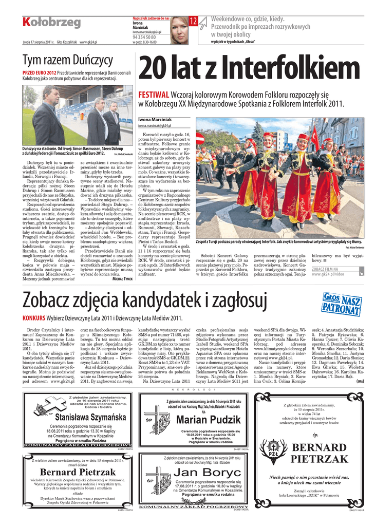 Napisz lub zadzwoń do nas Kołobrzeg Weekendowe co, gdzie, kiedy. Przewodnik po imprezach rozrywkowych w twojej okolicy 12 Iwona Marciniak [email protected] 94 354 50 80 w piątek w tygodnikach „Głosu” w godz. 8.30-16.00 środa 17 sierpnia 2011 r. Głos Koszaliński www.gk24.pl Tym razem Duńczycy PRZED EURO 2012 Przedstawiciele reprezentacji Danii oceniali Kołobrzeg jako centrum pobytowe dla ich reprezentacji. 20 lat z Interfolkiem FESTIWAL Wczoraj kolorowym Korowodem Folkloru rozpoczęły się w Kołobrzegu XX Międzynarodowe Spotkania z Folklorem Interfolk 2011. Iwona Marciniak [email protected] Duńczycy na stadionie. Od lewej: Simon Rasmussen, Steen Dahrup z duńskiej federacji i Tomasz Szulc ze spółki Euro 2012. Fot. Michał Świderski Duńczycy byli tu w poniedziałek. Wcześniej miasto odwiedzili przedstawiciele Irlandii, Norwegii i Francji. Reprezentujący duńską federację piłki nożnej Steen Dahrup i Simon Rasmussen przyjechali do nas ze Słupska, wcześniej wizytowali Gdańsk. Rozpoczęto od sprawdzenia stadionu. Gości interesowały zwłaszcza szatnie, dostęp do internetu, a także pojemność trybun, gdyż zapowiedzieli, że większość ich treningów byłaby otwarta dla publiczności. Pragnęli również dowiedzieć się, kiedy swoje mecze kończy kołobrzeska drużyna piłkarska, tak aby tylko oni mogli korzystać z obiektu. – Rozgrywki dobiegną końca w połowie maja – stwierdziła zastępca prezydenta Anna Mieczkowska. – Możemy jednak porozmawiać ze związkiem i ewentualnie przenieść mecze na inne terminy, gdyby było trzeba. Duńczycy wystawili pozytywne oceny stadionowi. Następnie udali się do Hotelu Marine, gdzie miałaby rezydować ich drużyna piłkarska. – To dobre miejsce dla nas – powiedział Stegn Dahrup. – Wprawdzie wolelibyśmy większą siłownię i salę do masażu, ale to drobne szczegóły, które możemy spokojnie poprawić. – Jesteśmy elastyczni – odpowiedział Jan Wróblewski, właściciel hotelu. – Bez problemu zaadoptujemy większą przestrzeń. Przedstawiciele Danii nie chcieli rozmawiać o szansach Kołobrzegu, gdyż nie zwiedzili wszystkich miast. Miejsce pobytowe reprezentacje muszą wybrać do końca roku. Korowód ruszył o godz. 16, potem był pierwszy koncert w amfiteatrze. Folkowe granie w międzynarodowym wydaniu będzie królować w Kołobrzegu aż do soboty, gdy festiwal zakończy uroczysty koncert galowy na plaży przy molo. Co ważne, wszystkie festiwalowe koncerty i towarzyszące im wydarzenia są bezpłatne. W tym roku na zaproszenie organizatorów z Regionalnego Centrum Kultury przyjechało do Kołobrzegu sześć zespołów folklorystycznych z zagranicy. Na scenie plenerowej RCK, w amfiteatrze i na plaży wystąpią reprezentacje: Izraela, Rumunii, Słowacji, Kazachstanu, Turcji i Francji. Gospodarzy reprezentuje Zespół Pieśni i Tańca Beskid. W środę i czwartek o godz. 11 i 16 rozpoczynać się będą koncerty na scenie plenerowej RCK. W środę, czwartek i piątek o godz. 19 Interfolkowych wykonawców gościć będzie amfiteatr. Zespół z Turcji podczas parady otwierającej Interfolk. Jak zwykle korowodowi artystów przyglądały się tłumy. Fot. Michał Świderski Sobotni Koncert Galowy rozpocznie się o godz. 20 na scenie plażowej przy molo. Poprzedzi go Korowód Folkloru, w którym goście Interfolku przemaszerują w stronę plażowej sceny przez dzielnicę uzdrowiskową. Koncert Galowy tradycyjnie zakończy pokaz sztucznych ogni. Ten ju- bileuszowy ma być wyjątkowy. d ZOBACZ FILM NA www.gk24.pl/video b MICHAŁ TYMEK Zobacz zdjęcia kandydatek i zagłosuj KONKURS Wybierz Dziewczynę Lata 2011 i Dziewczynę Lata Mediów 2011. Drodzy Czytelnicy i internauci! Zapraszamy do Konkursu na Dziewczynę Lata 2011 i Dziewczynę Mediów 2011. O oba tytuły ubiega się 17 kandydatek. Wszystkie panie biorące udział w naszym konkursie nadesłały nam swoje fotografie. Można je podziwiać na naszej stronie internetowej, pod adresem www.gk24.pl oraz na facebookowym funpage u Klimatycznego Kołobrzegu. Tu też można oddać na nie głosy. Specjalna aplikacja do 28 sierpnia będzie je podliczać i wskaże zwyciężczynię Konkusu – Dziewczynę Lata 2011. Już od dzisiejszego południa rozpoczyna się sms-owe głosowanie na Dziewczynę Mediów 2011. By zagłosować na swoją kandydatkę wystarczy wysłać SMS-a pod numer 71466, wpisując następującą treść: GK.DM.xx (gdzie xx to numer kandydatki z listy, którą publikujemy niżej. Oto przykładowa treść SMS-a: GK.DM.22. Koszt SMS-a to 1,23 zł z VAT. Przypominamy, sms-owe głosowanie potrwa do południa 26 sierpnia. Na Dziewczynę Lata 2011 N E K R czeka profesjonalna sesja zdjęciowa wykonana przez Studio Fotografii Artystycznej Izabell Studio, weekend SPA w pięciogwiazdkowym Hotelu Aquarius SPA oraz opłacona przez rok strona internetowa wraz z domeną przygotowaną i sponsorowaną przez Agencję Reklamową WebNext z Kołobrzegu. Nagrodą dla Dziewczyny Lata Mediów 2011 jest O L O G weekend SPA dla dwojga. Więcej informacji na Turystycznym Portalu Miasta Kołobrzeg, pod adresem www.klimatycznykolobrzeg.pl oraz na naszej stronie internetowej www.gk24.pl. Nasze kandydatki i przypisane im numery, które umieszczamy w treści SMS-a: 1. Monika Brysiak; 2. Karolina Ćwik; 3. Celina Kornija- szek; 4. Anastazja Studzińska; 5. Patrycja Ryżewska; 6. Hanna Tyszer; 7. Oliwia Kasperska; 8. Dominika Sobczak; 9. Weronika Szczerbała; 10. Monika Smołka; 11. Justyna Gromadzka; 12. Daria Słoniec; 13. Dagmara Pawełczyk; 14. Ewa Gliwka; 15. Wioletta Dąbrowska; 16. Karolina Kaczyńska; 17. Daria Bąk. (IMA) I 2443211K01A 2443111K01A 2440411K01A 2439511K01A 2445711K01A