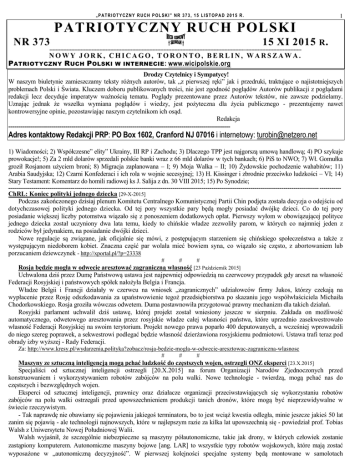 „PATRIOTYCZNY RUCH POLSKI” NR 373, 15 LISTOPAD 2015 R. 1 PATRIOTYCZNY RUCH POLSKI NR 373 15 XI 2015 R . ----------------------------------------------------------------------------------------------------------------------------------------------------------------- NOWY JORK, CHICAGO, TORONTO, BERLIN, WARSZAWA. P ATRIOTYCZNY R UCH P OLSKI W INTERNECIE : www.wicipolskie.org Drodzy Czytelnicy i Sympatycy! W naszym biuletynie zamieszczamy teksty różnych autorów, tak „z pierwszej ręki” jak i przedruki, traktujące o najistotniejszych problemach Polski i Świata. Kluczem doboru publikowanych treści, nie jest zgodność poglądów Autorów publikacji z poglądami redakcji lecz decyduje imperatyw ważnością tematu. Poglądy prezentowane przez Autorów tekstów, nie zawsze podzielamy. Uznając jednak że wszelka wymiana poglądów i wiedzy, jest pożyteczna dla życia publicznego - prezentujemy nawet kontrowersyjne opinie, pozostawiając naszym czytelnikom ich osąd. Redakcja ------------------------------------------------------------------------------------------------------------- Adres kontaktowy Redakcji PRP: PO Box 1602, Cranford NJ 07016 i internetowy: [email protected] 1) Wiadomości; 2) Współczesne” elity” Ukrainy, III RP i Zachodu; 3) Dlaczego TPP jest najgorszą umową handlową; 4) PO szykuje prowokacje!; 5) Za 2 mld dolarów sprzedali polskie banki wraz z 66 mld dolarów w tych bankach; 6) PiS to NWO; 7) Wł. Gomułka groził Rosjanom użyciem broni; 8) Migracja zaplanowana – I; 9) Moja Walka – II; 10) Żydowskie pochodzenie wahabitów; 11) Arabia Saudyjska; 12) Czarni Konfederaci i ich rola w wojnie secesyjnej; 13) H. Kissinger i zbrodnie przeciwko ludzkości – VI; 14) Stary Testament: Komentarz do homili radiowej ks J. Salija z dn. 30 VIII 2015; 15) Po Synodzie; --------------------------------------------------------------------------------------------------------------------------------------------------------------- ----------- ChRL: Koniec polityki jednego dziecka [29-X-2015] Podczas zakończonego dzisiaj plenum Komitetu Centralnego Komunistycznej Partii Chin podjęta została decyzja o odejściu od dotychczasowej polityki jednego dziecka. Od tej pory wszystkie pary będą mogły posiadać dwójkę dzieci. Co do tej pory posiadanie większej liczby potomstwa wiązało się z ponoszeniem dodatkowych opłat. Pierwszy wyłom w obowiązującej polityce jednego dziecka został uczyniony dwa lata temu, kiedy to chińskie władze zezwoliły parom, w których co najmniej jeden z rodziców był jedynakiem, na posiadanie dwójki dzieci. Nowe regulacje są związane, jak oficjalnie się mówi, z postępującym starzeniem się chińskiego społeczeństwa a także z występującym niedoborem kobiet. Znaczna część par wolała mieć bowiem syna, co wiązało się często, z abortowaniem lub porzucaniem dziewczynek - http://xportal.pl/?p=23338 # # # Rosja będzie mogła w odwecie aresztować zagraniczną własność [23 Październik 2015] Uchwalona dziś przez Dumę Państwową ustawa jest najpewniej odpowiedzią na czerwcowy przypadek gdy areszt na własność Federacji Rosyjskiej i państwowych spółek nałożyła Belgia i Francja. Władze Belgii i Francji działały w czerwcu na wniosek „zagranicznych” udziałowców firmy Jukos, którzy czekają na wypłacenie przez Rosję odszkodawania za upaństwowienie tegoż przedsiębiorstwa po skazaniu jego współwłaściciela Michaiła Chodorkowskiego. Rosja groziła wówczas odwetem. Duma postawnowiła przygotować prawny mechanizm dla takich działań. Rosyjski parlament uchwalił dziś ustawę, której projekt został wniesiony jeszcze w sierpniu. Zakłada on możliwość automatycznego, odwetowego aresztowania przez rosyjskie władze całej własności państwa, które uprzednio zasekwestrowało własność Federacji Rosyjskiej na swoim terytorium. Projekt nowego prawa poparło 400 deputowanych, a wcześniej wprowadzili do niego szereg poprawek, a sekwestrowi podlegać będzie własność dzierżawiona rosyjskiemu podmiotowi. Ustawa trafi teraz pod obrady izby wyższej - Rady Federacji. Za: http://www.kresy.pl/wydarzenia,polityka?zobacz/rosja-bedzie-mogla-w-odwecie-aresztowac-zagraniczna-wlasnosc # # # Maszyny ze sztuczną inteligencją mogą pchać ludzkość do częstszych wojen, ostrzegli ONZ eksperci [23.X.2015] Specjaliści od sztucznej inteligencji ostrzegli [20.X.2015] na forum Organizacji Narodów Zjednoczonych przed konstruowaniem i wykorzystywaniem robotów zabójców na polu walki. Nowe technologie - twierdzą, mogą pchać nas do częstszych i bezwzględnych wojen. Eksperci od sztucznej inteligencji, prawnicy oraz działacze organizacji przeciwstawiających się wykorzystaniu robotów zabójców na polu walki ostrzegali przed upowszechnieniem produkcji tanich dronów, które mogą być nieprzewidywalne w świecie rzeczywistym. - Tak naprawdę nie obawiamy się pojawienia jakiegoś terminatora, bo to jest wciąż kwestia odległa, minie jeszcze jakieś 50 lat zanim się pojawią - ale technologii najnowszych, które w najlepszym razie za kilka lat upowszechnią się - powiedział prof. Tobias Walsh z Uniwersytetu Nowej Południowej Walii. Walsh wyjaśnił, że szczególnie niebezpieczne są maszyny półautonomiczne, takie jak drony, w których człowiek zostanie zastąpiony komputerem. Autonomiczne maszyny bojowe [ang. LAR] to wszystkie typy robotów wojskowych, które mają zostać wyposażone w „autonomiczną decyzyjność”. W pierwszej kolejności specjalne systemy będą montowane w samolotach 2 „PATRIOTYCZNY RUCH POLSKI” NR 373, 15 LISTOPAD 2015 R. bezzałogowych. Odpowiednio zaprogramowane drony mają samodzielnie podejmować decyzje dotyczące wyboru celów i użycia broni, np. rakiet. Jak na razie - maszyny te pozostają pod kontrolą ludzi. Naukowcy ostrzegają, że drony nie sprawdzą się w tzw. konfliktach asymetrycznych w których operacje zbrojne będą prowadzone przeciwko ma