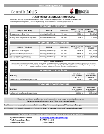 www.nadajwgazecie.pl Cennik 2015 OLSZTYŃSKI CENNIK NEKROLOGÓW OFERTA PREMIUM - NEKROLOGI OFERTA PODST. - NEKROLOGI Podstawą wyceny ogłoszenia jest jedna linia. Cennik obowiązuje od 01.02.2015 r. do odwołania. Publikacja nekrologów w „Gazecie Wyborczej” oraz w serwisie nekrologi.wyborcza.pl WYDANIE OLSZTYŃSKIE MIEJSCE PUBLIKACJI RODZAJ SZEROKOŚĆ CENA ZA 1 LINIĘ NETTO CENA ZA 1 LINIĘ BRUTTO 2-ga strona redakcyjna nekrologi/kondolencje 95 mm 20,20 zł 24,85 zł strony nekrologowe olsztyńskie nekrologi/kondolencje 80 mm 6,00 zł 7,38 zł CENA ZA 1 LINIĘ NETTO CENA ZA 1 LINIĘ BRUTTO WYDANIE OGÓLNOPOLSKIE MIEJSCE PUBLIKACJI RODZAJ SZEROKOŚĆ 2-ga strona redakcyjna nekrologi/kondolencje 95 mm 132,00 zł 162,36 zł pozostałe strony redakcyjne nekrologi/kondolencje 95 mm 84,00 zł 103,32 zł strony nekrologowe KRAJ nekrologi/kondolencje 80 mm 30,00 zł 36,90 zł OFERTA PREMIUM OBEJMUJE: publikację nekrologu/kondolencji w Gazecie Wyborczej w wydaniu papierowym + publikację nekrologu/kondolencji w Internecie na stronie www.nekrologi.wyborcza.pl oraz wyróżnienie przez 7 dni + skróconą wersję nekrologu/kondolencji, która przez 7 dni będzie ukazywała się w jednym z serwisów lokalnych prowadzonych przez Wydawcę Gazety Wyborczej WYDANIE OLSZTYŃSKIE DOPŁATA DO OFERTY PODST. NETTO RODZAJ nekrologi-kondolencje premium 90,00 zł DOPŁATA DO OFERTY PODST. BRUTTO 110,70 zł WYDANIE OGÓLNOPOLSKIE DOPŁATA DO OFERTY PODST. NETTO RODZAJ nekrologi-kondolencje premium 380,00 zł Elementy graficzne możliwe do zamieszczenia w nekrologu przedstawione są na: http://www.nadajwgazecie.pl/Nekrologi-kondolencje Przykładowe wzory nekrologów znajdziecie Państwo na : http://www.nadajwgazecie.pl/Przyklady-nekrologow Przykładowe wzory kondolencji znajdziecie Państwo na : http://www.nadajwgazecie.pl/Przyklady-kondolencji Na Państwa pytania odpowie oraz dokona wyceny nekrologu/kondolencji: * poprzez email na adres * telefonicznie pod nr: * wysyłając faks: [email protected] 71/789-44-02 71/724-20-85 DOPŁATA DO OFERTY PODST. BRUTTO 467,40 zł