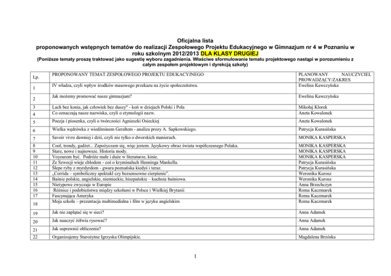 Oficjalna lista proponowanych wstępnych tematów do realizacji Zespołowego Projektu Edukacyjnego w Gimnazjum nr 4 w Poznaniu w roku szkolnym 2012/2013 DLA KLASY DRUGIEJ (Poniższe tematy proszę traktować jako sugestię wyboru zagadnienia. Właściwe sformułowanie tematu projektowego nastąpi w porozumieniu z całym zespołem projektowym i dyrekcją szkoły) IV władza, czyli wpływ środków masowego przekazu na życie społeczeństwa. PLANOWANY NAUCZYCIEL PROWADZĄCY/ZAKRES Ewelina Kawczyńska Jak możemy promować nasze gimnazjum? Ewelina Kawczyńska 3 4 Lach bez konia, jak człowiek bez duszy" - koń w dziejach Polski i Pola Co oznaczają nasze nazwiska, czyli o etymologii nazw. Mikołaj Klorek Aneta Kowalonek 5 Poezja i piosenka, czyli o twórczości Agnieszki Osieckiej Aneta Kowalonek 6 Wielka wędrówka z wiedźminem Geraltem - analiza prozy A. Sapkowskiego. Patrycja Kurasińska 7 8 9 10 11 12 13 14 15 16 17 Savoir vivre dawniej i dziś, czyli nie tylko o dworskich manierach. MONIKA KASPERSKA Cool, trendy, gadżet... Zapożyczam się, więc jestem. Językowy obraz świata współczesnego Polaka. Stare, nowe i najnowsze. Historia mody. Voyeurem być. Podróże małe i duże w literaturze, kinie. Ze Szwecji wieje chłodem - coś o kryminałach Henninga Mankella. Ślepe ryby z myrdyrdom - gwara poznańska kiedyś i teraz. „Corrida – symboliczny spektakl czy bezsensowne cierpienie”. Baśnie polskie, angielskie, niemieckie, hiszpańskie – kuchnia baśniowa. Nietypowe zwyczaje w Europie Różnice i podobieństwa między szkołami w Polsce i Wielkiej Brytanii Fascynująca Ameryka Moja szkoła – prezentacja multimedialna i film w języku angielskim MONIKA KASPERSKA MONIKA KASPERSKA MONIKA KASPERSKA Patrycja Kurasińska Patrycja Kurasińska Weronika Kurosz Weronika Kurosz Anna Brzechczyn Roma Kaczmarek Roma Kaczmarek Roma Kaczmarek 19 Jak nie zaplątać się w sieci? Anna Adamek 20 Jak nauczyć żółwia rysować? Anna Adamek 21 22 Jak usprawnić obliczenia? Anna Adamek Organizujemy Starożytne Igrzyska Olimpijskie. Magdalena Brzóska Lp. 1 2 18 PROPONOWANY TEMAT ZESPOŁOWEGO PROJEKTU EDUKACYJNEGO 1 23 24 25 26 27 28 29 30 31 32 33 34 35 36 37 38 39 40 41 42 Jak taniec wpływa na nasze życie? Izabella Kudzinowska Zdrowa żywność w naszym życiu – sałatkowy raj. Dzień sałatek. Alicja Rodak-Turowska Czy znacie ludolfinę? Trzymaj formę. Aktywność fizyczna na co dzień. Iwona Paszyn Zbigniew Rachwalski Badanie wpływu wybranych czynników na rozwój roślin. Woda – niezwykła substancja. Jaki jest stan wody w naszym mieście? Kolorowy świat chemii. Kwasy wokół nas. Wędrujemy przez pustynie. Groźna atmosfera. Mieszkam w bezpiecznym domu. Przemiany energii w przyrodzie i technice. Jakie są własności wielościanów foremnych? Liczby Fibonacciego w przyrodzie. Kiedy w życiu przydaje się matematyka? Urządzenia hydrauliczne – zasada działania i praktyczne wykorzystanie w technice i życiu codziennym. Jak liczylibyśmy, mając cztery palce u rąk? Proporcje w matematyce i wokół nas. Czy znacie ludolfinę? Justyna Dończyk Justyna Dończyk Beata Widerska Beata Widerska Beata Widerska Karolina Ciosek Karolina Ciosek Grzegorz Tomczak Paweł Staniszewski Klaudia Mroczek Klaudia Mroczek Klaudia Mroczek Paweł Staniszewski Dorota Dolatkowska Dorota Dolatkowska Iwona Paszyn 2