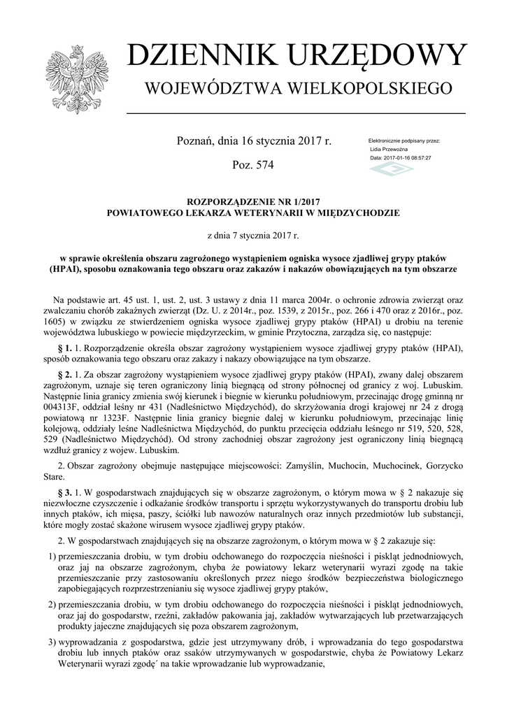 DZIENNIK URZĘDOWY WOJEWÓDZTWA WIELKOPOLSKIEGO Poznań, dnia 16 stycznia 2017 r. Elektronicznie podpisany przez: Lidia Przewoźna Poz. 574 Data: 2017-01-16 08:57:27 ROZPORZĄDZENIE NR 1/2017 POWIATOWEGO LEKARZA WETERYNARII W MIĘDZYCHODZIE z dnia 7 stycznia 2017 r. w sprawie określenia obszaru zagrożonego wystąpieniem ogniska wysoce zjadliwej grypy ptaków (HPAI), sposobu oznakowania tego obszaru oraz zakazów i nakazów obowiązujących na tym obszarze Na podstawie art. 45 ust. 1, ust. 2, ust. 3 ustawy z dnia 11 marca 2004r. o ochronie zdrowia zwierząt oraz zwalczaniu chorób zakaźnych zwierząt (Dz. U. z 2014r., poz. 1539, z 2015r., poz. 266 i 470 oraz z 2016r., poz. 1605) w związku ze stwierdzeniem ogniska wysoce zjadliwej grypy ptaków (HPAI) u drobiu na terenie województwa lubuskiego w powiecie międzyrzeckim, w gminie Przytoczna, zarządza się, co następuje: § 1. 1. Rozporządzenie określa obszar zagrożony wystąpieniem wysoce zjadliwej grypy ptaków (HPAI), sposób oznakowania tego obszaru oraz zakazy i nakazy obowiązujące na tym obszarze. § 2. 1. Za obszar zagrożony wystąpieniem wysoce zjadliwej grypy ptaków (HPAI), zwany dalej obszarem zagrożonym, uznaje się teren ograniczony linią biegnącą od strony północnej od granicy z woj. Lubuskim. Następnie linia granicy zmienia swój kierunek i biegnie w kierunku południowym, przecinając drogę gminną nr 004313F, oddział leśny nr 431 (Nadleśnictwo Międzychód), do skrzyżowania drogi krajowej nr 24 z drogą powiatową nr 1323F. Następnie linia granicy biegnie dalej w kierunku południowym, przecinając linię kolejową, oddziały leśne Nadleśnictwa Międzychód, do punktu przecięcia oddziału leśnego nr 519, 520, 528, 529 (Nadleśnictwo Międzychód). Od strony zachodniej obszar zagrożony jest ograniczony linią biegnącą wzdłuż granicy z wojew. Lubuskim. 2. Obszar zagrożony obejmuje następujące miejscowości: Zamyślin, Muchocin, Muchocinek, Gorzycko Stare. § 3. 1. W gospodarstwach znajdujących się w obszarze zagrożonym, o którym mowa w § 2 nakazuje się niezwłoczne czyszczenie i odkażanie środków transportu i sprzętu wykorzystywanych do transportu drobiu lub innych ptaków, ich mięsa, paszy, ściółki lub nawozów naturalnych oraz innych przedmiotów lub substancji, które mogły zostać skażone wirusem wysoce zjadliwej grypy ptaków. 2. W gospodarstwach znajdujących się na obszarze zagrożonym, o którym mowa w § 2 zakazuje się: 1) przemieszczania drobiu, w tym drobiu odchowanego do rozpoczęcia nieśności i piskląt jednodniowych, oraz jaj na obszarze zagrożonym, chyba że powiatowy lekarz weterynarii wyrazi zgodę na takie przemieszczanie przy zastosowaniu określonych przez niego środków bezpieczeństwa biologicznego zapobiegających rozprzestrzenianiu się wysoce zjadliwej grypy ptaków, 2) przemieszczania drobiu, w tym drobiu odchowanego do rozpoczęcia nieśności i piskląt jednodniowych, oraz jaj do gospodarstw, rzeźni, zakładów pakowania jaj, zakładów wytwarzających lub przetwarzających produkty jajeczne znajdujących się poza obszarem zagrożonym, 3) wyprowadzania z gospodarstwa, gdzie jest utrzymywany drób, i wprowadzania do tego gospodarstwa drobiu lub innych ptaków oraz ssaków utrzymywanych w gospodarstwie, chyba że Powiatowy Lekarz Weterynarii wyrazi zgodę´ na takie wprowadzanie lub wyprowadzanie, Dziennik Urzędowy Województwa Wielkopolskiego –2– Poz. 574 4) wywożenia lub rozrzucania ściółki lub nawozów naturalnych, chyba że Powiatowy Lekarz Weterynarii wyrazi zgodę na takie wywożenie lub rozrzucanie, 5) organizowania targów, wystaw, pokazów lub konkursów, gdzie są gromadzone drób lub inne ptaki oraz polowań i odłowów ptactwa dzikiego, 6) targowiskowej sprzedaży drobiu, mięsa drobiowego, mięsa ptaków łownych oraz jaj konsumpcyjnych. § 4. 1. Nakazuje się oznakowanie obszaru zagrożonego, o którym mowa w §2, poprzez ustawienie na zewnętrznej granicy obszaru tablic ostrzegawczych o następującej treści: „GRYPA PTAKÓW – OBSZAR ZAGROŻONY. WPROWADZANIE I WYPROWADZANIE ZWIERZĄT WZBRONIONE ”, zgodnie ze wzorem określonym w załączniku do niniejszego rozporządzenia. 2. Tablica i napisy na niej ma mieć takie wymiary, aby była czytelna z odległości co najmniej 100 metrów. 3. Tablice należy umieścić na drogach publicznych i prywatnych. § 5. Nakazy i zakazy, o których mowa w § 3 obowiązują, do momentu ich odwołania, wszystkich mieszkańców oraz osoby przebywające czasowo na obszarach, o których mowa w § 2. § 6. Wykonanie rozporządzenia powierza Staroście międzychodzkiemu, Burmistrzowi Policji w Międzychodzie, , Państwowemu właściwym terytorialnie nadleśnictwom i w Poznaniu. się: Powiatowemu Lekarzowi Weterynarii w Międzychodzie, Miasta i Gminy Międzychód, Komendantowi Powiatowemu Powiatowemu Inspektorowi Sanitarnemu w Międzychodzie, Zarządowi Okręgowemu Polskiego Związku Łowieckiego § 7. Rozporządzenie wchodzi w życie z dniem podania do wiadomości publicznej w sposób zwyczajowo przyjęty na danym terenie i podlega ogłoszeniu w Dzienniku Urzędowym Województwa Wielkopolskiego. Powiatowy Lekarz Weterynarii (-) Andrzej Saternus Dziennik Urzędowy Województwa Wielkopolskiego –3– Poz. 574