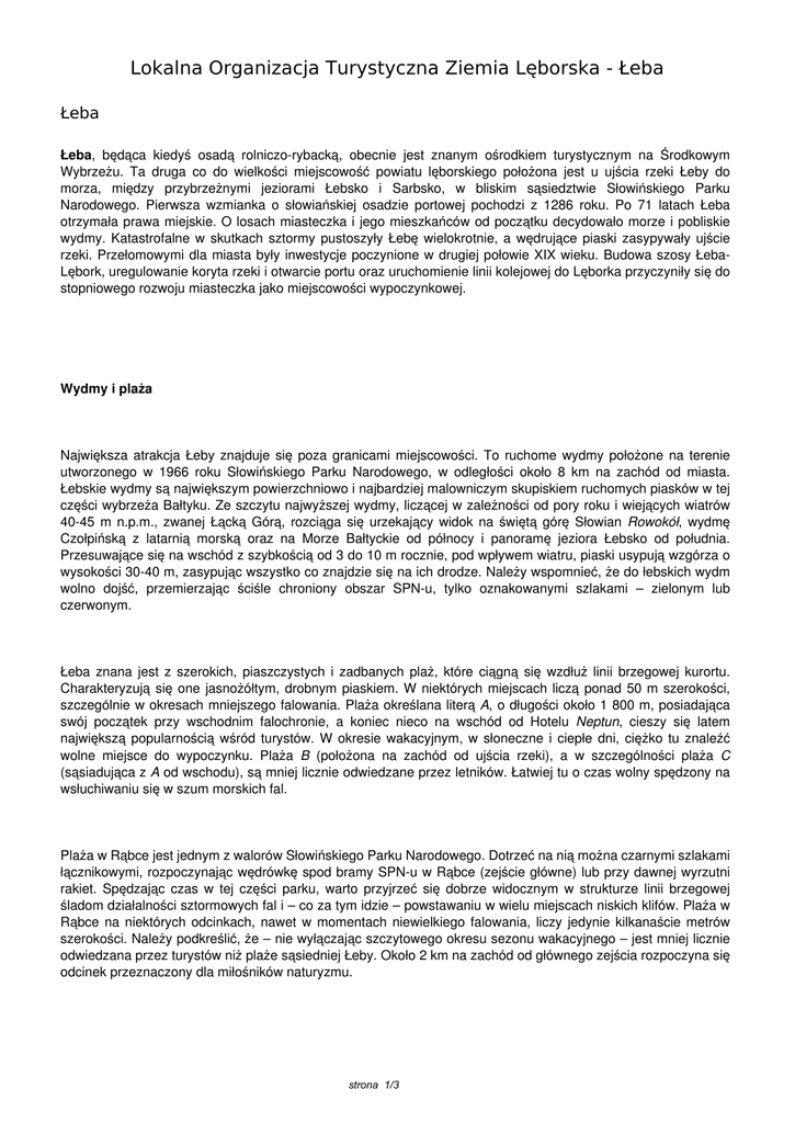 Lokalna Organizacja Turystyczna Ziemia Lęborska - Łeba Łeba Łeba, będąca kiedyś osadą rolniczo-rybacką, obecnie jest znanym ośrodkiem turystycznym na Środkowym Wybrzeżu. Ta druga co do wielkości miejscowość powiatu lęborskiego położona jest u ujścia rzeki Łeby do morza, między przybrzeżnymi jeziorami Łebsko i Sarbsko, w bliskim sąsiedztwie Słowińskiego Parku Narodowego. Pierwsza wzmianka o słowiańskiej osadzie portowej pochodzi z 1286 roku. Po 71 latach Łeba otrzymała prawa miejskie. O losach miasteczka i jego mieszkańców od początku decydowało morze i pobliskie wydmy. Katastrofalne w skutkach sztormy pustoszyły Łebę wielokrotnie, a wędrujące piaski zasypywały ujście rzeki. Przełomowymi dla miasta były inwestycje poczynione w drugiej połowie XIX wieku. Budowa szosy ŁebaLębork, uregulowanie koryta rzeki i otwarcie portu oraz uruchomienie linii kolejowej do Lęborka przyczyniły się do stopniowego rozwoju miasteczka jako miejscowości wypoczynkowej. Wydmy i plaża Największa atrakcja Łeby znajduje się poza granicami miejscowości. To ruchome wydmy położone na terenie utworzonego w 1966 roku Słowińskiego Parku Narodowego, w odległości około 8 km na zachód od miasta. Łebskie wydmy są największym powierzchniowo i najbardziej malowniczym skupiskiem ruchomych piasków w tej części wybrzeża Bałtyku. Ze szczytu najwyższej wydmy, liczącej w zależności od pory roku i wiejących wiatrów 40-45 m n.p.m., zwanej Łącką Górą, rozciąga się urzekający widok na świętą górę Słowian Rowokół, wydmę Czołpińską z latarnią morską oraz na Morze Bałtyckie od północy i panoramę jeziora Łebsko od południa. Przesuwające się na wschód z szybkością od 3 do 10 m rocznie, pod wpływem wiatru, piaski usypują wzgórza o wysokości 30-40 m, zasypując wszystko co znajdzie się na ich drodze. Należy wspomnieć, że do łebskich wydm wolno dojść, przemierzając ściśle chroniony obszar SPN-u, tylko oznakowanymi szlakami – zielonym lub czerwonym. Łeba znana jest z szerokich, piaszczystych i zadbanych plaż, które ciągną się wzdłuż linii brzegowej kurortu. Charakteryzują się one jasnożółtym, drobnym piaskiem. W niektórych miejscach liczą ponad 50 m szerokości, szczególnie w okresach mniejszego falowania. Plaża określana literą A, o długości około 1 800 m, posiadająca swój początek przy wschodnim falochronie, a koniec nieco na wschód od Hotelu Neptun, cieszy się latem największą popularnością wśród turystów. W okresie wakacyjnym, w słoneczne i ciepłe dni, ciężko tu znaleźć wolne miejsce do wypoczynku. Plaża B (położona na zachód od ujścia rzeki), a w szczególności plaża C (sąsiadująca z A od wschodu), są mniej licznie odwiedzane przez letników. Łatwiej tu o czas wolny spędzony na wsłuchiwaniu się w szum morskich fal. Plaża w Rąbce jest jednym z walorów Słowińskiego Parku Narodowego. Dotrzeć na nią można czarnymi szlakami łącznikowymi, rozpoczynając wędrówkę spod bramy SPN-u w Rąbce (zejście główne) lub przy dawnej wyrzutni rakiet. Spędzając czas w tej części parku, warto przyjrzeć się dobrze widocznym w strukturze linii brzegowej śladom działalności sztormowych fal i – co za tym idzie – powstawaniu w wielu miejscach niskich klifów. Plaża w Rąbce na niektórych odcinkach, nawet w momentach niewielkiego falowania, liczy jedynie kilkanaście metrów szerokości. Należy podkreślić, że – nie wyłączając szczytowego okresu sezonu wakacyjnego – jest mniej licznie odwiedzana przez turystów niż plaże sąsiedniej Łeby. Około 2 km na zachód od głównego zejścia rozpoczyna się odcinek przeznaczony dla miłośników naturyzmu. strona 1/3 Hotel Neptun Dawny Dom Kuracyjny (Kurhaus), obecnie Hotel Neptun, został wzniesiony na szczycie wydmy górującej nad plażą w latach 1906-07 przez barona Herberta von Massow. Uroczyste otwarcie obiektu miało miejsce 23 września 1907 roku. W okresie międzywojennym Kurhaus stanowił rokrocznie w sezonie letnim centrum życia towarzyskiego Łeby. W jego progach gościli niejednokrotnie ludzie z pierwszych stron gazet. Latem 1936 roku w obiekcie zatrzymał się zawodowy bokser, mistrz świata wszechwag – Max Schmeling. Po zakończeniu drugiej wojny światowej i upaństwowieniu Kurhausu budynek pełnił kolejno funkcję: Profilaktycznego Domu Zdrowia, ośrodka Funduszu Wczasów Pracowniczych, a od lat 80-tych ubiegłego stulecia obiektu hotelowego, stanowiącego własność spółki. Rybacki kościół pw. Wniebowstąpienia NMP Rybacką świątynię pw. Wniebowzięcia NMP zbudowano w roku 1683 w miejscu, gdzie stała wcześniej drewniana kaplica, która spłonęła 10 lipca 1682 roku. Nowy obiekt stawiali budowniczowie z Gdańska sprowadzeni przez ówczesnego kolatora łebskiego kościoła Nikolausa Ernsta von Natzmera. Budowę pierwszej wieży zakończono w 1685 roku, a kiedy 3 marca 1761 roku uległa ona zawaleniu, dwa lata później wzniesiono nową, która stoi do dzisiaj. Ciasne wnętrze kościoła zdobi m.in. barokowy ołtarzyk oraz obraz Maxa Pechsteina, jednego z przedstawicieli niemieckiego ekspresjonizmu, przedstawiający Matkę Boską Orędowniczkę stojącą na kuli ziemskiej, zanurzonej w morskich falach. Na przykościelnym placu znajduje się obelisk pojednania – granitowy głaz o wysokości 2 m upamiętniający mieszkańców Łeby i okolicznych wsi poległych w czasie pierwszej wojny światowej, a także ławka Pechsteina. Port rybacki Wyposażony w betonowe nabrzeża ujściowy odcinek rzeki Łeby oraz zamieniony na kanał portowy odcinek strumienia Chełst. W 1884 roku rozpoczęto prace hydrotechniczne przy ujściu rzeki. Uregulowano i umocniono jej brzegi, a także przekopano koryto dopływu Chełst, tworząc dodatkowy kanał portowy. Prace te pozwoliły otworzyć w 1890 roku bazę dla rybołówstwa dalekomorskiego. W latach 2004-05 teren portu został uporządkowany i prz