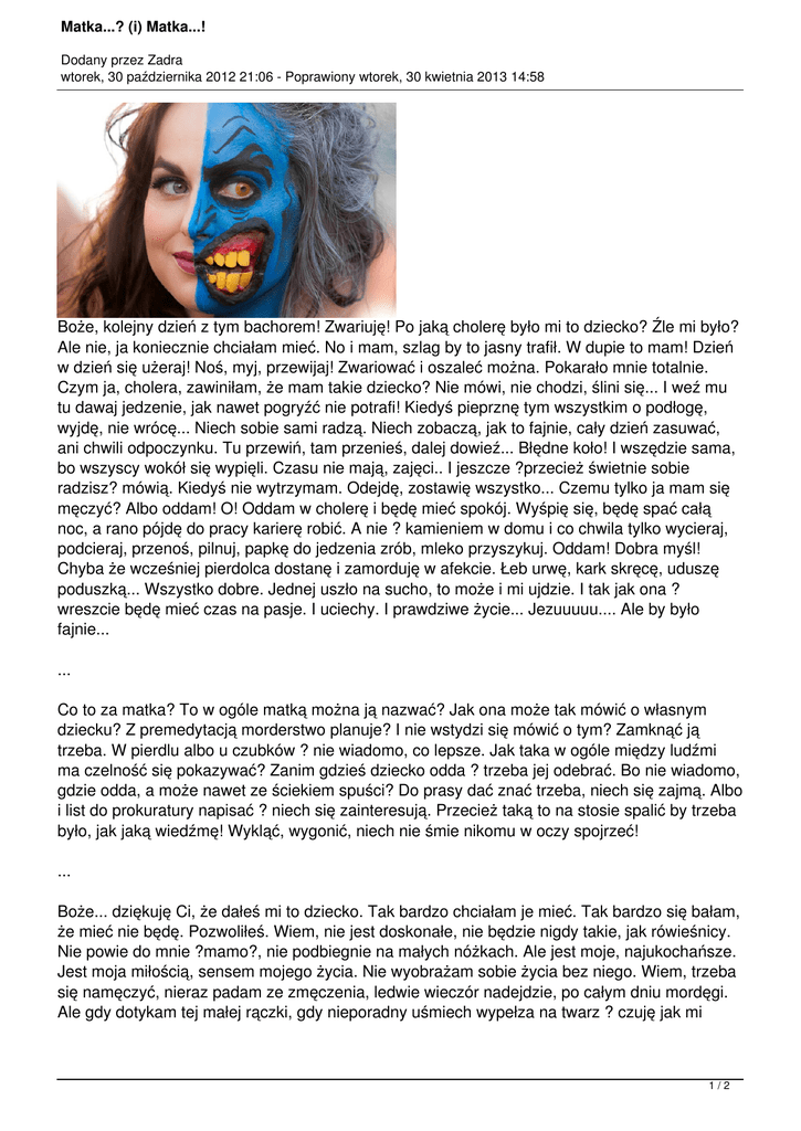 Matka...? (i) Matka...! Dodany przez Zadra wtorek, 30 października 2012 21:06 - Poprawiony wtorek, 30 kwietnia 2013 14:58 Boże, kolejny dzień z tym bachorem! Zwariuję! Po jaką cholerę było mi to dziecko? Źle mi było? Ale nie, ja koniecznie chciałam mieć. No i mam, szlag by to jasny trafił. W dupie to mam! Dzień w dzień się użeraj! Noś, myj, przewijaj! Zwariować i oszaleć można. Pokarało mnie totalnie. Czym ja, cholera, zawiniłam, że mam takie dziecko? Nie mówi, nie chodzi, ślini się... I weź mu tu dawaj jedzenie, jak nawet pogryźć nie potrafi! Kiedyś pieprznę tym wszystkim o podłogę, wyjdę, nie wrócę... Niech sobie sami radzą. Niech zobaczą, jak to fajnie, cały dzień zasuwać, ani chwili odpoczynku. Tu przewiń, tam przenieś, dalej dowieź... Błędne koło! I wszędzie sama, bo wszyscy wokół się wypięli. Czasu nie mają, zajęci.. I jeszcze ?przecież świetnie sobie radzisz? mówią. Kiedyś nie wytrzymam. Odejdę, zostawię wszystko... Czemu tylko ja mam się męczyć? Albo oddam! O! Oddam w cholerę i będę mieć spokój. Wyśpię się, będę spać całą noc, a rano pójdę do pracy karierę robić. A nie ? kamieniem w domu i co chwila tylko wycieraj, podcieraj, przenoś, pilnuj, papkę do jedzenia zrób, mleko przyszykuj. Oddam! Dobra myśl! Chyba że wcześniej pierdolca dostanę i zamorduję w afekcie. Łeb urwę, kark skręcę, uduszę poduszką... Wszystko dobre. Jednej uszło na sucho, to może i mi ujdzie. I tak jak ona ? wreszcie będę mieć czas na pasje. I uciechy. I prawdziwe życie... Jezuuuuu.... Ale by było fajnie... ... Co to za matka? To w ogóle matką można ją nazwać? Jak ona może tak mówić o własnym dziecku? Z premedytacją morderstwo planuje? I nie wstydzi się mówić o tym? Zamknąć ją trzeba. W pierdlu albo u czubków ? nie wiadomo, co lepsze. Jak taka w ogóle między ludźmi ma czelność się pokazywać? Zanim gdzieś dziecko odda ? trzeba jej odebrać. Bo nie wiadomo, gdzie odda, a może nawet ze ściekiem spuści? Do prasy dać znać trzeba, niech się zajmą. Albo i list do prokuratury napisać ? niech się zainteresują. Przecież taką to na stosie spalić by trzeba było, jak jaką wiedźmę! Wykląć, wygonić, niech nie śmie nikomu w oczy spojrzeć! ... Boże... dziękuję Ci, że dałeś mi to dziecko. Tak bardzo chciałam je mieć. Tak bardzo się bałam, że mieć nie będę. Pozwoliłeś. Wiem, nie jest doskonałe, nie będzie nigdy takie, jak rówieśnicy. Nie powie do mnie ?mamo?, nie podbiegnie na małych nóżkach. Ale jest moje, najukochańsze. Jest moja miłością, sensem mojego życia. Nie wyobrażam sobie życia bez niego. Wiem, trzeba się namęczyć, nieraz padam ze zmęczenia, ledwie wieczór nadejdzie, po całym dniu mordęgi. Ale gdy dotykam tej małej rączki, gdy nieporadny uśmiech wypełza na twarz ? czuję jak mi 1/2 Matka...? (i) Matka...! Dodany przez Zadra wtorek, 30 października 2012 21:06 - Poprawiony wtorek, 30 kwietnia 2013 14:58 serce rośnie i w środku tak bardzo, bardzo gorąco. To moje dziecko, moje szczęście i zrobię wszystko, by miało godne, spokojne życie. Nie, nie będę się skarżyć. Mam co mam, dam sobie radę. Czasem jest lżej, czasem ciężej, ale inni czasem mają gorzej. Aż boję się pomyśleć, co by było, gdybym nie miała dziecka. Ta pustka, ten smutek, braki w duszy... Dopiero teraz wiem, co znaczy miłość. I cokolwiek by się nie działo ? nie oddam, nie zostawię. Będę dbać i kochać, póki starczy mi sił. Nie wyobrażam sobie innego życia. Jeśli kiedykolwiek zabraknie dziecka ? zabraknie też i mnie. Nie będę umiała pozostać sama na tym świecie... Nigdy... Kocham... Całym sercem, cała duszą... Kocham... Moje cudowne maleństwo... ... Jaka wspaniała matka! Mimo przeciwności losu, ona się nie poddaje. Tak jej ciężko z tym dzieckiem, a ona kocha... i pozostaje przy nim, nie rezygnuje z walki o nie! Wspaniała kobieta. Za wzór można stawiać. Może by tak jakiej telewizji podpowiedzieć, żeby materiał o niej zrobili? Tak mało teraz prawdziwych, uczciwych, kochających ludzi na tym świecie! Ona się nadaje. Warto o niej opowiedzieć. Niech inni widzą, jak można kochać dziecko. I nie opuścić, mimo wszelkich przeciwieństw. Wspaniała! Prawdziwa matka! ? Ciekawe, czy wiedzą, że to jedna i ta sama kobieta...? Matka dziecka niepełnosprawnego... Kobieta... Człowiek... w swojej codziennej rzeczywistości... Rafał ?Zadra? Wieliczko 2/2