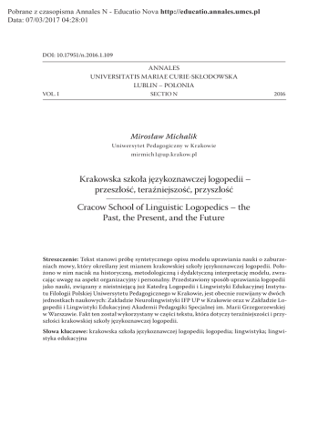 Pobrane z czasopisma Annales N - Educatio Nova http://educatio.annales.umcs.pl Data: 07/03/2017 04:28:01 DOI: 10.17951/n.2016.1.109 ANNALES UNIVERSITATIS MARIAE CURIE-SKŁODOWSKA LUBLIN – POLONIA VOL. I SECTIO N 2016 Mirosław Michalik Uniwersytet Pedagogiczny w Krakowie [email protected] M CS Krakowska szkoła językoznawczej logopedii – przeszłość, teraźniejszość, przyszłość U Cracow School of Linguistic Logopedics – the Past, the Present, and the Future Streszczenie: Tekst stanowi próbę syntetycznego opisu modelu uprawiania nauki o zaburzeniach mowy, który określany jest mianem krakowskiej szkoły językoznawczej logopedii. Położono w nim nacisk na historyczną, metodologiczną i dydaktyczną interpretację modelu, zwracając uwagę na aspekt organizacyjny i personalny. Przedstawiony sposób uprawiania logopedii jako nauki, związany z nieistniejącą już Katedrą Logopedii i Lingwistyki Edukacyjnej Instytutu Filologii Polskiej Uniwersytetu Pedagogicznego w Krakowie, jest obecnie rozwijany w dwóch jednostkach naukowych: Zakładzie Neurolingwistyki IFP UP w Krakowie oraz w Zakładzie Logopedii i Lingwistyki Edukacyjnej Akademii Pedagogiki Specjalnej im. Marii Grzegorzewskiej w Warszawie. Fakt ten został wykorzystany w części tekstu, która dotyczy teraźniejszości i przyszłości krakowskiej szkoły językoznawczej logopedii. Słowa kluczowe: krakowska szkoła językoznawczej logopedii; logopedia; lingwistyka; lingwistyka edukacyjna Pobrane z czasopisma Annales N - Educatio Nova http://educatio.annales.umcs.pl Data: 07/03/2017 04:28:01 110 Mirosław Michalik WPROWADzENIE U M CS Przed dwunastoma laty został opublikowany tekst pt. Krakowska szkoła językoznawczej logopedii1. Informacyjny charakter artykułu oraz miejsce i okoliczności wydania nie wskazywały w żadnym stopniu na możliwość jego utrwalenia się czy nawet zaistnienia w świadomości czytelników. Jednak upływ czasu, zmiany o charakterze strukturalnym związane m.in. z polityką naukową państwa, możliwymi modelami uprawiania dydaktyki akademickiej oraz reorganizacjami w obrębie jednostek uczelnianych, a nade wszystko proces polaryzacji postaw naukowych sprawiły, iż wyrażenie „krakowska szkoła językoznawczej logopedii” przestało być jedynie tytułem jednego z zapomnianych i niecytowanych artykułów naukowych. Obecnie pełni rolę identyikującą i dystynktywną. Krakowska szkoła językoznawczej logopedii, jako jeden z modeli rozumienia logopedii wyrosły z naukowej atmosfery nieistniejącej już Katedry Logopedii i Lingwistyki Edukacyjnej UP w Krakowie, w aspekcie teoretycznym i metodologicznym nawiązuje wprost do ontologicznych i epistemicznych paradygmatów lingwistyki stosowanej, szczególnie logopedii jako nauki o biologicznych uwarunkowaniach mowy i jej zaburzeń2 oraz lingwistyki edukacyjnej, która w sensie procesualnym stanowi zbiór narzędzi do badania stopnia przyswojenia kompetencji lingwistycznej, w sensie aplikacyjnym jest sumą praktycznych sposobów diagnozowania poziomów opanowania kompetencji lingwistycznej, zaś w sensie metodologicznym jest podwójnym oglądem faktów językowych – od językoznawstwa ku edukacji (kompetencja) i od edukacji ku językoznawstwu (wykonanie)3. Taka orientacja teoretyczna i metodologiczna rzutuje bezpośrednio na wymiar praktyczny, metodyczny uprawianej dyscypliny, mający źródło w realnych wynikach badań prac o charakterze ściśle źródłowym, ewentualnie koncepcyjnym czy przyczynkowym, rzadko kazuistycznym. Ograniczenie to wynika z przekonania, iż logopedia jest nauką, a więc sferą poznawczej aktywności ludzkiej wyznaczoną i ściśle ograniczoną z jednej strony wynikami opracowywanych zgodnie z zasadami statystyki i zakrojonych na szeroką skalę badań empirycznych, z drugiej – wnioskowaniem dedukcyjnym, niesprzecznym 1 M. Michalik, Krakowska szkoła językoznawczej logopedii, „Konspekt” 2004, nr 20, s. 69–72. S. Grabias, O ostrość releksji naukowej. Przedmiot logopedii i procedury logopedycznego postępowania, [w:] Logopedia. Wybrane aspekty historii, teorii i praktyki, pod red. S. Milewskiego, K. Kaczorowskiej-Bray, Gdańsk 2012, s. 57. 3 T. Rittel, Podstawy lingwistyki edukacyjnej. Nabywanie i kształcenie języka, Kraków 1994, s. 8–9. 2 Pobrane z czasopisma Annales N - Educatio Nova http://educatio.annales.umcs.pl Data: 07/03/2017 04:28:01 Krakowska szkoła językoznawczej logopedii – przeszłość, teraźniejszość, przyszłość 111 z zasadami logiki. Wszystko, co wykracza poza empirię i dedukcję, bez względu na to, jak wydaje się atrakcyjne z koniunkturalnego punktu widzenia, ulokowane jest poza opisywanym logopedycznym paradygmatem. PRzESzŁOść – NARODzINY I ROzWóJ KRAKOWSKIEJ SzKOŁY JęzYKOzNAWCzEJ LOGOPEDII U 4 M CS Początki krakowskiej szkoły językoznawczej logopedii wyrastają z naukowej atmosfery Zakładu Języka Polskiego Instytutu Filologii Polskiej ówczesnej Wyższej Szkoły Pedagogicznej im. Komisji Edukacji Narodowej w Krakowie (obecnie Uniwersytetu Pedagogicznego)4. Jego późniejsza kierownik, prof. dr hab. Maria Zarębina, broniąc w 1965 roku rozprawy doktorskiej pt. Kształtowanie się systemu językowego dziecka, powiązała ze sobą po raz pierwszy tak wyraźnie w tej uczelni wątki lingwistyczne z logopedycznymi. Ich nierozerwalne splecenie nastąpiło kilka lat później, w roku 1971, kiedy to prof. Zarębina habilitowała się na podstawie klasycznej dziś książki Rozbicie systemu językowego w afazji. Za sprawą dwóch rozpraw odwrócony został w Krakowie kierunek patrzenia Respektując ściśle konwencję tomu, na łamach którego opublikowany jest niniejszy tekst, jedynie zasygnalizuję te wątki, które nie mieszczą się w ramach zdeiniowanej we wprowadzeniu przestrzeni deskrypcji. Pierwszym z nich jest historia uprawianej na terenie Krakowa i Małopolski praktyki logopedycznej, drugim – rozwój i osiągnięcia logopedii o nachyleniu pedagogi