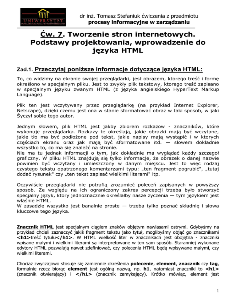 dr inż. Tomasz Stefaniuk ćwiczenia z przedmiotu procesy informacyjne w zarządzaniu Ćw. 7. Tworzenie stron internetowych. Podstawy projektowania, wprowadzenie do języka HTML Zad.1. Przeczytaj poniższe informacje dotyczące języka HTML: To, co widzimy na ekranie swojej przeglądarki, jest obrazem, ktorego treść i formę określono w specjalnym pliku. Jest to zwykły plik tekstowy, ktorego treść zapisano w specjalnym języku zwanym HTML (z języka angielskiego HyperText Markup Language). Plik ten jest wczytywany przez przeglądarkę (na przykład Internet Explorer, Netscape), dzięki czemu jest ona w stanie sformatować obraz w taki sposob, w jaki Ŝyczył sobie tego autor. Jednym słowem, plik HTML jest jakby zbiorem rozkazow - znaczników, które wykonuje przeglądarka. Rozkazy te określają, jakie obrazki mają być wczytane, jakie tło ma być podłożone pod tekst, jakie napisy mają wystąpić i w ktorych częściach ekranu oraz jak mają być sformatowane itd. — słowem dokładnie wszystko to, co ma się znaleźć na stronie. Nie ma tu jednak informacji o tym, jak dokładnie ma wyglądać każdy szczegoł graficzny. W pliku HTML znajdują się tylko informacje, że obrazek o danej nazwie powinien być wczytany i umieszczony w danym miejscu. Jest to więc rodzaj czystego tekstu opatrzonego komentarzami typu: „ten fragment pogrubić", „tutaj dodać rysunek" czy „ten tekst zapisać wielkimi literami" itp. Oczywiście przeglądarki nie potrafią zrozumieć poleceń zapisanych w powyższy sposob. Ze względu na ich ograniczony zakres percepcji trzeba było stworzyć specjalny język, ktory jednoznacznie określałby nasze życzenia — tym językiem jest właśnie HTML. W zasadzie wszystko jest banalnie proste — trzeba tylko poznać składnię i słowa kluczowe tego języka. Znacznik HTML jest specjalnym ciągiem znaków objętym nawiasami ostrymi. Gdybyśmy na przykład chcieli zaznaczyć jakiś fragment tekstu jako tytuł, moglibyśmy objąć go znacznikami <h1>treść tytułu</h1>. W HTML wielkość liter w znacznikach jest obojętna - znaczniki wpisane małymi i wielkimi literami są interpretowane w ten sam sposób. Staranniej wykonane edytory HTML pozwalają nawet zdefiniować, czy polecenia HTML będą wpisywane małymi, czy wielkimi literami. Chociaż zwyczajowo stosuje się zamiennie określenia polecenie, element, znacznik czy tag, formalnie rzecz biorąc element jest ogólną nazwą, np. h1, natomiast znaczniki to <h1> (znacznik otwierający) i </h1> (znacznik zamykający). Krótko mówiąc, element jest 1 dr inż. Tomasz Stefaniuk ćwiczenia z przedmiotu procesy informacyjne w zarządzaniu ogólniejszym i zbiorczym określeniem. Nie powinno to jednak prowadzić do nieporozumień, gdyż z kontekstu wiadomo, o co chodzi Wszystkie polecenia powinny się znaleźć w pewnych standardowych ramach. Zostało przyjęte, że dokument HTML zawiera szkielet, który stanowi osnowę dla wszystkich innych poleceń. Spotyka się wprawdzie w Internecie strony, które szkieletu nie zawierają (czasem tylko jego część), ale odradzamy taką praktykę, gdyż w pewnych okolicznościach może ona zaowocować niespodziewanymi efektami. Cały dokument powinien być objęty parą znaczników <html> </html>. Między nimi powinna zaś się znaleźć para znaczników <head> </head>, która stanowi ramy dla informacji nagłówkowych. Pozostałe informacje powinny być objęte z kolei znacznikami <body> </body>. Zad.2 Zapoznaj się z kursem html na stronie: http://webmaster.helion.pl/ http://www.w3schools.com/html/ (English) Zad.3 Otwórz pusty dokument w programie ked i wprowadź poniższe ramy dokumentu: Zapisz plik w stworzonym folderze w moich dokumentach – nazwa pliku: index.html 2 dr inż. Tomasz Stefaniuk ćwiczenia z przedmiotu procesy informacyjne w zarządzaniu Otwórz stworzony dokument w przeglądarce internetowej: Zad.4 Korzystając z kursu Pawła Wimmera zdefiniuj w nagłówku następujące elementy: Polski standard kodowania Informacje o autorze Opis strony (Strona niniejsza ma charakter ćwiczeniowy. Służy do zdobycia wprawy w posługiwaniu się językiem HTML) Słowa kluczowe (HTLM Imię Nazwisko, ćwiczenia, komunikacja internetowa) Język dokumentu Automatyczne przekierowanie strony na adres http://www.tstefaniuk.uph.edu.pl po 5 sekundach Zad.5 Korzystając z kursu Pawła Wimmera zdefiniuj następujące elementy sekcji <body>: Kolor tła #ddc1ff Kolor tła silver Ustaw jako tło obrazek skopiowany wcześniej do folderu foto Lewy i górny margines: 50 Zad.6 Korzystając z kursu Pawła Wimmera zdefiniuj następujące elementy blokowe Jako nagłówek 1 wpisz tekst (wyśrodkowany): Witam wszystkich na mojej stronie Jako nagłówek 2 wpisz tekst (wyrównany do prawej): Nazywam się Imie Nazwisko W nowym akapicie <p> (wyjustowanym) wpisz poniższy tekst: ****************************************************************** Jest to moja pierwsza strona Internetowa stworzona na ćwiczeniach przedmiotu KOMUNIKACJA INTERNETOWA i jestem z niej baaardzo dumny/a ****************************************************************** 3 dr inż. Tomasz Stefaniuk ćwiczenia z przedmiotu procesy informacyjne w zarządzaniu 4