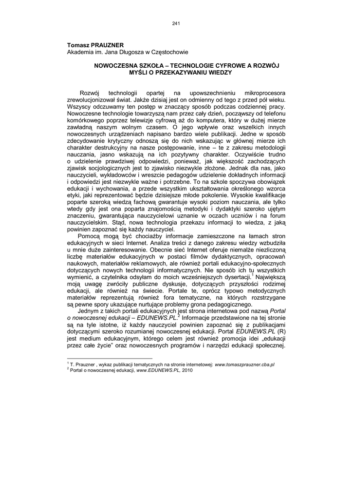 241 Tomasz PRAUZNER Akademia im. Jana Długosza w Częstochowie NOWOCZESNA SZKOŁA – TECHNOLOGIE CYFROWE A ROZWÓJ MYŚLI O PRZEKAZYWANIU WIEDZY Rozwój technologii opartej na upowszechnieniu mikroprocesora zrewolucjonizował świat. Jakże dzisiaj jest on odmienny od tego z przed pół wieku. Wszyscy odczuwamy ten postęp w znaczący sposób podczas codziennej pracy. Nowoczesne technologie towarzyszą nam przez cały dzień, począwszy od telefonu komórkowego poprzez telewizje cyfrową aż do komputera, który w dużej mierze zawładną naszym wolnym czasem. O jego wpływie oraz wszelkich innych nowoczesnych urządzeniach napisano bardzo wiele publikacji. Jedne w sposób zdecydowanie krytyczny odnoszą się do nich wskazując w głównej mierze ich charakter destrukcyjny na nasze postępowanie, inne – te z zakresu metodologii nauczania, jasno wskazują na ich pozytywny charakter. Oczywiście trudno o udzielenie prawdziwej odpowiedzi, ponieważ, jak większość zachodzących zjawisk socjologicznych jest to zjawisko niezwykle złożone. Jednak dla nas, jako nauczycieli, wykładowców i wreszcie pedagogów udzielenie dokładnych informacji i odpowiedzi jest niezwykle ważne i potrzebne. To na szkole spoczywa obowiązek edukacji i wychowania, a przede wszystkim ukształtowania określonego wzorca etyki, jaki reprezentować będzie dzisiejsze młode pokolenie. Wysokie kwalifikacje poparte szeroką wiedzą fachową gwarantuje wysoki poziom nauczania, ale tylko wtedy gdy jest ona poparta znajomością metodyki i dydaktyki szeroko ujętym znaczeniu, gwarantująca nauczycielowi uznanie w oczach uczniów i na forum nauczycielskim. Stąd, nowa technologia przekazu informacji to wiedza, z jaką powinien zapoznać się każdy nauczyciel. Pomocą mogą być chociażby informacje zamieszczone na łamach stron edukacyjnych w sieci Internet. Analiza treści z danego zakresu wiedzy wzbudziła u mnie duże zainteresowanie. Obecnie sieć Internet oferuje niemalże niezliczoną liczbę materiałów edukacyjnych w postaci filmów dydaktycznych, opracowań naukowych, materiałów reklamowych, ale również portali edukacyjno-społecznych dotyczących nowych technologii informatycznych. Nie sposób ich tu wszystkich wymienić, a czytelnika odsyłam do moich wcześniejszych dysertacji.1 Największą moją uwagę zwróciły publiczne dyskusje, dotyczących przyszłości rodzimej edukacji, ale również na świecie. Portale te, oprócz typowo metodycznych materiałów reprezentują również fora tematyczne, na których rozstrzygane są pewne spory ukazujące nurtujące problemy grona pedagogicznego. Jednym z takich portali edukacyjnych jest strona internetowa pod nazwą Portal 2 o nowoczesnej edukacji – EDUNEWS.PL. Informacje przedstawione na tej stronie są na tyle istotne, iż każdy nauczyciel powinien zapoznać się z publikacjami dotyczącymi szeroko rozumianej nowoczesnej edukacji. Portal EDUNEWS.PL (R) jest medium edukacyjnym, którego celem jest również promocja idei „edukacji przez całe życie” oraz nowoczesnych programów i narzędzi edukacji społecznej. 1 2 T. Prauzner , wykaz publikacji tematycznych na stronie internetowej: www.tomaszprauzner.cba.pl Portal o nowoczesnej edukacji, www.EDUNEWS.PL, 2010 242 Realizacja tych zamierzeń umożliwi wszystkim zainteresowanym, bez względu na wiek i zawód, efektywniejsze korzystanie z rezultatów postępu cywilizacyjnego i z światowych zasobów informacji. Z założenia jest to portal wymiany myśli i opinii, w którym toczą się debaty nad kształtem polskiej i światowej edukacji oraz jej największymi wyzwaniami w XXI wieku. Nie jest to jedynie portal informacyjny skupiony wokół wydarzeń dotyczących polskiego systemu oświaty, lecz taki na łamach, którego są publikowane informacje z różnych środowisk naukowych, inspirujących do działań i wprowadzania innowacji w procesie edukacji. W przeciwieństwie do innych portali edukacyjnych, EDUNEWS.PL (R) nie ogranicza się tematycznie do systemu oświaty i edukacji formalnej – współcześnie dużo większe znaczenie w rozwoju jednostek i społeczeństw ma edukacja nieformalna i duża część materiałów publikowanych właśnie jej dotyczy. Dla przypomnienia, proces edukacyjny to również proces współistnienia i oddziaływania wielu elementów o charakterze społecznym, psychologicznym nie wspominając o aspekcie pedagogicznym. Głównymi podmiotami tego procesu są dwie strony: uczeń i nauczyciel. Abstrahując od innych pochodnych elementów tego procesu, to te dwa podmioty dysertacji są najistotniejszymi stronami procesu komunikacji. Wszelkie rozważania na temat poziomu nauczania w obecnej szkole są skupione wobec dwóch myśli, jedna dotycząca ucznia, jako przedstawiciela młodego pokolenia, w swojej naturze chłonnego wiedzy i zainspirowanego otaczającym go światem, druga to nauczyciel, czyli osoba, która z racji swojego wieku, doświadczenia oraz wyasygnowania powinna sprostać oczekiwaniom młodego człowieka. Na tym tle powstaje pytanie dotyczące roli oraz modelu szkoły, jaki powinna przyjąć w dobie przezmian cywilizacyjnych? Jak powinna ewaluować polityka oświatowa w odniesieniu do zakładanych założeń system kształcenia powszechnego, np.: w edukacji przyszłej kadry dydaktycznej? To tylko wybrane wątki skłaniające do bardziej szczegółowej analizy problemu. Dzisiejszy model szkoły znacznie odbiega od tego, jaki istniał jeszcze kilkadziesiąt lat temu. Ta innowacyjność występująca w dzisiejszej szkole jest również efektem przemian technologicznych. W dobie powszechnej informacji, nowoczesnych mediów, nie tylko nauczyciel, ale i rodzice czy otoczenie rówieśnicze, muszą odnaleźć się w realiach egzystencji oraz kompetentnie w niej funkcjonować. Obecny system szkolnictwa doskonale widzi te przemiany i próbuje za nimi nadążyć, jednak wydaje się, iż bardzo często jest to reakcja spóźniona. W opiniach uczestników forum przeważaj