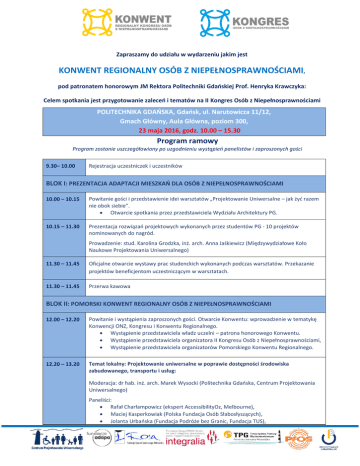Zapraszamy do udziału w wydarzeniu jakim jest KONWENT REGIONALNY OSÓB Z NIEPEŁNOSPRAWNOŚCIAMI, pod patronatem honorowym JM Rektora Politechniki Gdańskiej Prof. Henryka Krawczyka: Celem spotkania jest przygotowanie zaleceń i tematów na II Kongres Osób z Niepełnosprawnościami POLITECHNIKA GDAŃSKA, Gdańsk, ul. Narutowicza 11/12, Gmach Główny, Aula Główna, poziom 300, 23 maja 2016, godz. 10.00 – 15.30 Program ramowy Program zostanie uszczegółowiony po uzgodnieniu wystąpień panelistów i zaproszonych gości 9.30– 10.00 Rejestracja uczestniczek i uczestników BLOK I: PREZENTACJA ADAPTACJI MIESZKAŃ DLA OSÓB Z NIEPEŁNOSPRAWNOŚCIAMI 10.00 – 10.15 Powitanie gości i przedstawienie idei warsztatów „Projektowanie Uniwersalne – jak żyć razem nie obok siebie”. Otwarcie spotkania przez przedstawiciela Wydziału Architektury PG. 10.15 – 11.30 Prezentacja rozwiązań projektowych wykonanych przez studentów PG - 10 projektów nominowanych do nagród. Prowadzenie: stud. Karolina Grodzka, inż. arch. Anna Jaśkiewicz (Międzywydziałowe Koło Naukowe Projektowania Uniwersalnego) 11.30 – 11.45 Oficjalne otwarcie wystawy prac studenckich wykonanych podczas warsztatów. Przekazanie projektów beneficjentom uczestniczącym w warsztatach. 11.30 – 11.45 Przerwa kawowa BLOK II: POMORSKI KONWENT REGIONALNY OSÓB Z NIEPEŁNOSPRAWNOŚCIAMI 12.00 – 12.20 Powitanie i wystąpienia zaproszonych gości. Otwarcie Konwentu: wprowadzenie w tematykę Konwencji ONZ, Kongresu i Konwentu Regionalnego. Wystąpienie przedstawiciela władz uczelni – patrona honorowego Konwentu. Wystąpienie przedstawiciela organizatora II Kongresu Osób z Niepełnosprawnościami, Wystąpienie przedstawiciela organizatorów Pomorskiego Konwentu Regionalnego. 12.20 – 13.20 Temat lokalny: Projektowanie uniwersalne w poprawie dostępności środowiska zabudowanego, transportu i usług: Moderacja: dr hab. inż. arch. Marek Wysocki (Politechnika Gdańska, Centrum Projektowania Uniwersalnego) Paneliści: Rafał Charłampowicz (ekspert AccessibilityOz, Melbourne), Maciej Kasperkowiak (Polska Fundacja Osób Słabosłyszących), Jolanta Urbańska (Fundacja Podróże bez Granic, Fundacja TUS), Beata Wachowiak-Zwara (Pełnomocnik Prezydenta Miasta Gdyni ds. Osób Niepełnosprawnych). Dyskusja 13.20 – 13.35 Ogłoszenie wyników i wręczenie nagród w konkursie studenckim na najlepiej zaaranżowaną przestrzeń mieszkalną wykonaną podczas warsztatów partycypacyjnych „Projektowanie uniwersalne – jak żyć razem nie obok siebie” Wystąpienie beneficjenta projektu nagrodzonego nagrodą Grand Prix, 13.35 – 13.50 Przerwa kawowa 13.50 – 14.50 Temat wspólny dla Konwentów: Orzecznictwo i system wsparcia osób z niepełnosprawnościami. Moderacja: dr Paweł Kubicki (Szkoła Główna Handlowa, Stowarzyszenie Nie-Grzeczne Dzieci). Paneliści: mec. Katarzyna Heba (doktorantka Wydziału Prawa Uniwersytetu w Białymstoku), Danuta Kłopocka (Prezeska Fundacji ADAPA), Agnieszka Zborowska (Agencja Pośrednictwa Pracy Fundacji Integralia), Dyskusja 14.50 – 15.20. Dyskusja na wszelkie tematy zgłaszane przez uczestników i zgłaszanie tematów do sesji równoległych na II Kongresie Osób z Niepełnosprawnościami. 15.20 – 15.30 Podsumowanie i zakończenie Konwentu Regionalnego. Równolegle do z Pomorskim Konwentem Regionalnym odbędą się warsztaty symulacyjne dla studentów Wydziału Architektury organizowane przez Fundację Polska bez Barier i firmę TechnoNICOL. Miejsce spotkania jest dostępne dla osób mających trudności z poruszaniem się. Zapewniamy tłumacza polskiego języka migowego i pętlę indukcyjną. Udział w Konwencie jest bezpłatny. Wypełniony formularz zgłoszeniowy należy przesłać do 19 maja 2016 r. na adres mail: [email protected] lub faksem na nr tel.: 58 348 61 63 Więcej aktualnych szczegółów na temat Kongresu można znaleźć na stronie www.konwencja.org Serdecznie zapraszamy! PATRONAT HONOROWY: WSPARCIA ORGANIZATOROM UDZIELILI: ORGANIZATORZY KONWENTU REGIONALNEGO