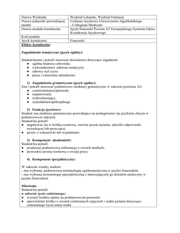 Nazwa Wydziału Nazwa jednostki prowadzącej moduł Nazwa modułu kształcenia Kod modułu Język kształcenia Efekty kształcenia: Wydział Lekarski, Wydział Farmacji Centrum Językowe Uniwersytetu Jagiellońskiego - Collegium Medicum Język francuski Poziom A2 Europejskiego Systemu Opisu Kształcenia Językowego Francuski Zagadnienia tematyczne (język ogólny): Student/kazna i potrafi stosować słownictwo dotyczące zagadnień: ● ogólna budowa człowieka ● wykształceniew zakresie medycyny ● zdrowy styl życia ● praca i omawiane aktualności 1) Zagadnienia gramatyczne (język ogólny): Zna i potrafi stosować podstawowe struktury gramatyczne w zakresie poziomu A2: ● czasteraźniejszyiprzeszły ● stopniowanie ● trybrozkazujący ● szykzdaniawspółrzędnego 2) Funkcje językowe: Student zna struktury gramatyczne pozwalające na posługiwanie się językiem obcym w podstawowym zakresie. Student/ka potrafi: ● angażować się w krótką rozmowę, stawiać proste pytania, udzielić odpowiedzi twierdzącej lub przeczącej ● prosić o wskazówki lub wyjaśnienie 3) Komponent akademicki: Student/ka potrafi: ● przekazać podstawową informację o swoich studiach, ● prowadzić prostą rozmowę o swojej pracy 4) Komponent specjalistyczny: W zakresie wiedzy student: - zna wybraną, podstawową terminologię ogólnomedyczną w języku francuskim - zna wybraną terminologię specjalistyczną z interesujących go dziedzin medycyny w języku francuskim Mówienie Student/ka potrafi: w zakresie życia codziennego: ● wyrazić krótkie opinie na podstawowym poziomie ● opowiedzieć krótko o swoich codziennych zajęciach i zadać pytania dotyczące codziennego życia innej osoby w zakresie języka specjalistycznego: ● ● ● ● porozumiewać się w podstawowym zakresie tematyki ogólnomedycznej formułować proste pytania i udzielać prostych odpowiedzi w języku obcym porozumiewać się na podstawowym poziomie w języku francuskim na tematy zawodowe zapytać pacjenta o podstawowe problemy zdrowotne oraz wydać podstawowe polecenia związane z tematyką zawodową w zakresie języka akademickiego: ● potrafi zrozumieć proste informacje na temat spotkań, terminów itp. Słuchanie Student/ka potrafi: w zakresie życia codziennego: ● zrozumieć proste rozmowy przekazywane powoli. w zakresie języka specjalistycznego: ● ● zrozumieć proste wypowiedzi ustne pacjenta związane z objawami podmiotowymi zrozumieć proste polecenia związane z terapią w zakresie języka akademickiego: ● rozumie i wykonuje proste polecenia nauczyciela, Pisanie Student/ka potrafi: w zakresie życia codziennego: ● napisać prosty list tradycyjny i elektroniczny ● wypełnić prosty formularz w zakresie języka specjalistycznego: ● sporządzić proste notatki ● ● zapisać w języku obcym podstawowe pojęcia związane z terapią napisaćproste zalecenia dotyczące terapii w zakresie języka akademickiego ● napisać krótkie pismo Czytanie Student/ka potrafi: w zakresie życia codziennego: ● zrozumieć ogólny sens tekstów fachowych pracując ze słownikiem w zakresie języka specjalistycznego ● zrozumieć proste instrukcje ● zrozumieć proste teksty medyczne w zakresie języka akademickiego: ● łączyć proste informacje z różnych źródeł Treści kształcenia w podziale na semestry: Komunikacja w języku francuskim na poziomie podstawowym w następujących zakresach: 1. Moje życie i moje studia 2. Szpital, personel medyczny i jego praca 1 3. Szpital, personel medyczny i jego praca 2 4. Szpital, personel medyczny i jego praca 3 5. 6. 7. 8. 9. 10. 11. 12. 13. 14. 15. 16. 17. 18. 19. 20. 21. 22. 23. 24. 25. 26. 27. 28. Szpital, personel medyczny i jego praca 4 Opieka nad pacjentem 1 Opieka nad pacjentem 2 Elementy anatomii człowieka Badanie lekarskie Opis ogólnych dolegliwości 1 Opis ogólnych dolegliwości 2 Dieta chorego Podstawowe badania fizykalne Narządy jamy brzusznej Wywiad medyczny 1 Wywiad medyczny 2 Wywiad medyczny 3 Podstawowe schorzenia narządów jamy brzusznej Elementy układu oddechowego Przygotowanie do operacji Zabieg operacyjny Kontrolna wizyta lekarska 1 Kontrolna wizyta lekarska 2 Elementy układu krążenia Postacie leków i dawkowanie Elementy układu kostno-mięśniowego Zmiana opatrunku Zagadnienia proponowane przez studentów Literatura podstawowa: 1.Saison 2 methode de francais, wyd. Didier Literatura uzupełniająca: 1. Fossier T., Talavera-Goy S. “Le francais des medecins” PUG FLE 2. Materiały dydaktyczne kompilowane przez lektorów. 3. Mourlhon – Dallies F., Tolas J. “ Sante – medicine.com” CLE International