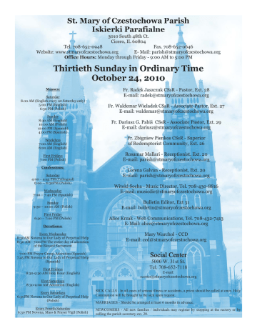 St. Mary of Czestochowa Parish Iskierki Parafialne 3010 South 48th Ct. Cicero, IL 60804 Tel. 708-652-0948 Fax. 708-652-0646 Website: www.stmaryofczestochowa.org E- Mail: [email protected] Office Hours: Monday through Friday - 9:00 AM to 5:00 PM Thirtieth Sunday in Ordinary Time October 24, 2010 Masses: Saturday 8.00 AM (English every 1st Saturday only) 5:00 PM (English) 6:30 PM (Polish) Sunday 8:30 AM (English) 10:00 AM (Polish) 12:00 PM (Spanish) 4:00 PM (Spanish) Weekdays 7:00 AM (English) 8:00 AM (English) First Fridays 7:00 PM (Polish) Confessions: Saturday 4:00 – 4:45 PM (Trilingual) 6:00 — 6:30PM (Polish) Wednesday 7:00 – 7:40 PM (Spanish) Sunday 9:30 – 10:00 AM (Polish) First Friday 6:30 – 7:00 PM (Polish) Devotions: Every Wednesday 8:30AM Novena to Our Lady of Perpetual Help 8:30 AM - 7:00 PM The entire day of adoration of the Blessed Sacrament 7:00 PM Prayer Group-Adoration (Spanish) 7:45 PM Novena to Our Lady of Perpetual Help (Spanish) First Fridays 8:30-9:30 AM Holy Hour (English) Fr. Radek Jaszczuk CSsR - Pastor, Ext. 28 E-mail: [email protected] Fr. Waldemar Wieladek CSsR - Associate Pastor, Ext. 27 E-mail: [email protected] Fr. Dariusz G. Pabiś CSsR - Associate Pastor, Ext. 29 E-mail: [email protected] Fr. Zbigniew Pienkos CSsR - Superior of Redemptorist Community, Ext. 26 Rosamar Mallari - Receptionist, Ext. 20 E-mail: [email protected] Lorena Galvan - Receptionist, Ext. 20 E-mail: [email protected] Witold Socha - Music Director, Tel. 708-430-8816 E-mail: [email protected] Bulletin Editor, Ext 31 E-mail: [email protected] Alice Krzak - Web Communications, Tel. 708-432-7413 E-Mail: [email protected] Mary Warchol - CCD E-mail: [email protected] Social Center 5000 W. 31st St. Tel. 708-652-7118 E-mail: [email protected] First Saturdays 8:30-9:00 AM Adoration (English) Every Saturdays 6:30PM Novena to Our Lady of Perpetual Help (Polish) Every Fourth Saturday 6:30 PM Novena, Mass & Prayer Vigil (Polish) SICK CALLS - In all cases of serious illness or accidents, a priest should be called at once. Holy Communion will be brought to the sick upon request. MARRIAGES - Should be arranged at least 6 months in advance. NEWCOMERS - All new families / individuals may register by stopping at the rectory or by calling the parish secretary ext. 20. Sunday Iskierki Parafialne October 29, Friday, Weekday in Ordinary Time 7:00 †Holy Souls in the Book of Remembrance 8:00 †Theresa Bogacz (family) October 24, Thirtieth Sunday in Ordinary Time 8:30 †Anne Vavrek (Family) †Kevin Burke (mother) †Julian Byczynski (Dolores Koss) †Dorothy Honek 9:30 Rosary 10:00 O Boże bł. z okazji urodzin dla O. Radosława Jaszczuka O Boże bł. w 30-ą rocz. ślubu dla Krystyny i Zbigniewa Podziękowanie Panu Bogu za otrzymane łaski z prośbą o dalsze †Filomena i Zygmunt Staniszewscy †Dionizy Maciejewski (1-a rocz. śm.) †Mariusz Wąsik †Krzysztof Wąsik †Józef i Anne Walkosz †Józef i Agnieszka Wyrostek †Jan i Ludwina Pańszczyk † Jan Walkosz i Jan Radkosz †Agnieszka Mika †Za dusze w Czyśćcu cierpiące 12:00 Bud and Marianne Buckner (45th Wedding Anniversary) †Jose Lopez (familia Lopez) †Maria de Jesus Hernandez 3:00 Rosario—de La Virgen del Rosario 4:00 Presentación de 3 años de April Flores Rafaela Ramirez (61 cumpleaños) †Maria de Jesus Hernandez (hijo Tomas Flores) October 25, Monday, Weekday in Ordinary Time 7:00 †Anna Kurylo (Kurylo family) 8:00 Fr. Radeks Birthday Blessing October 26, Tuesday, Weekday in Ordinary Time 7:00 †Holy Souls in the Book of Remembrance 8:00 †Holy Souls in the Book of Remembrance October 27, Wednesday, Weekday in Ordinary Time 7:00 Parishioners 8:00 25th Anniversary of Wedding of Zofia i Wojoieck Sikoń 8:30 Novena: Our Lady of Perpetual Help/Adoration 7 PM El Circulo de Oración 7:45 Novena a Nuestra Señora del Perpetuo Socorro October 28, Thursday, St. Simon and St. Jude, apostles 7:00 †Chester Zator (Bruno Zaucha) 8:00 †Holy Souls in the Book of Remembrance October 30, Saturday, Weekday in Ordinary Time 3:00 Quinceañera: Jessica Romero 5:00 †Wanda Hagemeyer (Terry, Claire, Ed) †Edward Natonski (Son Lawry) 6:30 O bł. Boże dla Joanna Sikoń w dnia urodzin i z prośbą o zdrowie October 31, Thirty-First Sunday in Ordinary Time 8:30 Eva Zaczek for Health †Jesse Aguilera (Susan Aguilera) †Julian Byczynski (Robert Krolak) 9:30 Rosary 10:00 †Stanley Wdowiak (Wife Helen) †Filomena i Zygmunt Staniszewscy †Dionizy Maciejewski (1-a rocz. śm.) 12:00 †Juana Castro y Adriana Gomez (Familia Gomez) 3:00 Rosario—de La Virgen del Rosario 4:00 Por los Feligreses Lector Schedule Saturday, October 30 5 PM Don Rutkowski, John Stenson Sunday, October 31 8:30 Michele Cisom, Carmen Castaneda 10:00 12:00 4:00 Jarek Szyszlak, Waldemar Lipka Esteban Talavera, Roberto Pasillas Miriam Campagne, Marisol Ortiz Linda Ramirez, Martha Brito Humberto Tellez, Enrique Garcia Eucharistic Minister Saturday, October 30 5PM Jean Yunker, Larry Napoletano Sunday, October 31 8:30 Ed Hennessy, Myra Rodriguez John Kulaga 10:00 Waldemar Lipka 12:00 Juana Salas, Linda Ramirez Olivia Ortiz 4:00 Margarita Morales, Guadalupe Gutierrez WEDDING BANNS There is a promise of marriage between…………….. lll. Marisol Ortiz & Orlando Ibarra l. Fatima Concepcion & Francisco Alvarez St. Mary of Czestochowa Sunday Collection October 17, 2010 Oct. 16 Oct. 17 The next Religious Education (CCD) class will be held on Saturday morning, November 6, 2010. This session will begin with the 8:00 A.M. Mass, and students are to meet in church. PLEASE BE ON TIME. The Religious Education Program is in need of two catechists for the 2010-2011 school year. If you would like to share your faith and teach the Good News of Jesus to the students in the program, please call the rectory at (708) 652-0948 and leave your name and phone number. Classes are taught in the English language. The 18 class sessions are held on alternate Saturdays beginning in September and end