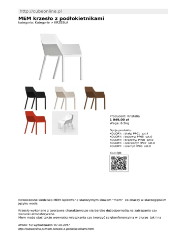 http://cubeonline.pl MEM krzesło z podłokietnikami kategoria: Kategorie > KRZESŁA Producent: Kristalia 1 049,00 zł Waga: 6.5kg Opcje produktu: KOLORY: : biały/ PP01 szt.4 KOLORY: : beżowy/ PP05 szt.0 KOLORY: : brązowy/ PP08 szt.0 KOLORY: : czerwony/ PP07 szt.0 KOLORY: : czarny/ PP03 szt.0 Kod QR: Nowoczesne siedzisko MEM ispirowane starożytnym słowem "mem" co znaczy w staroegipskim języku woda. Krzesło wykonane z tworzywa charakteryzuje się bardzo dużodpornośią na zatrapania czy warunki atmosferyczne. Mem może stać także wewnatrz mieszkania czy tworzyć salękonferencyjną w biurze jak i na strona: 1/2 wydrukowano: 07-03-2017 http://cubeonline.pl/mem-krzeslo-z-podlokietnikami.html zewnątrz na tarasie czy balkonie jak i w ogrodzie. Krzesło ma bardzo nowoczesny kształt, ergonomiczne podłokietniki zadowoli każdego. Do krzesła MEM można dokupić miekką i elastyczną poduszkę wykonaną z poliuretanu, którą montuje się do krzesła za pomocą klipów co zapewni jeszcze bardziej komfortowe siedzenie. WYMIARY (CM): wysokość siedziska: 45 wysokosć całkowita: 83 szerokość: 57 głębokość: 55 MATERIAŁ: tworzywo-polypropylen INNE: możliwość sztaplowania (do 4 sztuk maksymalnie) może stać na zewnątrz można dokpić poduchę w kolorze siedziska Inne produkty Kristalia: http://www.cubeonline.pl/manufacturer/kristalia Inne produkty prjektanta Christphe'a Pillet: http://cubeonline.pl/designer/pillet-christophe strona: 2/2 wydrukowano: 07-03-2017 http://cubeonline.pl/mem-krzeslo-z-podlokietnikami.html