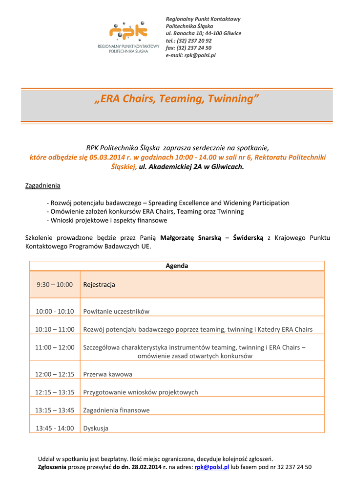 Regionalny Punkt Kontaktowy Politechnika Śląska ul. Banacha 10; 44-100 Gliwice tel.: (32) 237 20 92 fax: (32) 237 24 50 e-mail: [email protected] „ERA Chairs, Teaming, Twinning” RPK Politechnika Śląska zaprasza serdecznie na spotkanie, które odbędzie się 05.03.2014 r. w godzinach 10:00 - 14.00 w sali nr 6, Rektoratu Politechniki Śląskiej, ul. Akademickiej 2A w Gliwicach. Zagadnienia - Rozwój potencjału badawczego – Spreading Excellence and Widening Participation - Omówienie założeń konkursów ERA Chairs, Teaming oraz Twinning - Wnioski projektowe i aspekty finansowe Szkolenie prowadzone będzie przez Panią Małgorzatę Snarską – Świderską z Krajowego Punktu Kontaktowego Programów Badawczych UE. Agenda 9:30 – 10:00 Rejestracja 10:00 - 10:10 Powitanie uczestników 10:10 – 11:00 Rozwój potencjału badawczego poprzez teaming, twinning i Katedry ERA Chairs 11:00 – 12:00 Szczegółowa charakterystyka instrumentów teaming, twinning i ERA Chairs – omówienie zasad otwartych konkursów 12:00 – 12:15 Przerwa kawowa 12:15 – 13:15 Przygotowanie wniosków projektowych 13:15 – 13:45 Zagadnienia finansowe 13:45 - 14:00 Dyskusja Udział w spotkaniu jest bezpłatny. Ilość miejsc ograniczona, decyduje kolejność zgłoszeń. Zgłoszenia proszę przesyłać do dn. 28.02.2014 r. na adres: [email protected] lub faxem pod nr 32 237 24 50 KARTA ZGŁOSZENIA UCZESTNICTWA Instytucja zgłaszająca Imię i nazwisko uczestnika Telefon e-mail Zgłaszam udział w spotkaniu informacyjnym: „ERA Chairs, Teaming, Twinning” Dnia 05.03.2014 r., godz. 10.00 Sala nr 6 w Rektoracie Politechniki Śląskiej, ul. Akademicka 2A, Gliwice