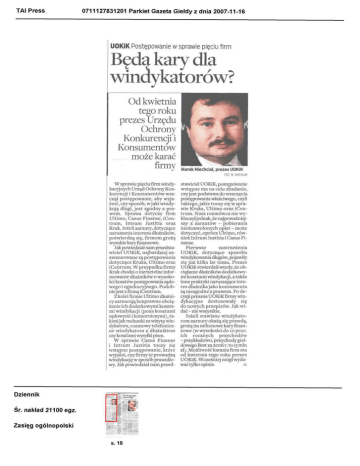 TAI Press 0711127831201 Parkiet Gazeta Giełdy z dnia 2007-11-16 UOKiK Postępowanie w sprawie pięciu firm Będą kary dla winaykatorów? Od kwietnia tego roku prezes Urzędu Ochrony Konkurencji i Konsumentów może karać firmy Marek Niechciał, prezes UOKiK FOT. W. WASYLUK W sprawie pięciu firm windykacyjnych Urząd Ochrony Konkurencji i Konsumentów wszczął postępowanie, aby wyjaśnić, czy sposób, w jaki windykują długi, jest zgodny z prawem. Sprawa dotyczy firm Ultimo, Casus Finanse, iCentrum, Intrum Justitia oraz Kruk. Jeżeli zarzuty, dotyczące naruszania interesu dłużników, potwierdzą się, firmom grożą wysokie kary finansowe. Jak powiedział nam przedstawiciel UOKiK, najbardziej zaawansowane są postępowania dotyczące Kruka, Ultimo oraz iCentrum. W przypadku firmy Kruk chodzi o nierzetelne informowanie dłużników o wysokości kosztów postępowania sądowego i egzekucyjnego. Podobnie jest z firmą iCentrum. Z kolei firmie Ultimo dłużnicy zarzucają bezprawne obciążanie ich dodatkowymi kosztami windykacji (poza kosztami sądowymi i komorniczymi), takimi jak rachunki za wizytę windykatora, rozmowy telefoniczne windykatora z dłużnikiem czy kosztami wysyłki pism. W sprawie Casus Finanse i Intrum Justitia toczy się wstępne postępowanie, które wyjaśni, czy firmy te prowadzą windykację w sposób prawidłowy. Jak powiedział nam przed- Dziennik £SB* Śr. nakład 21100 egz. Zasięg ogólnopolski s. 18 stawiciel UOKiK, postępowanie wstępne ma na celu zbadanie, czy jest podstawa do wszczęcia postępowania właściwego, czyli takiego, jakie toczy się w sprawie Kruka, Ultimo oraz iCentrum. Nasz rozmówca nie wykluczył jednak, że najpoważniejszy z zarzutów - pobierania niedozwolonych opłat - może dotyczyć, oprócz Ultimo, również Intrum Justitia i Casus Finanse. Pierwsze zastrzeżenia UOKiK, dotyczące sposobu windykowania długów, pojawiły się już kilka lat temu. Prezes UOKiK stwierdził wtedy, że obciążanie dłużników dodatkowymi kosztami windykacji, a także inne praktyki naruszające interes dłużnika jako konsumenta są niezgodne z prawem. Po decyzji prezesa UOKiK firmy windykacyjne dostosowały się do nowych przepisów. Jak widać - nie wszystkie. Jeżeli stawiane windykatorom zarzuty okażą się prawdą, grożą im milionowe kary finansowe (w wysokości do 10 proc. ich rocznych przychodów - przykładowo, przychody giełdowego Best za 2006 r. to 15 min zł). Możliwość karania firm ma od kwietnia tego roku prezes UOKiK. Wcześniej mógł wydawać tylko opinie. AS