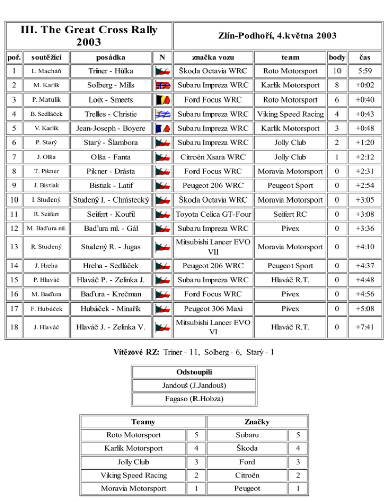 III. The Great Cross Rally 2003 poř. soutěžící posádka 1 L. Macháň 2 Zlín-Podhoří, 4.května 2003 N značka vozu team body čas Triner - Hůlka Škoda Octavia WRC Roto Motorsport 10 5:59 M. Karlík Solberg - Mills Subaru Impreza WRC Karlík Motorsport 8 +0:02 3 P. Matulík Loix - Smeets Ford Focus WRC Roto Motorsport 6 +0:40 4 B. Sedláček Trelles - Christie Subaru Impreza WRC Viking Speed Racing 4 +0:43 5 V. Karlík Jean-Joseph - Boyere Subaru Impreza WRC Karlík Motorsport 3 +0:48 6 P. Starý Starý - Šlambora Subaru Impreza WRC Jolly Club 2 +1:20 7 J. Olša Olša - Fanta Citroën Xsara WRC Jolly Club 1 +2:12 8 T. Pikner Pikner - Drásta Ford Focus WRC Moravia Motorsport 0 +2:31 9 J. Bistiak Bistiak - Latif Peugeot 206 WRC Peugeot Sport 0 +2:54 10 I. Studený Studený I. - Chrástecký Škoda Octavia WRC Moravia Motorsport 0 +3:05 11 R. Seifert Seifert - Kouřil Toyota Celica GT-Four Seifert RC 0 +3:08 12 M. Baďura ml. Baďura ml. - Gál Subaru Impreza WRC Pivex 0 +3:36 13 R. Studený Studený R. - Jugas 0 +4:10 14 J. Hreha Hreha - Sedláček Peugeot 206 WRC Peugeot Sport 0 +4:37 15 P. Hlaváč Hlaváč P. - Zelinka J. Subaru Impreza WRC Hlaváč R.T. 0 +4:48 16 M. Baďura Baďura - Krečman Ford Focus WRC Pivex 0 +4:56 17 F. Hubáček Hubáček - Minařík Peugeot 306 Maxi Pivex 0 +5:08 18 J. Hlaváč Hlaváč J. - Zelinka V. Mitsubishi Lancer EVO VI Hlaváč R.T. 0 +7:41 Mitsubishi Lancer EVO Moravia Motorsport VII Vítězové RZ: Triner - 11, Solberg - 6, Starý - 1 Odstoupili Jandouš (J.Jandouš) Fagaso (R.Hobza) Teamy Značky Roto Motorsport 5 Subaru 5 Karlík Motorsport 4 Škoda 4 Jolly Club 3 Ford 3 Viking Speed Racing 2 Citroën 2 Moravia Motorsport 1 Peugeot 1