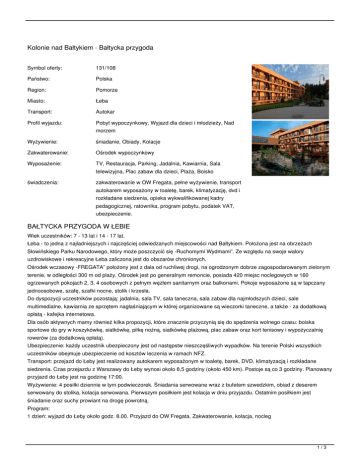 Kolonie nad Bałtykiem - Bałtycka przygoda Symbol oferty: 131/108 Państwo: Polska Region: Pomorze Miasto: Łeba Transport: Autokar Profil wyjazdu: Pobyt wypoczynkowy, Wyjazd dla dzieci i młodzieży, Nad Wyżywienie: śniadanie, Obiady, Kolacje Zakwaterowanie: Ośrodek wypoczynkowy Wyposażenie: TV, Restauracja, Parking, Jadalnia, Kawiarnia, Sala świadczenia: zakwaterowanie w OW Fregata, pełne wyżywienie, transport morzem telewizyjna, Plac zabaw dla dzieci, Plaża, Boisko autokarem wyposażony w toaletę, barek, klimatyzację, dvd i rozkładane siedzenia, opieka wykwalifikowanej kadry pedagogicznej, ratownika, program pobytu, podatek VAT, ubezpieczenie. BAŁTYCKA PRZYGODA W ŁEBIE Wiek uczestników: 7 - 13 lat i 14 - 17 lat. Łeba - to jedna z najładniejszych i najczęściej odwiedzanych miejscowości nad Bałtykiem. Położona jest na obrzeżach Słowińskiego Parku Narodowego, który może poszczycić się -Ruchomymi Wydmami”. Ze względu na swoje walory uzdrowiskowe i rekreacyjne Łeba zaliczona jest do obszarów chronionych. Ośrodek wczasowy -FREGATA” położony jest z dala od ruchliwej drogi, na ogrodzonym dobrze zagospodarowanym zielonym terenie, w odległości 300 m od plaży. Ośrodek jest po generalnym remoncie, posiada 420 miejsc noclegowych w 160 ogrzewanych pokojach 2, 3, 4 osobowych z pełnym węzłem sanitarnym oraz balkonami. Pokoje wyposażone są w tapczany jednoosobowe, szafę, szafki nocne, stolik i krzesła. Do dyspozycji uczestników pozostają: jadalnia, sala TV, sala taneczna, sala zabaw dla najmłodszych dzieci, sale multimedialne, kawiarnia ze sprzętem nagłaśniającym w której organizowane są wieczorki taneczne, a także - za dodatkową opłatą - kafejka internetowa. Dla osób aktywnych mamy również kilka propozycji, które znacznie przyczynią się do spędzenia wolnego czasu: boiska sportowe do gry w koszykówkę, siatkówkę, piłkę nożną, siatkówkę plażową, plac zabaw oraz kort tenisowy i wypożyczalnię rowerów (za dodatkową opłatą). Ubezpieczenie: każdy uczestnik ubezpieczony jest od następstw nieszczęśliwych wypadków. Na terenie Polski wszystkich uczestników obejmuje ubezpieczenie od kosztów leczenia w ramach NFZ. Transport: przejazd do Łeby jest realizowany autokarem wyposażonym w toaletę, barek, DVD, klimatyzacją i rozkładane siedzenia. Czas przejazdu z Warszawy do Łeby wynosi około 8,5 godziny (około 450 km). Postoje są co 3 godziny. Planowany przyjazd do Łeby jest na godzinę 17:00. Wyżywienie: 4 posiłki dziennie w tym podwieczorek. Śniadania serwowane wraz z bufetem szwedzkim, obiad z deserem serwowany do stolika, kolacja serwowana. Pierwszym posiłkiem jest kolacja w dniu przyjazdu. Ostatnim posiłkiem jest śniadanie oraz suchy prowiant na drogę powrotną. Program: 1 dzień: wyjazd do Łeby około godz. 8.00. Przyjazd do OW Fregata. Zakwaterowanie, kolacja, nocleg 1/3 2-10 dzień: wypoczynek w Łebie i realizacja programu - wycieczka do Słowińskiego Parku Narodowego, na ruchome wydmy, przejazd kolejką w jedną stronę, w jedną przejście piechotą. - pasowanie na kolonistę -Wielka Misja” z głośnym korowodem przebierańców - zajęcia plastyczne: wybór nazwy grupy i malowanie plakatu - herbu na rozpoczęcie kolonii - Bal przebierańców pt. -Piękna Księżniczka” i -Król Władca Absolutny” - Piżama Party, - dzień zakochanych - śluby na wesoło - Karaoke -Najlepszy głos kolonisty” - Spartakiada Sportowa na wesoło i z humorem (zawody grupowe i indywidualne) - Rozgrywki sportowe w piłkę nożną, siatkówkę, koszykówkę, dla młodszych dzieci gry w trzy podania i piłkę rzucankę, - gra w poszukiwaniu brakującego elementu - -Gdzie ten balon? Jaki balon? Kto szybciej” - gra terenowa - -Znawca terenu i okolicy” - Poczta Francuzka - -Ach co to był za list??!!” - łapanie słońca - plażowanie i kąpiele w Bałtyku - wyprawa w poszukiwaniu bursztynu - zajęcia grupowe i integracyjne nad brzegiem morza - zabawy na orientację - zajęcia i konkursy plastyczne - dyskoteki w pirackim stylu - ognisko z pieczeniem kiełbasek - wieczorny festiwal piosenki ogniskowej - uroczyste wręczenie nagród dla zwycięzców rywalizacji obozowej - uroczysta dyskoteka lub ognisko kończące obóz 11 dzień po śniadaniu wyjazd w drogę powrotną, przyjazd na miejsce wyjazdu ok. 18.00 Wycieczki fakultatywne (realizowane przy 15 osobach chętnych) - Jura Park: 30,00 zł - Szymbark (skansen wsi kaszubskiej z atrakcjami, m.in. dom do góry nogami): 60,00 zł - park linowy: 30,00 zł Program fakultatywny (realizowany za dodatkową opłatą): - dopłata do programu -We love Dance” 150,00 zł (w programie 11 godzin tańca podczas turnusu). Zajęcia prowadzone są przez profesjonalną instruktorkę. Zajęcia z tańca towarzyskiego, w parach i solo. Nauka tańców latynoamerykańskich, jazzu, hip hopu, Nauka techniki, klasyki, stretchingu, choreografii. - dopłata do programu -Artystą być” 150,00 zł (w programie 11 godzin zajęć artystycznych). Zajęcia prowadzone są przez doświadczonego artystę - plastyka. Kształtowanie form przestrzennych, warsztaty w masie solnej, nauka techniki kolażu, pejzaże, rysunek tuszem na mokrym tle. TERMINY: od: 2017-06-27 do: 2017-07-07 (11 dni), miejsca: sprawdź miejsca cena od: 1600 PLN od: 2017-07-08 do: 2017-07-18 (11 dni), miejsca: sprawdź miejsca cena od: 1600 PLN CENNIK: Długość pobytu: 11 dni Grupa cenowa: A Rodzaj osoby (do wyboru) (*) uczestnik 1600 Waluta: PLN Aktualne ceny z systemu S.A.R.T. (-) - cena usługi, podatku kalkulowana przy osobie lub gratis 2/3 (*) - kwota wliczona w cenę standardową 3/3