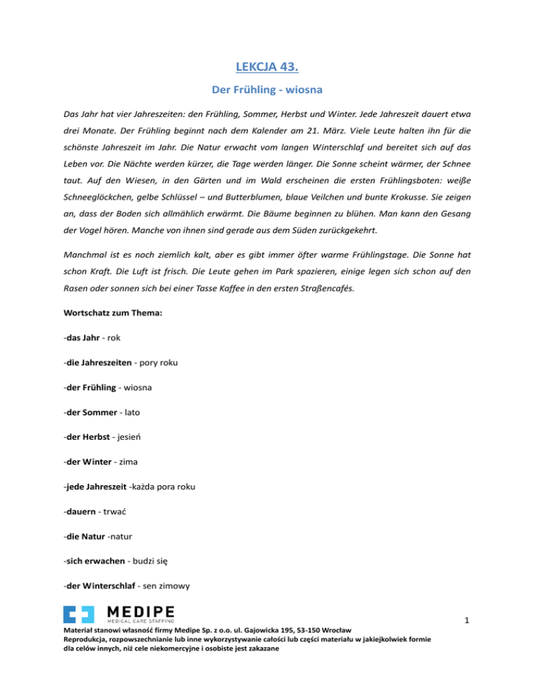 LEKCJA 43. Der Frühling - wiosna Das Jahr hat vier Jahreszeiten: den Frühling, Sommer, Herbst und Winter. Jede Jahreszeit dauert etwa drei Monate. Der Frühling beginnt nach dem Kalender am 21. März. Viele Leute halten ihn für die schönste Jahreszeit im Jahr. Die Natur erwacht vom langen Winterschlaf und bereitet sich auf das Leben vor. Die Nächte werden kürzer, die Tage werden länger. Die Sonne scheint wärmer, der Schnee taut. Auf den Wiesen, in den Gärten und im Wald erscheinen die ersten Frühlingsboten: weiße Schneeglöckchen, gelbe Schlüssel – und Butterblumen, blaue Veilchen und bunte Krokusse. Sie zeigen an, dass der Boden sich allmählich erwärmt. Die Bäume beginnen zu blühen. Man kann den Gesang der Vogel hören. Manche von ihnen sind gerade aus dem Süden zurückgekehrt. Manchmal ist es noch ziemlich kalt, aber es gibt immer öfter warme Frühlingstage. Die Sonne hat schon Kraft. Die Luft ist frisch. Die Leute gehen im Park spazieren, einige legen sich schon auf den Rasen oder sonnen sich bei einer Tasse Kaffee in den ersten Straßencafés. Wortschatz zum Thema: -das Jahr - rok -die Jahreszeiten - pory roku -der Frühling - wiosna -der Sommer - lato -der Herbst - jesień -der Winter - zima -jede Jahreszeit -każda pora roku -dauern - trwać -die Natur -natur -sich erwachen - budzi się -der Winterschlaf - sen zimowy 1 Materiał stanowi własność firmy Medipe Sp. z o.o. ul. Gajowicka 195, 53-150 Wrocław Reprodukcja, rozpowszechnianie lub inne wykorzystywanie całości lub części materiału w jakiejkolwiek formie dla celów innych, niż cele niekomercyjne i osobiste jest zakazane -sich bereiten auf - przygotowywać się na -das Leben - życie -die Nächte - noce -kurz - krótkie -lang -długo -der Schnee taut - śnieg topnieje -auf den Wiesen - na łąkach -in den Gärten - w ogrodach -im Wald - w lesie -das Wetter ist sonnig - pogoda jest słoneczna -das Wetter ist regnerisch - pogoda jest deszczowa -das Wetter ist windig - jest wietrznie -das Wetter ist veränderlich - pogoda jest zmienna -die Sonne scheint - słońce świeci -es nieselt - mżawka -es regnet - pada deszcz -es hagelt - pada grad -der Himmel ist bewölkt - niebo sie zachmurzone -der Himmel ist wolkenlos - niebo jest bezchmurne -es friert / taut - marznie / taje -es blitzt / donnert - błyska się / grzmi -die Tage werden kürzer / länger - dni są krótsze/ dłuższe 2 Materiał stanowi własność firmy Medipe Sp. z o.o. ul. Gajowicka 195, 53-150 Wrocław Reprodukcja, rozpowszechnianie lub inne wykorzystywanie całości lub części materiału w jakiejkolwiek formie dla celów innych, niż cele niekomercyjne i osobiste jest zakazane -die Sonne geht auf / unter - słonce wstaje/ słonce zachodzi -das Thermometer zeigt 15 Grad plus - termometr pokazuje 15 stopni -der Wind weht - wiatr wieje -der Nebel - mgła -das Wetterbericht / die Wettervorhersage - prognoza pogody -Schneeglöckchen - śnieżynki -Knotenblumen - bledule -blaue Veilchen - fiołki -bunte Krokusse - kolorowe krokusy -die Bäume- drzewa -die Blätter – liście -blühen - kwitnąć -der Gesang der Vögel - śpiew ptaków -hören - słuchać -manchmal - czasami -ziemlich - całkiem -kalt - zimno -warm - ciepło -warme Frühlingstage - ciepłe dni -die Sonne - słońce -die Kraft - siła -die Luft - powietrze 3 Materiał stanowi własność firmy Medipe Sp. z o.o. ul. Gajowicka 195, 53-150 Wrocław Reprodukcja, rozpowszechnianie lub inne wykorzystywanie całości lub części materiału w jakiejkolwiek formie dla celów innych, niż cele niekomercyjne i osobiste jest zakazane -frisch - świeży -die Leute - ludzie -der Park - park -sich legen - klaść się -der Rasen - trawa -sich sonnen - opalać się -eine Tasse Kaffee - filiżanka kawy -bei einer Tasse Kaffee sitzen - siedzieć przy filiżance kawy 4 Materiał stanowi własność firmy Medipe Sp. z o.o. ul. Gajowicka 195, 53-150 Wrocław Reprodukcja, rozpowszechnianie lub inne wykorzystywanie całości lub części materiału w jakiejkolwiek formie dla celów innych, niż cele niekomercyjne i osobiste jest zakazane