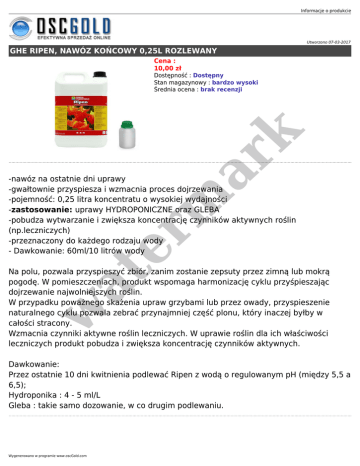 Informacje o produkcie Utworzono 07-03-2017 GHE RIPEN, NAWÓZ KOŃCOWY 0,25L ROZLEWANY Cena : 10,00 zł er m ar k Dostępność : Dostępny Stan magazynowy : bardzo wysoki Średnia ocena : brak recenzji -nawóz na ostatnie dni uprawy -gwałtownie przyspiesza i wzmacnia proces dojrzewania -pojemność: 0,25 litra koncentratu o wysokiej wydajności -zastosowanie: uprawy HYDROPONICZNE oraz GLEBA -pobudza wytwarzanie i zwiększa koncentrację czynników aktywnych roślin (np.leczniczych) -przeznaczony do każdego rodzaju wody - Dawkowanie: 60ml/10 litrów wody w at Na polu, pozwala przyspieszyć zbiór, zanim zostanie zepsuty przez zimną lub mokrą pogodę. W pomieszczeniach, produkt wspomaga harmonizację cyklu przyśpieszając dojrzewanie najwolniejszych roślin. W przypadku poważnego skażenia upraw grzybami lub przez owady, przyspieszenie naturalnego cyklu pozwala zebrać przynajmniej część plonu, który inaczej byłby w całości stracony. Wzmacnia czynniki aktywne roślin leczniczych. W uprawie roślin dla ich właściwości leczniczych produkt pobudza i zwiększa koncentrację czynników aktywnych. Dawkowanie: Przez ostatnie 10 dni kwitnienia podlewać Ripen z wodą o regulowanym pH (między 5,5 a 6,5); Hydroponika : 4 - 5 ml/L Gleba : takie samo dozowanie, w co drugim podlewaniu. Wygenerowano w programie www.oscGold.com