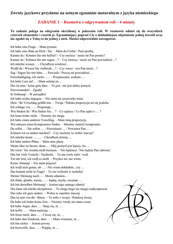 Zwroty językowe przydatne na ustnym egzaminie maturalnym z języka niemieckiego ZADANIE 1 – Rozmowa z odgrywaniem roli – 4 minuty To zadanie polega na odegraniu określonej w poleceniu roli. W rozmowie odnieś się do wszystkich czterech elementów i rozwiń je. Egzaminujący poprosi Cię o dokładniejsze objaśnienie jednej kwestii oraz nie zgodzi się z Tobą co do jednej z nich. Musisz odpowiednio zareagować. Ich habe eine Frage. – Mam pytanie. Ich habe eine Bitte an Dich / Sie. – Mam do Ciebie / Pani prośbę. Kannst du / Können Sie mir helfen? – Czy możesz / może mi Pan pomóc? Kannst du / Können Sie mir sagen…? – Czy możesz / może mi Pan powiedzieć…? Ich möchte wissen… - Chciałbym wiedzieć… Weiβt du / Wissen Sie vielleicht…? – Czy wiesz / wie Pan może…? Sag / Sagen Sie mir bitte… - Powiedz / Proszę mi powiedzieć… Entschuldigung, ich suche ….. – Przepraszam, szukam…. Ich habe Lust auf… - Mam ochotę na… Das ist eine / keine gute Idee. – To jest / nie jest dobry pomysł. Einverstanden! – Zgoda! In Ordnung! – W porządku! Ich habe nichts dagegen. – Nie mam nic przeciwko temu. Dein / Ihr Vorschlag gefällt mir. – Twoja / Pańska propozycja mi się podoba. Ich schlage vor, … - Proponuję… Wie findest du / Wie finden Sie… ? – Co sądzisz / Co Pan sądzi o … ? Ich kann leider nicht. – Niestety nie mogę. Ich habe einen anderen Vorschlag. – Mam inną propozycję. Wir müssen einen Kompromiss finden. – Musimy znaleźć kompromis. Du sollst… / Sie sollen … - Powinieneś … / Powinien Pan … Können wir es anders machen? – Czy możemy to zrobić inaczej? Ich möchte heute …….. – Chciałbym dzisiaj…. Ich habe andere Pläne. – Mam inne plany. Meine Idee ist besser, denn… - Mój pomysł jest lepszy, bo…. Du wirst / Sie werden nicht bereuen. – Nie będziesz / Nie będzie Pan żałować. Das hat viele Vorteile / Nachteile. – To ma wiele zalet / wad. Tut mir leid, ich weiβ es nicht. – Przykro mi, nie wiem. Keine Ahnung! – Nie mam pojęcia! Ich weiβ nich genau, ob … - Nie wiem dokładnie , czy … Das kommt nicht in Frage! – To nie wchodzi w rachubę! Meiner Meinung nach… – Moim zdaniem… Ich finde, glaube, meine, … - Sądzę, myślę, uważam … Ich bin derselben Meinung! – Jestem tego samego zdania! Das kann ich (nicht) akzeptieren. – To mogę (tego nie mogę) zaakceptować. Das sehe ich ganz anders. – Widzę to zupełnie inaczej. Das ist nett von dir / Ihnen. – To miło z twojej / Pańskiej strony. Da habe ich leider keine Zeit. – Niestety wtedy nie mam czasu. Ich habe Angst, dass … / Boję się, że … Ich hoffe, … - Mam nadzieję … Ich freue mich, dass … - Cieszę się, że … Ich habe den Eindruck, dass … - Mam wrażenie, że … Ich bin sicher. – Jestem pewny. Ich bezweifle, dass … - Wątpię, że … ZADANIE 2 – Opis ilustracji – 3 minuty To zadanie polega na opisaniu zdjęcia i udzieleniu odpowiedzi na trzy pytania egzaminującego. Pamiętaj! Opis musi zawierać trzy podstawowe elementy: Kto jest na obrazku? Gdzie się znajduje? Co robi? • Odpowiedź na pierwsze pytanie będzie wymagała interpretacji sytuacji przedstawionej na zdjęciu. • Odpowiadając na drugie pytanie związane z tematyką ilustracji musisz uwzględnić swoje zainteresowania, opinie, plany. • Odpowiedź na trzecie pytanie wymaga zrelacjonowania jakiegoś wydarzenia z przeszłości, a więc sprawdza umiejętność zastosowania przez Ciebie czasu przeszłego. Zwroty przydatne do opisu ilustracji Auf dem Bild / Foto sehe ich…….. – Na obrazku / zdjęciu widzę…………. Auf dem Bild / Foto kann man …….. sehen/erkennen – Na obrazku / zdjęciu można zobaczyć …………. Das Bild zeigt….. – Obrazek pokazuje…………. Das Bild stellt…………….dar. – Obrazek przedstawia……….. Im Vordergrund ist……… – Na pierwszym planie jest…………. Im Hintergrund befindet sich…….. – W tle znajduje się……….. Er/Sie scheint…………………zu sein. – On/ona wydaje się być……………. Er/Sie macht einen positiven/negativen Eindruck. – On/Ona robi pozytywne/negatywne wrażenie. Er/Sie sieht ……………aus. – On/ Ona wygląda………… Er/Sie ist/befindet sich/steht/sitzt/liegt…….. – On jest/znajduje się/stoi/siedzi/leży………… Meiner Meinung nach…………. – Moim zdaniem………………… Man hat den Eindruck, dass………….. – Ma się wrażenie, że…………. Ich denke/ glaube/ meine, dass………….. – Sądzę/ uważam, że …………….. Ich vermute, dass…………….. – Ja przypuszczam, że……………….. Vielleicht………. – Może……………. ZADANIE 3 – Wypowiedź na podstawie materiału stymulującego – 5 minut To zadanie składa się z dwóch części. W pierwszej musisz wybrać jedną z pokazanych ilustracji i uzasadnić swój wybór oraz podać powody, dla których odrzucasz pozostałe obrazki. Odnieś się więc krótko do wszystkich przedstawionych propozycji. Nie opisuj szczegółowo, skup się na argumentacji. W drugiej części egzaminator zada Ci dwa pytania luźno związane z tematyką przedstawioną w materiale stymulującym. Zwroty przydatne do argumentacji wyboru i odrzucenia Przegląd propozycji… określenie przedstawionego zagadnienia Ich habe zwei (drei, vier…) Plakate/ Fotos … zur Auswahl. Das sind Plakate/ Fotos von…. Es gibt/ Ich sehe zwei (drei …) Plakate/ Fotos Die Plakate/ Fotos zeigen / präsentieren/ stellen …dar Auf den Plakaten/ Auf den Fotos sind …. zu sehen. Plakat / Foto 1 zeigt …… Wybór jednej propozycji Am besten finde ich Plakat / Foto 1 Am besten passt meiner Meinung nach Plakat / Foto 1 Mich überzeugt am besten Plakat / Foto 1 Mit Sicherheit wähle ich Plakat / Foto 1 Ich würde mich für Plakat / Foto 1 entscheiden. Plakat / Foto 1 spricht das wichtigste Problem an. Uzasadnienie wyboru Mei