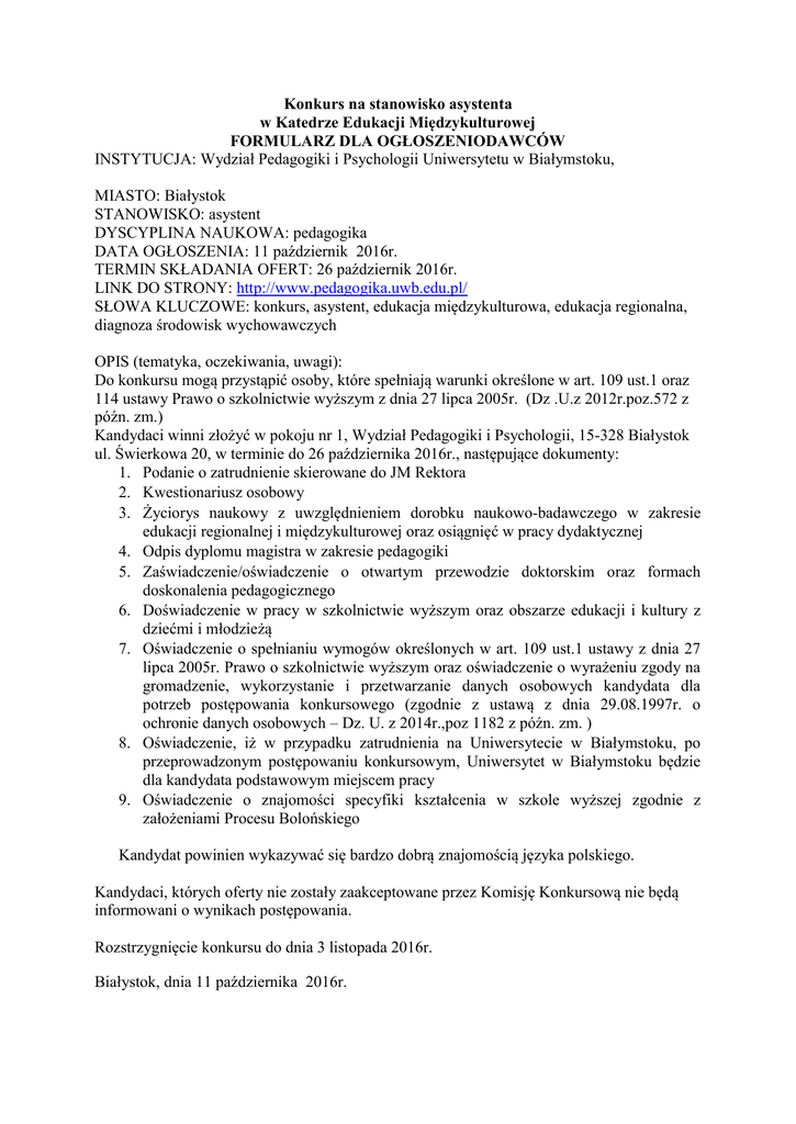 Konkurs na stanowisko asystenta w Katedrze Edukacji Międzykulturowej FORMULARZ DLA OGŁOSZENIODAWCÓW INSTYTUCJA: Wydział Pedagogiki i Psychologii Uniwersytetu w Białymstoku, MIASTO: Białystok STANOWISKO: asystent DYSCYPLINA NAUKOWA: pedagogika DATA OGŁOSZENIA: 11 październik 2016r. TERMIN SKŁADANIA OFERT: 26 październik 2016r. LINK DO STRONY: http://www.pedagogika.uwb.edu.pl/ SŁOWA KLUCZOWE: konkurs, asystent, edukacja międzykulturowa, edukacja regionalna, diagnoza środowisk wychowawczych OPIS (tematyka, oczekiwania, uwagi): Do konkursu mogą przystąpić osoby, które spełniają warunki określone w art. 109 ust.1 oraz 114 ustawy Prawo o szkolnictwie wyższym z dnia 27 lipca 2005r. (Dz .U.z 2012r.poz.572 z późn. zm.) Kandydaci winni złożyć w pokoju nr 1, Wydział Pedagogiki i Psychologii, 15-328 Białystok ul. Świerkowa 20, w terminie do 26 października 2016r., następujące dokumenty: 1. Podanie o zatrudnienie skierowane do JM Rektora 2. Kwestionariusz osobowy 3. Życiorys naukowy z uwzględnieniem dorobku naukowo-badawczego w zakresie edukacji regionalnej i międzykulturowej oraz osiągnięć w pracy dydaktycznej 4. Odpis dyplomu magistra w zakresie pedagogiki 5. Zaświadczenie/oświadczenie o otwartym przewodzie doktorskim oraz formach doskonalenia pedagogicznego 6. Doświadczenie w pracy w szkolnictwie wyższym oraz obszarze edukacji i kultury z dziećmi i młodzieżą 7. Oświadczenie o spełnianiu wymogów określonych w art. 109 ust.1 ustawy z dnia 27 lipca 2005r. Prawo o szkolnictwie wyższym oraz oświadczenie o wyrażeniu zgody na gromadzenie, wykorzystanie i przetwarzanie danych osobowych kandydata dla potrzeb postępowania konkursowego (zgodnie z ustawą z dnia 29.08.1997r. o ochronie danych osobowych – Dz. U. z 2014r.,poz 1182 z późn. zm. ) 8. Oświadczenie, iż w przypadku zatrudnienia na Uniwersytecie w Białymstoku, po przeprowadzonym postępowaniu konkursowym, Uniwersytet w Białymstoku będzie dla kandydata podstawowym miejscem pracy 9. Oświadczenie o znajomości specyfiki kształcenia w szkole wyższej zgodnie z założeniami Procesu Bolońskiego Kandydat powinien wykazywać się bardzo dobrą znajomością języka polskiego. Kandydaci, których oferty nie zostały zaakceptowane przez Komisję Konkursową nie będą informowani o wynikach postępowania. Rozstrzygnięcie konkursu do dnia 3 listopada 2016r. Białystok, dnia 11 października 2016r.