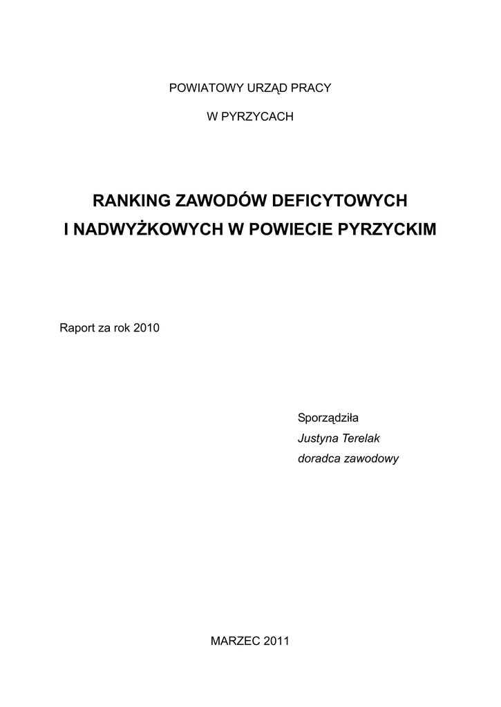 POWIATOWY URZĄD PRACY W PYRZYCACH RANKING ZAWODÓW DEFICYTOWYCH I NADWYŻKOWYCH W POWIECIE PYRZYCKIM Raport za rok 2010 Sporządziła Justyna Terelak doradca zawodowy MARZEC 2011 Niniejsze opracowanie stanowi raport z monitoringu zawodów deficytowych i nadwyżkowych w powiecie pyrzyckim w 2011 roku. CELE OPRACOWANIA Celem niniejszego opracowania jest zdiagnozowanie podaży i popytu siły roboczej w przekroju zawodów. Przedstawiona tu analiza jest źródłem informacji do: 1.Doskonalenia oferty edukacyjnej szkół powiatowych w celu dostosowania jej do potrzeb zmieniającego się rynku pracy. 2.Właściwego zaplanowania i prowadzenia działań przez samorząd na rzecz ograniczania rozmiarów bezrobocia w wymiarze lokalnym. 3.Odpowiedni dobór instrumentów rynku pracy do potrzeb pracodawców i osób bezrobotnych, a tym samym, prowadzenie racjonalnego i zgodnego z potrzebami rynku gospodarowania środkami Funduszu Pracy. 4.Sporządzenie wykazu zawodów deficytowych i nadwyżkowych w powiecie pyrzyckim. METODOLOGIA Raport opracowano na podstawie „Zaleceń metodycznych do prowadzenia monitoringu zawodów deficytowych i nadwyżkowych” opracowanego przez Ministerstwo Gospodarki, Pracy i Polityki Społecznej Departamentu Rynku Pracy, Warszawa 2003; w oparciu o sprawozdania MPiPS-01 (załącznik 2 i 3) – część diagnostyczna. CZĘŚĆ DIAGNOSTYCZNA Koniec roku 2010 przyniósł nieznaczny spadek liczby bezrobotnych w porównaniu z początkiem roku. W grudniu 2010 odnotowano 3709 osób. Najniższą stopę bezrobocia na przestrzeni całego 2010 roku odnotowano w miesiącu wrześniu – 23,9 %. W porównaniu z rokiem 2009, miniony rok zaznaczył się łagodną dynamiką zmian w zakresie kształtowania popytu i podaży na pracę. Wykres 1. i 2. Stopa bezrobocia na przestrzeni roku 2009 i 2010. Źródło: opracowanie własne PUP Pyrzyce. W ogólnej odnotowano 1907 liczbie kobiet bezrobotnych co zarejestrowanych stanowi 52% ogółu w końcu 2010r. zarejestrowanych. Wśród bezrobotnych powiatu pyrzyckiego 63% stanowią mieszkańcy wsi, z czego 53% stanowią kobiety. Osoby długotrwale bezrobotne stanowią 28% ogółu zarejestrowanych w końcu 2010r. Ustawa o promocji zatrudnienia i instytucjach rynku pracy wymienia grupy w szczególnej sytuacji na rynku pracy. Poniższy wykres prezentuje ilość bezrobotnych w poszczególnych grupach: Wykres 3. Ilość bezrobotnych w poszczególnych grupach w szczególnej sytuacji na rynku pracy w roku 2010. Źródło: opracowanie własne PUP Pyrzyce. ANALIZA BEZROBOCIA WEDŁUG ZAWODÓW W ROKU 2010 Najliczniejszą grupę stanowią bezrobotni sprzedawcy – 273 osoby, dalej murarze – 128 osób, na trzecim miejscu znajdują się ślusarze – 83 osoby. W porównaniu z rokiem 2009 czołówka trzech najliczniej reprezentowanych zawodów pozostaje bez zmian. Na wyższą pozycję przesunął się robotnik gospodarczy : w 2009 – 54 osoby, w 2010 – 72 osoby, pojawiły się nowe zawodowy, nieodnotowane w czołówce najliczniejszych w 2009. Są to: pozostali pracownicy przy pracach prostych, robotnik budowlany, kucharz małej gastronomii. Bezrobotni wg zawodów w powiecie pyrzyckim w II półroczu 2010r. 1 kod zawodu nazwa zawodu 522302 sprzedawca liczba bezrobotnych 273 2 711202 murarz 128 3 722204 ślusarz 83 4 311512 technik mechanizacji rolnictwa 79 5 331403 technik ekonomista 76 6 515303 robotnik gospodarczy 72 7 962990 pozostali pracownicy przy pracach prostych gdzie indziej niesklasyfikowani 67 8 931301 robotnik budowlany 61 9 723105 mechanik samochodów osobowych 60 10 753303 szwaczka 59 11 834101 kierowca ciągnika rolniczego 52 12 512002 kucharz małej gastronomii 51 13 314207 technik rolnik 50 14 753105 krawiec 50 Tabela 1. Bezrobotni wg zawodów w powiecie pyrzyckim w II półroczu 2010r. Źródło: T-II/P-1 Bezrobotni wg zawodów w powiecie pyrzyckim. Stan w końcu II półrocza 2010. Układ napływu bezrobotnych przedstawicieli poszczególnych zawodów w porównaniu z rokiem 2009 nie zmienił się znacząco. Niezmiennie na pierwszej pozycji jest sprzedawca, II – technik ekonomista (asystent ekonomiczny), III – murarz. Napływ bezrobotnych według zawodów w powiecie pyrzyckim w 2010 r. kod zawodu nazwa zawodu ilość bezrobotnych 1 522301 sprzedawca 203 2 331403 technik ekonomista 81 3 711202 murarz 71 4 722204 ślusarz 68 5 311512 technik mechanizacji rolnictwa 60 6 512002 kucharz małej gastronomii 56 7 515303 robotnik gospodarczy 49 8 723105 mechanik samochodów osobowych 48 9 931301 robotnik budowlany 42 pozostali pracownicy przy pracach 10 962990 11 311504 12 723103 13 322002 prostych gdzie indziej niesklasyfikowani 40 technik mechanik 40 mechanik pojazdów samochodowych 39 technik żywienia i gospodarstwa domowego 38 14 753303 szwaczka 38 15 753105 krawiec 37 Tabela 2. Napływ bezrobotnych wg zawodów w powiecie pyrzyckim w II półroczu 2010r. Źródło: T-II/P- 2 Napływ bezrobotnych wg zawodów w powiecie pyrzyckim w II półroczu 2010r; Poniższa tabela przedstawia procentowy udział długotrwale bezrobotnych w ogólnej liczbie reprezentantów najliczniejszych zawodów. Jak widać z poniższego zestawienia w roku 2010 najwięcej osób długotrwale bezrobotnych odnotowano w zawodzie palacz pieców – ponad połowa reprezentantów tego zawodu pozostaje w ewidencji Urzędu Pracy powyżej 12 miesięcy. W dalszej kolejności występuje robotnik gospodarczy i stolarz budowlany. Udział długotrwale bezrobotnych w ogólnej liczbie bezrobotnych według zawodów w roku 2010 nazwa zawodu udział długotrwale bezrobotnych [%] palacz pieców zwykłych 62 robotnik gospodarczy 46 stolarz budowlany 44 szwaczka 44 robotnik pomocniczy w przemyśle przetwórczym 43 technik prac biurowych 42 malarz budowlany 40 kierowca ciągnika rolniczego 39 robotnik budowlany 38 pozostali monterzy sprzętu elektrycznego 38 Tabela 3. Udział długotrwale bezrobotnych w ogólnej liczbie bezrobotnych według zawodów w II półroczu 2010. Źródło: opracowanie własne