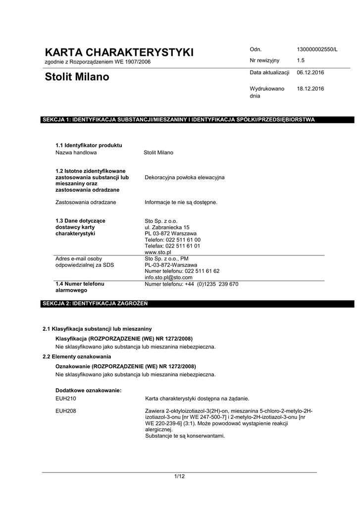 Odn. 130000002550/L zgodnie z Rozporządzeniem WE 1907/2006 Nr rewizyjny 1.5 Stolit Milano Data aktualizacji 06.12.2016 Wydrukowano dnia 18.12.2016 KARTA CHARAKTERYSTYKI SEKCJA 1: IDENTYFIKACJA SUBSTANCJI/MIESZANINY I IDENTYFIKACJA SPÓŁKI/PRZEDSIĘBIORSTWA 1.1 Identyfikator produktu Nazwa handlowa 1.2 Istotne zidentyfikowane zastosowania substancji lub mieszaniny oraz zastosowania odradzane Stolit Milano Dekoracyjna powłoka elewacyjna Zastosowania odradzane Informacje te nie są dostępne. 1.3 Dane dotyczące dostawcy karty charakterystyki Sto Sp. z o.o. ul. Zabraniecka 15 PL 03-872 Warszawa Telefon: 022 511 61 00 Telefax: 022 511 61 01 www.sto.pl Sto Sp. z o.o., PM PL-03-872-Warszawa Numer telefonu: 022 511 61 62 [email protected] Numer telefonu: +44 (0)1235 239 670 Adres e-mail osoby odpowiedzialnej za SDS 1.4 Numer telefonu alarmowego SEKCJA 2: IDENTYFIKACJA ZAGROŻEŃ 2.1 Klasyfikacja substancji lub mieszaniny Klasyfikacja (ROZPORZĄDZENIE (WE) NR 1272/2008) Nie sklasyfikowano jako substancja lub mieszanina niebezpieczna. 2.2 Elementy oznakowania Oznakowanie (ROZPORZĄDZENIE (WE) NR 1272/2008) Nie sklasyfikowano jako substancja lub mieszanina niebezpieczna. Dodatkowe oznakowanie: EUH210 Karta charakterystyki dostępna na żądanie. EUH208 Zawiera 2-oktyloizotiazol-3(2H)-on, mieszanina 5-chloro-2-metylo-2Hizotiazol-3-onu [nr WE 247-500-7] i 2-metylo-2H-izotiazol-3-onu [nr WE 220-239-6] (3:1). Może powodować wystąpienie reakcji alergicznej. Substancje te są konserwantami. 1/12 KARTA CHARAKTERYSTYKI zgodnie z Rozporządzeniem WE 1907/2006 Stolit Milano Rozporządzenie ws. produktów biobójczych (528/2012): Zawiera diuron (ISO) , 2-oktyloizotiazol-3(2H)-on, mieszanina 5-chloro-2-metylo-2Hizotiazol-3-onu [nr WE 247-500-7] i 2-metylo-2H-izotiazol-3-onu [nr WE 220-239-6] (3:1). Jako substancje czynne do ochrony powłok oraz na czas przechowywania zgodnie z rozporządzeniem w sprawie produktów biobójczych (528/2012), artykuł 58(3) 2.3 Inne zagrożenia Wyniki oceny właściwości PBT i vPvB Nie dotyczy SEKCJA 3: SKŁAD/INFORMACJA O SKŁADNIKACH 3.2 Mieszaniny Typ związku wodorozcienczalny tynk na bazie zywicy syntetycznej Składniki niebezpieczne Uwagi : Brak składników niebezpiecznych SEKCJA 4: ŚRODKI PIERWSZEJ POMOCY 4.1 Opis środków pierwszej pomocy Informacje ogólne W razie wypadku lub złego samopoczucia zasięgnąć natychmiast porady lekarza (w miarę możliwości pokazać etykietę). Nieprzytomnej osobie nigdy nie podawać nic doustnie. Osobie nieprzytomnej zapewnić wygodną pozycję i zasięgnąć porady medycznej. Wdychanie Wynieść na świeże powietrze. Zapewnić poszkodowanemu ciepło i spokój. W przypadku nieregularnego lub zatrzymanego oddechu zastosować sztuczne oddychanie. Jeśli objawy utrzymują się, wezwać lekarza. Kontakt przez skórę Natychmiast zdjąć skażone ubranie. Zmyć starannie skórę wodą z mydłem lub zastosować znane środki zmywające. NIE stosować rozpuszczalników lub rozcieñczalników. Jeśli utrzymują się podrażnienia skóry, wezwać lekarza. Kontakt z oczami W przypadku kontaktu z oczami usunąć szkła kontaktowe i natychmiast wypłukać oczy dużą ilością wody, również pod powiekami, przez co najmniej 15 minut. Zasięgnąć porady medycznej. Połknięcie Przemyć usta wodą i następnie wypić dużą ilość wody. 2/12 KARTA CHARAKTERYSTYKI zgodnie z Rozporządzeniem WE 1907/2006 Stolit Milano NIE prowokować wymiotów. Uzyskać pomoc lekarską. Pozostawić. 4.2 Najważniejsze ostre i opóźnione objawy oraz skutki narażenia Objawy Brak dostępnej informacji. 4.3 Wskazania dotyczące wszelkiej natychmiastowej pomocy lekarskiej i szczególnego postępowania z poszkodowanym Leczenie Leczenie objawowe. Brak dostępnej informacji. SEKCJA 5: POSTĘPOWANIE W PRZYPADKU POŻARU 5.1 Środki gaśnicze Odpowiednie środki gaśnicze Piana odporna na alkohole Dwutlenek węgla (CO2) Suche proszki gaśnicze Aerozol wodny Niewłaściwe środki gaśnicze Silny strumień wody 5.2 Szczególne zagrożenia związane z substancją lub mieszaniną Ogień może spowodować wydzielanie: Tlenek węgla Dwutlenek węgla (CO2) Tlenki azotu (NOx) Narażenie na działanie produktów rozkładu może zagrażać zdrowiu. 5.3 Informacje dla straży pożarnej W razie konieczności w trakcie akcji gaśniczej założyć aparat oddechowy z zamkniętym obiegiem. Porady dodatkowe Dla chłodzenia nieotwartych pojemników stosować rozpylony strumień wody. Pozostałości po pożarze i zanieczyszczona woda gaśnicza muszą być usunięte zgodnie z lokalnymi przepisami. SEKCJA 6: POSTĘPOWANIE W PRZYPADKU NIEZAMIERZONEGO UWOLNIENIA DO ŚRODOWISKA 6.1 Indywidualne środki ostrożności, sprzęt ochronny i procedury w sytuacjach awaryjnych 6.2 Środki ostrożności w zakresie ochrony środowiska Zapewnić wystarczającą wentylację. Nie wdychać pary. 6.3 Metody i materiały zapobiegające rozprzestrzenianiu się Zebrać wyciek w niepalny materiał absorbujący (ziemię, piasek, ziemię okrzemkową, wermikulit) i umieścić w zbiorniku do utylizacji zgodnie z lokalnymi/krajowymi przepisami (patrz w sekcji 13). Produkt nie powinien przedostawać się do sieci wodnej lub kanalizacyjnej oraz gleby. W przypadku skażenia produktem rzek, jezior lub ścieków powiadomić odpowiednie władze. 3/12 KARTA CHARAKTERYSTYKI zgodnie z Rozporządzeniem WE 1907/2006 Stolit Milano skażenia i służące do usuwania skażenia Czyścić detergentami. Unikać rozpuszczalników. Material skazony usunac jako odpad wg punktu 13. Dokładnie czyścić skażone powierzchnie. 6.4 Odniesienia do innych sekcji Sprawdź środki ochronne w sekcjach 7 i 8. SEKCJA 7: POSTĘPOWANIE Z SUBSTANCJAMI I MIESZANINAMI ORAZ ICH MAGAZYNOWANIE 7.1 Środki ostrożności dotyczące bezpiecznego postępowania Wskazówki dotyczące bezpiecznego posługiwania się Unikać zanieczyszczenia skóry i oczu. Chronić przed dostępem osób niepowołanych. Zapewnić wystarczającą ilość powietrza i/lub wenty