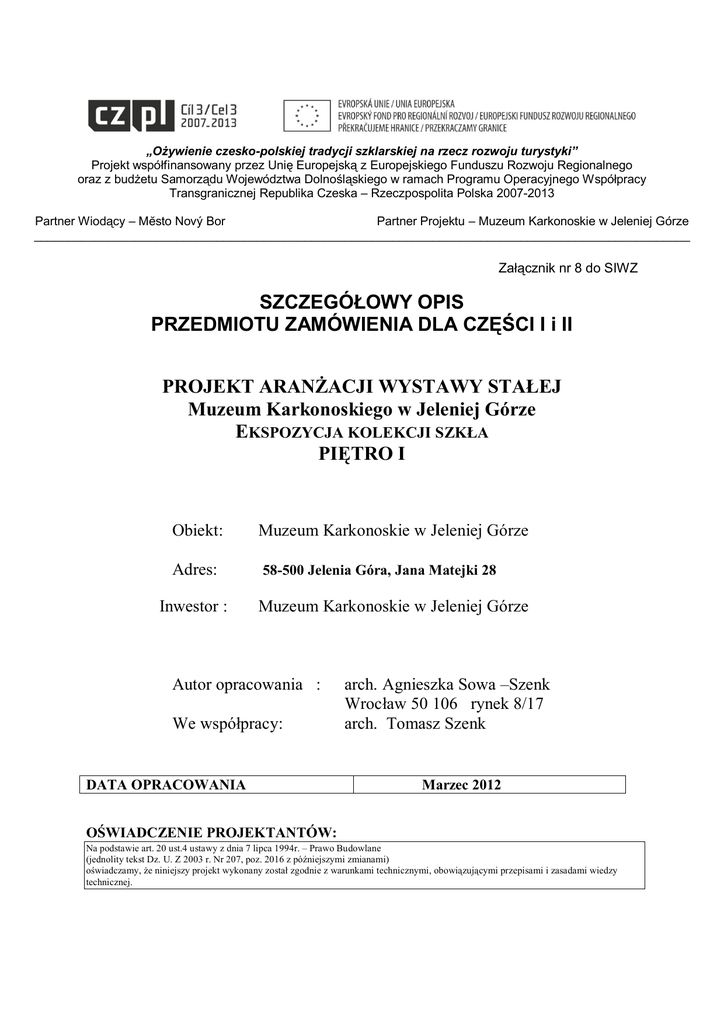„Ożywienie czesko-polskiej tradycji szklarskiej na rzecz rozwoju turystyki” Projekt współfinansowany przez Unię Europejską z Europejskiego Funduszu Rozwoju Regionalnego oraz z budżetu Samorządu Województwa Dolnośląskiego w ramach Programu Operacyjnego Współpracy Transgranicznej Republika Czeska – Rzeczpospolita Polska 2007-2013 Partner Wiodący – Mĕsto Nový Bor Partner Projektu – Muzeum Karkonoskie w Jeleniej Górze _________________________________________________________________________________________________ Załącznik nr 8 do SIWZ SZCZEGÓŁOWY OPIS PRZEDMIOTU ZAMÓWIENIA DLA CZĘŚCI I i II PROJEKT ARANŻACJI WYSTAWY STAŁEJ Muzeum Karkonoskiego w Jeleniej Górze EKSPOZYCJA KOLEKCJI SZKŁA PIĘTRO I Obiekt: Muzeum Karkonoskie w Jeleniej Górze Adres: 58-500 Jelenia Góra, Jana Matejki 28 Inwestor : Muzeum Karkonoskie w Jeleniej Górze Autor opracowania : We współpracy: DATA OPRACOWANIA arch. Agnieszka Sowa –Szenk Wrocław 50 106 rynek 8/17 arch. Tomasz Szenk Marzec 2012 OŚWIADCZENIE PROJEKTANTÓW: Na podstawie art. 20 ust.4 ustawy z dnia 7 lipca 1994r. – Prawo Budowlane (jednolity tekst Dz. U. Z 2003 r. Nr 207, poz. 2016 z późniejszymi zmianami) oświadczamy, że niniejszy projekt wykonany został zgodnie z warunkami technicznymi, obowiązującymi przepisami i zasadami wiedzy technicznej. Nr str. 1 2 SPIS ZAWARTOŚCI PROJEKTU Strona tytułowa Spis zawartości projektu A. CZĘŚĆ OPISOWA 1. Przeznaczenie i program użytkowy 2. Forma architektoniczna i funkcja 3. Rozwiązania materiałowe 4. Specyfikacja techniczna urządzeń B. KOSZTORYS SZACUNKOWY C. CZĘŚĆ GRAFICZNA: Rys Nr Nazwa 1 Piętro I, Układ zabudowy ekspozycyjnej 2 Piętro I, Gablota G01 3 Piętro I, Gablota G2a 4 Piętro I, Gablota G2b 5 Piętro I, Gablota G03 6 Piętro I, Gablota G04 7 Piętro I, Gablota G05 - rzut, przekrój AA, widok 1 8 Piętro I, Gablota G05 - widok 2, aksonometria 9 Piętro I, Gablota G06 10 Piętro I, Gablota G06, przekrój AA, aksonometria 11 Piętro I, Podest ekspozycyjny P1, P2, rzut, przekrój aa, aksonometria 12 Piętro I, Układ tematyczny ekspozycji 13 Piętro I, Rozmieszczenie sprzętu multimedialnego 3 3 4 9 13 Skala 1:100 1:50 1:25 1:25 1:25 1:25 1:25 1:25 1:25 1:25 1:25 bezskalowy bezskalowy 1. DANE OGÓLNE 1.1 OBIEKT: Sala wystawowa na piętrze Muzeum 2 1.2 Powierzchnia opracowania około 430m 2. ZAKRES I PODSTAWA OPRACOWANIA Zakresem opracowania jest: Projekt aranżacji wystawy stałej Muzeum Karkonoskiego w Jeleniej Górze- ekspozycja kolekcji szkła - PIĘTRO I Podstawami opracowania są: - Scenariusz merytoryczny Projekt koncepcji wystawy stałej A. CZĘŚĆ OPISOWA: 1. PRZEZNACZENIE I PROGRAM UZYTKOWY Zakres wystawy obejmuje ekspozycje szkła historycznego i współczesnego. Sala dostępna jest z klatki schodowej łączącej ją z pozostałymi poziomami muzeum. Zakłada się iż wejście główne na wystawę stanowi klatka schodowa oraz winda umieszczona w centralnej części pomieszczenia ,co zapewni bezkolizyjny dostęp zwiedzającym z dysfunkcją ruchu. Opierając się na wytycznych Inwestora zaplanowano przeznaczenie sali 1 piętra na cele ekspozycyjne dostosowane do organizacji wystawy stałej. Wystawa posiadać będzie elementy o charakterze multimedialnym – wplecione w ekspozycję eksponatów. Ścieżka zwiedzania wyznacza chronologiczny układ ekspozycji . 2. FORMA ARCHITEKTONICZNA I FUNKCJA Aranżacja wystaw wykorzystuje architektoniczny układ przestrzeni sal. Ściany i sufity wykończone będą w tonacji jasnej. Eksponaty zabytkowe eksponowane będą w przestrzennych gablotach wyposażony w system półek szklanych oraz oświetlenie górne(reflektorki LED z regulacją kąta świecenia), natomiast współczesne na otwartych podestach ekspozycyjnych z wbudowanym oświetleniem w kloszach powierzchni wystawienniczej, dodatkowo oświetlonych światłem ze źródeł zewnętrznych. Informacja wizualna zostanie opracowana jako prezentacja multimedialna i w formie graficznej w postaci drukowanych na foliach transparentnych graficznych kolaży. Narracja wystawy oparta zostanie na zastosowaniu urządzeń multimedialnych - infomatów, dzięki czemu możliwe będzie przeprowadzenie po Galerii - każdego z typów odbiorcy. Dzieci stanowią specyficzną grupę odbiorców i dla nich planuje się zamieścić specjalne zaprogramowane quizy – dostępne poprzez interaktywny ekran LCD, opatrzony narracją zrozumiałą przez najmłodszych. 3. ROZWIĄZANIA MATERIAŁOWE. Sprzęt ekspozycyjny Lp. Przedmiot Wymagane warunki 1 Konstrukcja nośna gabloty wykonana jest z kształtowników stalowych, do których mocowane jest poszycie wewnętrzne gabloty. Konstrukcja jest spawana / skręcana i lakierowana proszkowo. Elementy konstrukcyjne mocowane są do ścian wewnętrznych budynku za pomocą odpowiednich kołków rozporowych z wyjątkiem gabloty G6 - wolnostojącej. GABLOTA G01 – G06 Poszycie wewnętrzne: tył, góra, dół a w gablotach 01,02,03 także boki wykonane są z paneli z blachy stalowej lub aluminiowej o grubości 1,5 - 2 mm, lakierowanych proszkowo. W dolnej okładzinie dodatkowo płyty ze szkła mlecznego 4.4.1 z możliwością podświetlenia od spodu. Elementy z blachy mocowane są do konstrukcji elementami mocującymi niewidocznymi wewnątrz gabloty. Poszycie zewnętrzne postumentów gablot wykonane jest z blachy stalowej lub aluminiowej o grubości 1,5 – 2 mm, lakierowanej proszkowo. Front gabloty i boki w gablotach 04,05,06 wykonane ze szkła bezpiecznego laminowanego 44.1 (grubość dwóch warstw szkła – każda po 4 mm plus folia PVB służąca do laminowania szkła). Krawędzie łączenia szkła zacinane są pod kątem 45 stopni i poddane obróbce polerowania . Nie dopuszcza się stosowania profili aluminiowych na pionowych krawędziach łączenia szkła. Krawędzie łączenia są uszczelnione trwale zamocowaną bezbarwną uszczelką silikonową. Elementy szklane korpusu gabloty są mocowane do profili nośnych górnych i dolnych mo