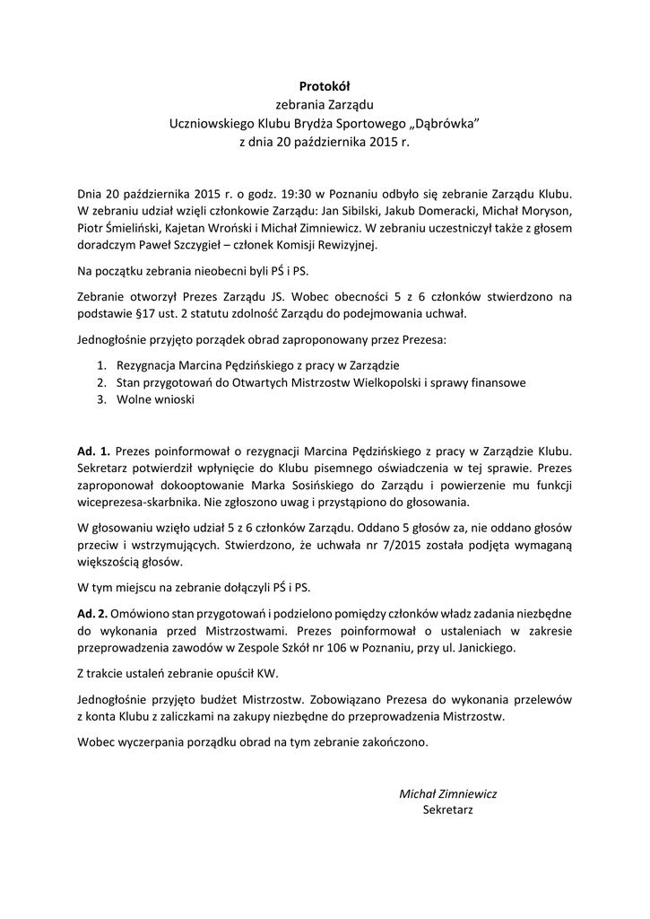 Protokół zebrania Zarządu Uczniowskiego Klubu Brydża Sportowego „Dąbrówka” z dnia 20 października 2015 r. Dnia 20 października 2015 r. o godz. 19:30 w Poznaniu odbyło się zebranie Zarządu Klubu. W zebraniu udział wzięli członkowie Zarządu: Jan Sibilski, Jakub Domeracki, Michał Moryson, Piotr Śmieliński, Kajetan Wroński i Michał Zimniewicz. W zebraniu uczestniczył także z głosem doradczym Paweł Szczygieł – członek Komisji Rewizyjnej. Na początku zebrania nieobecni byli PŚ i PS. Zebranie otworzył Prezes Zarządu JS. Wobec obecności 5 z 6 członków stwierdzono na podstawie §17 ust. 2 statutu zdolność Zarządu do podejmowania uchwał. Jednogłośnie przyjęto porządek obrad zaproponowany przez Prezesa: 1. Rezygnacja Marcina Pędzińskiego z pracy w Zarządzie 2. Stan przygotowań do Otwartych Mistrzostw Wielkopolski i sprawy finansowe 3. Wolne wnioski Ad. 1. Prezes poinformował o rezygnacji Marcina Pędzińskiego z pracy w Zarządzie Klubu. Sekretarz potwierdził wpłynięcie do Klubu pisemnego oświadczenia w tej sprawie. Prezes zaproponował dokooptowanie Marka Sosińskiego do Zarządu i powierzenie mu funkcji wiceprezesa-skarbnika. Nie zgłoszono uwag i przystąpiono do głosowania. W głosowaniu wzięło udział 5 z 6 członków Zarządu. Oddano 5 głosów za, nie oddano głosów przeciw i wstrzymujących. Stwierdzono, że uchwała nr 7/2015 została podjęta wymaganą większością głosów. W tym miejscu na zebranie dołączyli PŚ i PS. Ad. 2. Omówiono stan przygotowań i podzielono pomiędzy członków władz zadania niezbędne do wykonania przed Mistrzostwami. Prezes poinformował o ustaleniach w zakresie przeprowadzenia zawodów w Zespole Szkół nr 106 w Poznaniu, przy ul. Janickiego. Z trakcie ustaleń zebranie opuścił KW. Jednogłośnie przyjęto budżet Mistrzostw. Zobowiązano Prezesa do wykonania przelewów z konta Klubu z zaliczkami na zakupy niezbędne do przeprowadzenia Mistrzostw. Wobec wyczerpania porządku obrad na tym zebranie zakończono. Michał Zimniewicz Sekretarz Uchwała nr 7/2015 Zarządu Uczniowskiego Klubu Brydża Sportowego „Dąbrówka” z dnia 20 października 2015 r. w sprawie kooptacji Zarządu W związku z rezygnacją Marcina Pędzińskiego z funkcji członka Zarządu, na podstawie § 17 ust. 3 oraz § 22 ust. 4 statutu uchwala się, co następuje: § 1. Zarząd powołuje Marka Sosińskiego do pełnienia funkcji członka Zarządu oraz funkcji wiceprezesa-skarbnika. § 2. Uchwała wchodzi w życie z dniem podjęcia. W głosowaniu wzięło udział 5 z 6 członków Zarządu. Oddano 5 głosów za, nie oddano głosów przeciw i wstrzymujących. Michał Zimniewicz Jan Sibilski Sekretarz Prezes