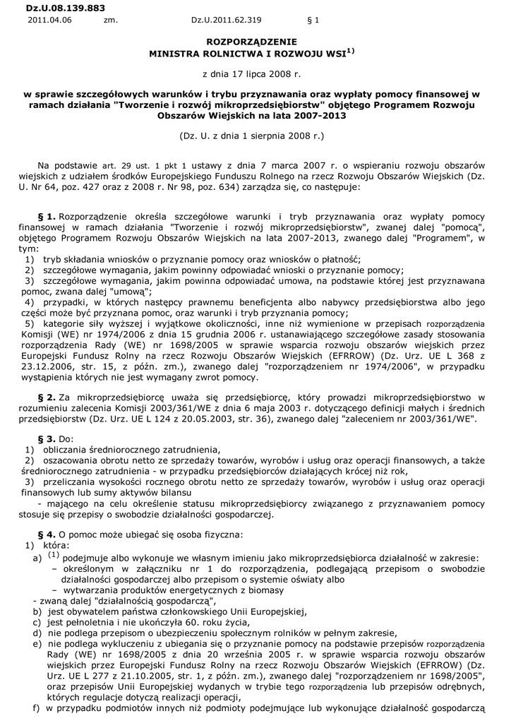 Dz.U.08.139.883 2011.04.06 zm. Dz.U.2011.62.319 §1 ROZPORZĄDZENIE MINISTRA ROLNICTWA I ROZWOJU WSI1) z dnia 17 lipca 2008 r. w sprawie szczegółowych warunków i trybu przyznawania oraz wypłaty pomocy finansowej w ramach działania "Tworzenie i rozwój mikroprzedsiębiorstw" objętego Programem Rozwoju Obszarów Wiejskich na lata 2007-2013 (Dz. U. z dnia 1 sierpnia 2008 r.) Na podstawie art. 29 ust. 1 pkt 1 ustawy z dnia 7 marca 2007 r. o wspieraniu rozwoju obszarów wiejskich z udziałem środków Europejskiego Funduszu Rolnego na rzecz Rozwoju Obszarów Wiejskich (Dz. U. Nr 64, poz. 427 oraz z 2008 r. Nr 98, poz. 634) zarządza się, co następuje: § 1. Rozporządzenie określa szczegółowe warunki i tryb przyznawania oraz wypłaty pomocy finansowej w ramach działania "Tworzenie i rozwój mikroprzedsiębiorstw", zwanej dalej "pomocą", objętego Programem Rozwoju Obszarów Wiejskich na lata 2007-2013, zwanego dalej "Programem", w tym: 1) tryb składania wniosków o przyznanie pomocy oraz wniosków o płatność; 2) szczegółowe wymagania, jakim powinny odpowiadać wnioski o przyznanie pomocy; 3) szczegółowe wymagania, jakim powinna odpowiadać umowa, na podstawie której jest przyznawana pomoc, zwana dalej "umową"; 4) przypadki, w których następcy prawnemu beneficjenta albo nabywcy przedsiębiorstwa albo jego części moŜe być przyznana pomoc, oraz warunki i tryb przyznania pomocy; 5) kategorie siły wyŜszej i wyjątkowe okoliczności, inne niŜ wymienione w przepisach rozporządzenia Komisji (WE) nr 1974/2006 z dnia 15 grudnia 2006 r. ustanawiającego szczegółowe zasady stosowania rozporządzenia Rady (WE) nr 1698/2005 w sprawie wsparcia rozwoju obszarów wiejskich przez Europejski Fundusz Rolny na rzecz Rozwoju Obszarów Wiejskich (EFRROW) (Dz. Urz. UE L 368 z 23.12.2006, str. 15, z późn. zm.), zwanego dalej "rozporządzeniem nr 1974/2006", w przypadku wystąpienia których nie jest wymagany zwrot pomocy. § 2. Za mikroprzedsiębiorcę uwaŜa się przedsiębiorcę, który prowadzi mikroprzedsiębiorstwo w rozumieniu zalecenia Komisji 2003/361/WE z dnia 6 maja 2003 r. dotyczącego definicji małych i średnich przedsiębiorstw (Dz. Urz. UE L 124 z 20.05.2003, str. 36), zwanego dalej "zaleceniem nr 2003/361/WE". § 3. Do: 1) obliczania średniorocznego zatrudnienia, 2) oszacowania obrotu netto ze sprzedaŜy towarów, wyrobów i usług oraz operacji finansowych, a takŜe średniorocznego zatrudnienia - w przypadku przedsiębiorców działających krócej niŜ rok, 3) przeliczania wysokości rocznego obrotu netto ze sprzedaŜy towarów, wyrobów i usług oraz operacji finansowych lub sumy aktywów bilansu - mającego na celu określenie statusu mikroprzedsiębiorcy związanego z przyznawaniem pomocy stosuje się przepisy o swobodzie działalności gospodarczej. 1) § 4. O pomoc moŜe ubiegać się osoba fizyczna: która: a) (1) podejmuje albo wykonuje we własnym imieniu jako mikroprzedsiębiorca działalność w zakresie: – określonym w załączniku nr 1 do rozporządzenia, podlegającą przepisom o swobodzie działalności gospodarczej albo przepisom o systemie oświaty albo – wytwarzania produktów energetycznych z biomasy - zwaną dalej "działalnością gospodarczą", b) jest obywatelem państwa członkowskiego Unii Europejskiej, c) jest pełnoletnia i nie ukończyła 60. roku Ŝycia, d) nie podlega przepisom o ubezpieczeniu społecznym rolników w pełnym zakresie, e) nie podlega wykluczeniu z ubiegania się o przyznanie pomocy na podstawie przepisów rozporządzenia Rady (WE) nr 1698/2005 z dnia 20 września 2005 r. w sprawie wsparcia rozwoju obszarów wiejskich przez Europejski Fundusz Rolny na rzecz Rozwoju Obszarów Wiejskich (EFRROW) (Dz. Urz. UE L 277 z 21.10.2005, str. 1, z późn. zm.), zwanego dalej "rozporządzeniem nr 1698/2005", oraz przepisów Unii Europejskiej wydanych w trybie tego rozporządzenia lub przepisów odrębnych, których regulacje dotyczą realizacji operacji, f) w przypadku podmiotów innych niŜ podmioty podejmujące lub wykonujące działalność gospodarczą obejmującą świadczenie usług dla gospodarstw rolnych lub leśnictwa, ma miejsce zamieszkania w miejscowości naleŜącej do gminy: – wiejskiej lub – miejsko-wiejskiej, z wyłączeniem miast liczących powyŜej 5 tys. mieszkańców, lub – miejskiej, z wyłączeniem miejscowości liczących powyŜej 5 tys. mieszkańców, g) w przypadku podmiotów podejmujących lub wykonujących działalność gospodarczą obejmującą świadczenie usług dla gospodarstw rolnych lub leśnictwa, ma miejsce zamieszkania na obszarach wiejskich, to jest w miejscowości naleŜącej do gminy: – wiejskiej lub – miejsko-wiejskiej, z wyłączeniem miast liczących powyŜej 20 tys. mieszkańców, lub – miejskiej, z wyłączeniem miejscowości liczących powyŜej 5 tys. mieszkańców; 2) (2) której, w okresie ostatnich 2 lat poprzedzających złoŜenie wniosku o przyznanie pomocy, nie przyznano pomocy inwestycyjnej w ramach działania "Wsparcie oraz promocja przedsiębiorczości i samozatrudnienie" samozatrudnienia" objętego Programem Operacyjnym "Kapitał Ludzki, 2007-2013". § 4a. (3) Warunek dotyczący podejmowania wykonywania działalności gospodarczej, o którym mowa w § 4 pkt 1 lit. a, uwaŜa się za spełniony, jeŜeli w okresie ostatnich 12 miesięcy poprzedzających dzień złoŜenia wniosku o przyznanie pomocy podmiot podejmujący wykonywanie działalności gospodarczej nie był wpisany do ewidencji działalności gospodarczej albo ewidencji prowadzonej przez jednostkę samorządu terytorialnego obowiązaną do prowadzenia odpowiedniego typu szkół i placówek publicznych. § 5. JeŜeli operacja, którą zamierza realizować podmiot, o którym mowa w § 4, jest związana z budową, przebudową, remontem połączonym z modernizacją, wyposaŜeniem lub zagospodarowaniem nieruchomości objętej operacją, miejsce połoŜenia tej nieruchomości powinno znajdować się: 1) w p