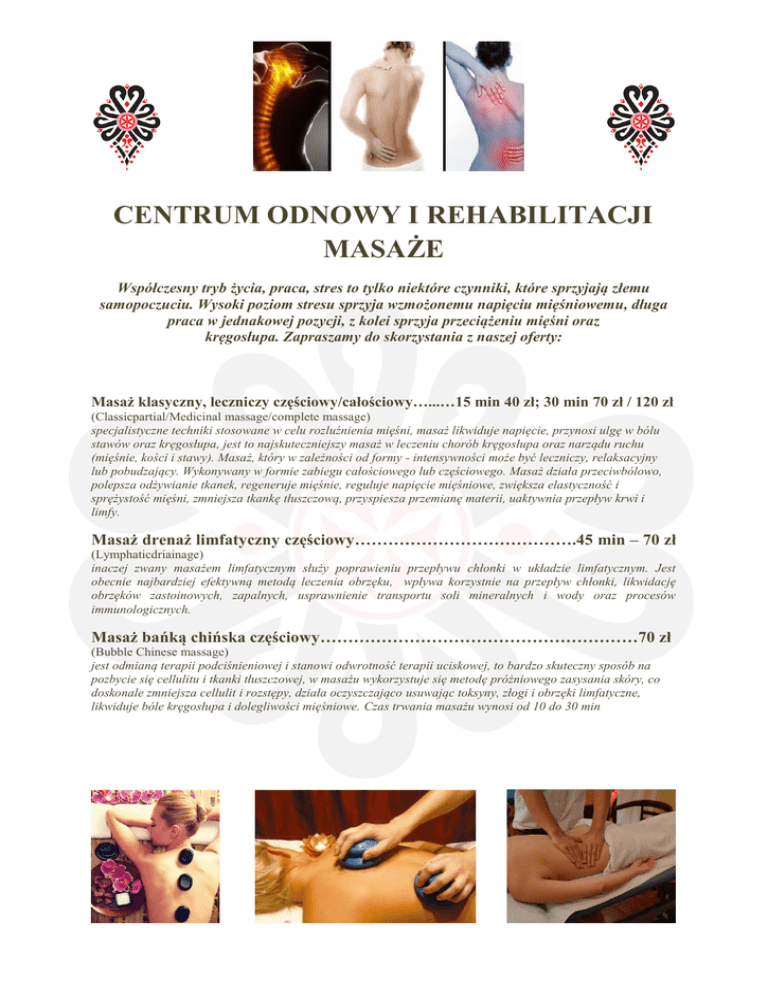 CENTRUM ODNOWY I REHABILITACJI MASAŻE Współczesny tryb życia, praca, stres to tylko niektóre czynniki, które sprzyjają złemu samopoczuciu. Wysoki poziom stresu sprzyja wzmożonemu napięciu mięśniowemu, długa praca w jednakowej pozycji, z kolei sprzyja przeciążeniu mięśni oraz kręgosłupa. Zapraszamy do skorzystania z naszej oferty: Masaż klasyczny, leczniczy częściowy/całościowy…...…15 min 40 zł; 30 min 70 zł / 120 zł (Classicpartial/Medicinal massage/complete massage) specjalistyczne techniki stosowane w celu rozluźnienia mięśni, masaż likwiduje napięcie, przynosi ulgę w bólu stawów oraz kręgosłupa, jest to najskuteczniejszy masaż w leczeniu chorób kręgosłupa oraz narządu ruchu (mięśnie, kości i stawy). Masaż, który w zależności od formy - intensywności może być leczniczy, relaksacyjny lub pobudzający. Wykonywany w formie zabiegu całościowego lub częściowego. Masaż działa przeciwbólowo, polepsza odżywianie tkanek, regeneruje mięśnie, reguluje napięcie mięśniowe, zwiększa elastyczność i sprężystość mięśni, zmniejsza tkankę tłuszczową, przyspiesza przemianę materii, uaktywnia przepływ krwi i limfy. Masaż drenaż limfatyczny częściowy………………………………….45 min – 70 zł (Lymphaticdriainage) inaczej zwany masażem limfatycznym służy poprawieniu przepływu chłonki w układzie limfatycznym. Jest obecnie najbardziej efektywną metodą leczenia obrzęku, wpływa korzystnie na przepływ chłonki, likwidację obrzęków zastoinowych, zapalnych, usprawnienie transportu soli mineralnych i wody oraz procesów immunologicznych. Masaż bańką chińska częściowy…………………………………………………70 zł (Bubble Chinese massage) jest odmianą terapii podciśnieniowej i stanowi odwrotność terapii uciskowej, to bardzo skuteczny sposób na pozbycie się cellulitu i tkanki tłuszczowej, w masażu wykorzystuje się metodę próżniowego zasysania skóry, co doskonale zmniejsza cellulit i rozstępy, działa oczyszczająco usuwając toksyny, złogi i obrzęki limfatyczne, likwiduje bóle kręgosłupa i dolegliwości mięśniowe. Czas trwania masażu wynosi od 10 do 30 min Masaż relaksacyjny gorącymi kamieniami częściowy / całościowy…80 zł / 140 zł (Stones massage) jest świetnym sposobem walki ze wzmożonym napięciem mięśni, przywraca równowagę ciała i umysłu, działa na cały organizm. Skóra po masażu jest lepiej ukrwiona, odżywiona i dotleniona, zyskuje elastyczność i jędrność. W mięśniach wyrównuje się napięcie, są one bardziej elastyczne, a po długotrwałym wysiłku szybciej się regenerują. W układzie krwionośnym i limfatycznym poprawia się przepływ, ulepszony jest odpływ krwi żylnej i praca serca. Masaż gorącymi kamieniami zmniejsza stres, działa uspokajająco i przeciwbólowo a nawet pomaga w walce z bezsennością. Masaż relaksacyjny częściowy/całościowy……………………………80 zł / 130 zł (Relaxing massage) Żyjąc w codziennym stresie z pewnością niejeden człowiek szuka uspokojenia i odprężenia dla ciała i duszy. Medycyna naturalna zna doskonały sposób na wewnętrzne wyciszenie- jest nim masaż relaksacyjny. Głównym celem masażu relaksacyjnego jest zmniejszenie lub zniesienie napięcia mięśniowego, które powstało na skutek stresu, wysiłku. Masaż ten bazuje na chwytach oraz technikach, które wpływają kojąco na organizm. Masaż relaksacyjny może być wykorzystywany jako profilaktyka stresu, nauka prawidłowego oddechu oraz relaksacji. Masaż antycellulitowy………………………………………………150 zł (Anti-cellulite massage) zadaniem tego rodzaju masażu jest rozbicie i rozdrobnienie podskórnej tkanki tłuszczowej, usunięcie toksyn z organizmu, polepszenie ukrwienia skóry i mięśni, przez co przyspiesza się przemianę materii, używa się kremów zawierających substancje roślinne, stymulujące metabolizm komórek, likwidujące tkankę tłuszczową oraz ułatwiające usuwanie toksyn i nadmiaru wody. W czasie serii zabiegów odchudzających wskazane jest wykonywanie ćwiczeń oraz przestrzeganie odpowiedniej diety. TERAPIA MANUALNA W MODELU HOLISTYCZNYM jest to system zajmujący się leczeniem zaburzeń czynności narządu ruchu., który jest sferą integrującą osobowość człowieka. W następstwie zaburzeń pojawiają się czynnościowe zmiany tkanek okołostawowych, które przyjmują patologiczną aktywność biologiczną . Terapia to biomechaniczne zabiegi odruchowe a także słowo. Zadaniem zabiegów jest pozytywna stymulacja osobowości człowieka co prowadzi do uruchomienia a następnie do podtrzymania procesów zdrowienia. SERDECZNIE ZAPRASZAMY