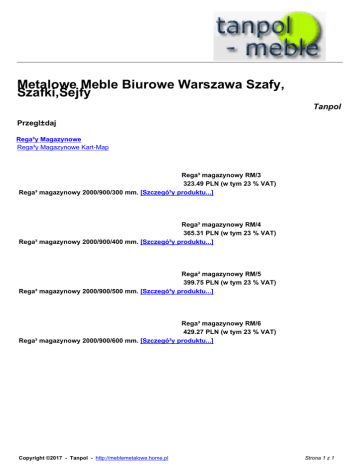 Metalowe Meble Biurowe Warszawa Szafy, Szafki,Sejfy Tanpol Przegl±daj Rega³y Magazynowe Rega³y Magazynowe Kart-Map Rega³ magazynowy RM/3 323.49 PLN (w tym 23 % VAT) Rega³ magazynowy 2000/900/300 mm. [Szczegó³y produktu...] Rega³ magazynowy RM/4 365.31 PLN (w tym 23 % VAT) Rega³ magazynowy 2000/900/400 mm. [Szczegó³y produktu...] Rega³ magazynowy RM/5 399.75 PLN (w tym 23 % VAT) Rega³ magazynowy 2000/900/500 mm. [Szczegó³y produktu...] Rega³ magazynowy RM/6 429.27 PLN (w tym 23 % VAT) Rega³ magazynowy 2000/900/600 mm. [Szczegó³y produktu...] Copyright ©2017 - Tanpol - http://meblemetalowe.home.pl Strona 1 z 1