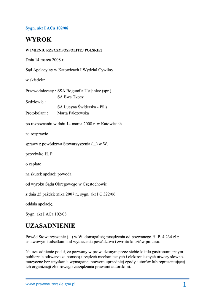 Sygn. akt I ACa 102/08 WYROK W IMIENIU RZECZYPOSPOLITEJ POLSKIEJ Dnia 14 marca 2008 r. Sąd Apelacyjny w Katowicach I Wydział Cywilny w składzie: Przewodniczący : SSA Bogumiła Ustjanicz (spr.) SA Ewa Tkocz Sędziowie : SA Lucyna Świderska - Pilis Protokolant : Marta Palczewska po rozpoznaniu w dniu 14 marca 2008 r. w Katowicach na rozprawie sprawy z powództwa Stowarzyszenia (...) w W. przeciwko H. P. o zapłatę na skutek apelacji powoda od wyroku Sądu Okręgowego w Częstochowie z dnia 25 października 2007 r., sygn. akt I C 322/06 oddala apelację. Sygn. akt I ACa 102/08 UZASADNIENIE Powód Stowarzyszenie (...) w W. domagał się zasądzenia od pozwanego H. P. 4 234 zł z ustawowymi odsetkami od wytoczenia powództwa i zwrotu kosztów procesu. Na uzasadnienie podał, że pozwany w prowadzonym przez siebie lokalu gastronomicznym publicznie odtwarza za pomocą urządzeń mechanicznych i elektronicznych utwory słownomuzyczne bez uzyskania wymaganej prawem uprzedniej zgody autorów lub reprezentującej ich organizacji zbiorowego zarządzania prawami autorskimi. www.prawoautorskie.gov.pl 1 Wielokrotnie podejmowane próby skłonienia go do zawarcia umowy licencyjnej nie odniosły rezultatu. Dochodzona należność stanowi sumę miesięcznych opłat, jakie powinien ponosić pozwany w okresie od 15 kwietnia 2000 r. do 31 maja 2006 r., ustalonych w najniższej wysokości w oparciu o Tabele Stawek Wynagrodzeń Autorskich, stanowiących załącznik do Decyzji Ministra Kultury i Dziedzictwa Narodowego z dnia 5 maja 2000 r. Nr DP.WPA.042/KOM/9/98/99. Nakazem zapłaty w postępowaniu upominawczym z 18 października 2006r. Sąd Okręgowy w Częstochowie uwzględnił powództwo. Pozwany w sprzeciwie od tego nakazu wniósł o oddalenie powództwa zarzucając, że w prowadzonym lokalu, mającym raczej charakter jadłodajni znajduje się wieża marki P., w której zepsuty jest magnetofon i odtwarzacz CD, wykorzystywana przez niego jako radio. Odbiór audycji radiowych dokonywany był nieregularnie, dla jego i personelu potrzeb. Brak anteny i niska jakość odbiornika czyniły niemożliwym odtwarzanie programu dla konsumentów. Korzystanie z niego nie miało żadnego wpływu na obroty lokalu. Zaskarżonym wyrokiem Sąd Okręgowy w Częstochowie oddalił powództwo. Rozstrzygnięcie oparte zostało na ustaleniach : Pozwany prowadził działalność gospodarczą pod nazwą (...) w oparciu o wpis do ewidencji działalności gospodarczej, w ramach której od 2000 r. do 31 lipca 2007 r. prowadził restaurację (...) w C. przy Placu (...). Lokal był czynny od poniedziałku do soboty od 11 do 18. Tworzyły go dwa nieoddzielone drzwiami pomieszczenia przeznaczone do obsługi klientów. W przedsionku prowadzącym do kuchni, niewidocznym na zewnątrz sali konsumpcyjnej znajdował się odbiornik radiowy marki P., zakupiony w 1998 r. Nie był to nowoczesny ani profesjonalny egzemplarz, nie miał oryginalnej anteny, zepsuciu uległ magnetofon i odtwarzacz CD. Początkowo pozwany korzystał z niego w domu, ale kiedy większą część dnia spędzał w lokalu przyniósł do niego ten odbiornik. Jakość odbioru była bardzo niska z uwagi na szumy i zakłócenia. W lokalu ustawione były dwa głośniki, jeden w kuchni, skierowany do jej wnętrza, a drugi na półce przy barze, w kierunku barmana. Odbiór programów był nieregularny, czasami pozwany włączał radio, żeby posłuchać wiadomości, sporadycznie włączali go także pracownicy, słuchano Radia (...), (...) i Radia (...). Na ogół nie było włączane, jeśli w lokalu byli konsumenci. Pozwany polecił żonie i córce oraz zatrudnionym pracownikom, żeby nie włączali odbiornika w obecności konsumentów, nie chciał żeby utożsamiali go z konkretnymi poglądami politycznymi. www.prawoautorskie.gov.pl 2 Inspektor powoda, świadek J. W., czterokrotnie odwiedził lokal pozwanego 12 lipca 2001 r., 30 listopada 2001 r., 5 lipca 2005 r., 31 marca 2006 r. i z przebiegu tych wizyt sporządził protokoły. Z pierwszego wynika, że o godzinie 14.39 w radiu nadawany był program Radia (...), nie odnotowano rodzaju audycji ani faktu obecności konsumentów. W następnym stwierdzono, że na drzwiach widniał napis „sala zarezerwowana,” bez wskazania charakteru imprezy, słyszalna była muzyka, rozpoznano piosenkę, informację o rozpowszechnianiu programu radiowego przekazane zostały przez barmana. W czasie kolejnej bytności od 18.15 do18.25 odnotowano fakt włączenia radia (Radia (...)), obecność dwóch konsumentów, nie rozpoznano nadawanego utworu ani tego czy był on słyszalny w sali konsumpcyjnej. W toku dwóch kolejnych wizyt od 18.15 do 18.25 i od15.14 do 15.21 w lokalu było dwóch i trzech konsumentów, ustalono włączenie odbiornika (Radia (...)/ (...)), nadawanie utworów muzyki rozrywkowej, dobrą słyszalność, ale utwory nie zostały rozpoznane. W dniu 10 sierpnia 2000 r. sporządzona została „ Ankieta kontrahenta”, podpisana przez żonę pozwanego, pracującą także w lokalu, z której wynika, że wykorzystywane były w nim również gramofon i magnetofon, co było niezgodne z rzeczywistym stanem. Zeznania przesłuchanych świadków K. K., R. D., M. D. (1), W. R., H. G., często stołujących się w restauracji pozwanego, wskazują że zdarzało się słyszeć urządzenie grające, przekaz był niewyraźny( szum, charczenie), głównie były to audycje słowne, słuchane przez pozwanego w okolicy baru. Nie byli oni zainteresowani programem radiowym, przychodzili żeby smacznie, szybko i tanio zjeść. Podczas organizowanych imprez nie korzystano z radia, śpiewali jego uczestnicy przy dźwiękach gitary albo towarzyszyła im profesjonalnie zorganizowana oprawa muzyczna. Pracownik pozwanego świadek J. P. zeznał, że programu radiowego słuchano pod nieobecność konsumentów, odbiornik nie był dobrej jakości, nie było możliwości głośnego odbioru, żeby mógł być dobrze słyszany w salach konsumpcyjnych. Z zeznań po