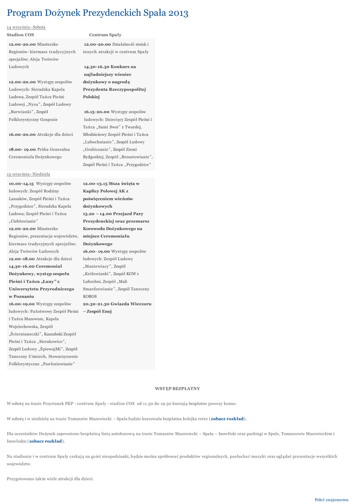 Program Dożynek Prezydenckich Spała 2013 14 wrze śnia - Sobota Stadion COS Centrum Spa ły 12.00-20.00 Miasteczko 12.00-20.00 Działalno ść stoisk i Regionów- kiermasz tradycyjnych innych atrakcji w centrum Spa ły specja łów; Aleja Twórców Ludowych 14.30-16.30 Konkurs na najładniejszy wieniec 12.00-20.00 Wyst ępy zespołów dożynkowy o nagrod ę Ludowych: Sieradzka Kapela Prezydenta Rzeczypospolitej Ludowa, Zespół Ta ńca Pieśni Polskiej Ludowej „Nysa ”, Zespół Ludowy „Barwianki ”, Zespół 16.15-20.00 Wyst ępy zespołów Folklorystyczny Gosposie ludowych: Dzieci ęcy Zespół Pieśni i Ta ńca „Sami Swoi” z Twardej, 16.00-20.00 Atrakcje dla dzieci Młodzieżowy Zespół Pieśni i Ta ńca „Lubochnianie ”, Zespół Ludowy 18.00- 19.00 Próba Generalna „Grabiczanie ”, Zespół Ziemi Ceremonia łu Dożynkowego Bydgoskiej, Zespó ł „ Brzustowianie ”, Zespół Pieśni i Ta ńca „Przygodzice ” 15 wrze śnia - Niedziela 10.00-14.15 Wyst ępy zespołów 12.00-13.15 Msza święta w ludowych: Zespó ł Rodziny Kaplicy Polowej AK z Lassaków, Zespół Pieśni i Ta ńca poświęceniem wieńców „Przygodzice ”, Sieradzka Kapela dożynkowych Ludowa; Zespół Pieśni i Ta ńca 13.20 – 14.00 Przejazd Pary „Ciebłowianie ” Prezydenckiej oraz przemarsz 12.00-20.00 Miasteczko Korowodu Dożynkowego na Regionów, prezentacja województw, miejsce Ceremonia łu kiermasz tradycyjnych specja łów; Dożynkowego Aleja Twórców Ludowych 16.00- 19.00 Wyst ępy zespołów 12.00-18.00 Atrakcje dla dzieci ludowych: Zespó ł Ludowy 14.30-16.00 Ceremonia ł „Maniewiacy ”, Zespół Dożynkowy, wyst ęp zespołu „Królowianki ”, Zespół KGW z Pieśni i Ta ńca „Łany ” z Lubochni, Zespó ł „ Mali Uniwersytetu Przyrodniczego Smardzewianie ”, Zespół Taneczny w Poznaniu KOBOS 16.00-19.00 Wyst ępy zespołów 20.30 -21.30 Gwiazda Wieczoru ludowych: Pa ństwowy Zespó ł Pieśni – Zespół Enej i Ta ńca Mazowsze, Kapela Wojciechowska, Zespó ł „Ściernianeczki ”, Kaszubski Zespół Pieśni i Ta ńca „Sierakowice ”, Zespół Ludowy „ŚpiewajMi ”, Zespół Taneczny U śmiech, Stowarzyszenie Folklorystyczne „Paw łosiowianie ” WSTĘP BEZPŁATNY W sobotę na trasie Przystanek PKP - centrum Spa ły - stadion COS od 11.30 do 19.30 kursuj ą bezpłatne powozy konne. W sobotę i w niedziel ę na trasie Tomaszów Mazowiecki – Spała będzie kursowa ła bezpłatna kolejka retro ( zobacz rozkład). Dla uczestników Do żynek zapewniono bezp łatn ą lini ę autobusow ą na trasie Tomaszów Mazowiecki – Spała – Inowłódz oraz parkingi w Spale, Tomaszowie Mazowieckim i Inowłodzu (zobacz rozkład). Na stadionie i w centrum Spa ły czekaj ą na go ści niespodzianki, b ędzie można spróbowa ć produktów regionalnych, pos łucha ć muzyki oraz oglądać prezentacje wszystkich województw. Przygotowano tak że wiele atrakcji dla dzieci. Poleć znajomemu
