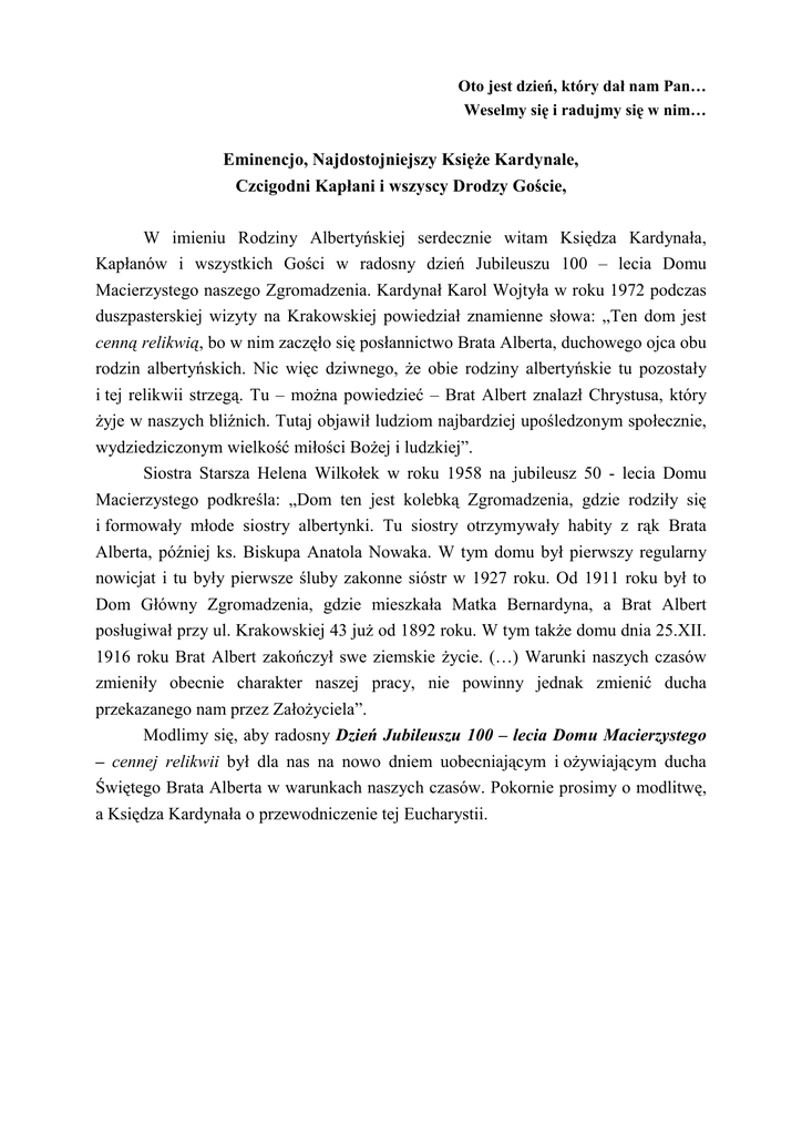 Oto jest dzień, który dał nam Pan… Weselmy się i radujmy się w nim… Eminencjo, Najdostojniejszy KsięŜe Kardynale, Czcigodni Kapłani i wszyscy Drodzy Goście, W imieniu Rodziny Albertyńskiej serdecznie witam Księdza Kardynała, Kapłanów i wszystkich Gości w radosny dzień Jubileuszu 100 – lecia Domu Macierzystego naszego Zgromadzenia. Kardynał Karol Wojtyła w roku 1972 podczas duszpasterskiej wizyty na Krakowskiej powiedział znamienne słowa: „Ten dom jest cenną relikwią, bo w nim zaczęło się posłannictwo Brata Alberta, duchowego ojca obu rodzin albertyńskich. Nic więc dziwnego, Ŝe obie rodziny albertyńskie tu pozostały i tej relikwii strzegą. Tu – moŜna powiedzieć – Brat Albert znalazł Chrystusa, który Ŝyje w naszych bliźnich. Tutaj objawił ludziom najbardziej upośledzonym społecznie, wydziedziczonym wielkość miłości BoŜej i ludzkiej”. Siostra Starsza Helena Wilkołek w roku 1958 na jubileusz 50 - lecia Domu Macierzystego podkreśla: „Dom ten jest kolebką Zgromadzenia, gdzie rodziły się i formowały młode siostry albertynki. Tu siostry otrzymywały habity z rąk Brata Alberta, później ks. Biskupa Anatola Nowaka. W tym domu był pierwszy regularny nowicjat i tu były pierwsze śluby zakonne sióstr w 1927 roku. Od 1911 roku był to Dom Główny Zgromadzenia, gdzie mieszkała Matka Bernardyna, a Brat Albert posługiwał przy ul. Krakowskiej 43 juŜ od 1892 roku. W tym takŜe domu dnia 25.XII. 1916 roku Brat Albert zakończył swe ziemskie Ŝycie. (…) Warunki naszych czasów zmieniły obecnie charakter naszej pracy, nie powinny jednak zmienić ducha przekazanego nam przez ZałoŜyciela”. Modlimy się, aby radosny Dzień Jubileuszu 100 – lecia Domu Macierzystego – cennej relikwii był dla nas na nowo dniem uobecniającym i oŜywiającym ducha Świętego Brata Alberta w warunkach naszych czasów. Pokornie prosimy o modlitwę, a Księdza Kardynała o przewodniczenie tej Eucharystii. Eminencjo, Najdostojniejszy KsięŜe Kardynale, Czcigodni Kapłani i wszyscy Drodzy Goście, Z wielką radością świętujemy dzień Jubileuszu 100. lecia Domu Macierzystego i dziękujemy Panu Bogu za wielkie dzieła łaski w Ŝyciu Świętego Brata Alberta i naszych Zgromadzeń. Dziękujemy Bogu za ogrom Jego Łask, którymi wspierał kolejne pokolenia Sióstr i Braci, by swoją obecnością i pracą w róŜnych uwarunkowaniach społecznych świadczyli o BoŜej miłości wobec kaŜdego, a zwłaszcza cierpiącego i najbardziej potrzebującego człowieka. Z pokorą w sercu i wdzięcznością stajemy wobec tajemnicy posługi albertyńskiej, dzień po dniu przez 100 lat istnienia tego Domu Macierzystego – cennej relikwii – dziedzictwa Św. Brata Alberta. Zaszczytem dla naszej rodziny zakonnej jest obecność Jego Eminencji Księdza Kardynała Franciszka Macharskiego na dzisiejszej uroczystości. Jesteś Ojcze znakiem Kościoła jako Sukcesji Świętych, w myśl Św. Brata Alberta… Pragnę - na Ręce Jego Eminencji Księdza Kardynała - podziękować za obecność i Ŝyczliwość, pasterską troskę i opiekę Kościoła nad albertyńskim dziełem od samego jego początku oraz ponownie zapewnić o posłuszeństwie wobec Kościoła oraz o twórczej wierności charyzmatowi Świętego Brata Alberta. Czcigodnym KsięŜom i Ojcom koncelebransom dziękuję za dar modlitwy Eucharystycznej, która zjednoczyła nas wszystkich w Chrystusie. Braciom Bonifratrom - Gospodarzom tego miejsca dziękuję za otwartość i gościnność. Nie moŜe zabraknąć dzisiaj słów wdzięczności skierowanych do Przedstawicieli Urzędu Wojewódzkiego Miasta Krakowa, Urzędu Miasta, Władz Samorządowych, Społecznego Komitetu Odnowy Zabytków Krakowa, Miejskiego Ośrodka Pomocy Społecznej, Przedstawicieli róŜnych instytucji współpracujących z nami w dziele pomocy drugiemu człowiekowi… To w roku 1908 ówczesna Rada Miasta Krakowa podarowała m.in. ten Dom Bratu Albertowi dla Jego Zgromadzeń i ludzi bezdomnych. Mimo róŜnorodnych trudności na przestrzeni 100 lat, zwłaszcza cięŜkich lat komunistycznych, Siostry i Bracia cieszyli się Ŝyczliwością i zrozumieniem ze strony społeczności Krakowa, róŜnych instytucji i osób wspierających.– Dziękuję wszystkim za współpracę, za dzielenie chwil radosnych i wsparcie w chwilach trudnych zmagań. Dziękuję za wieloraką pomoc, zwłaszcza finansową w odnowie naszego domu i prowadzeniu dzieła słuŜby najbardziej potrzebującym. Bóg zapłać takŜe Chorym i Tym wszystkim, którym posługujemy - za Waszą Ŝyczliwość, modlitwę i ofiarowane cierpienie. Drogim naszym Siostrom, które tu posługują i posługiwały, a dziś przyjechały na uroczystość Jubileuszową, jak równieŜ naszym Braciom Albertynom, pragnę podziękować za dzielenie się sobą, dobrocią i swoim Ŝyciem jak chlebem. Bóg zapłać Darczyńcom, Przyjaciołom i Tym wszystkim, którzy swoją chrześcijańską postawą, zaangaŜowaniem i Ŝyciem włączają się w albertyńskie świadectwo słuŜby i oddania drugiemu człowiekowi. O wieczną nagrodę proszę Dobrego Boga dla tych Sióstr i Braci, Darczyńców, Osób pomagających, zwłaszcza dla Śp. Profesora Tadeusza Chrzanowskiego i osób współpracujących oraz Tych, którym słuŜyłyśmy, a których między nami juŜ nie ma. Przyszłość albertyńskiej posługi miłosierdzia zawierzam Dobremu Panu, który ma w ręku wszystko, aŜ do najdrobniejszych szczegółów. Świętując 100 lat Domu Macierzystego, niejako na nowo dziedziczymy cenną relikwię Brata Alberta… I w geście podarowanego chleba, niechaj mi wolno będzie uobecnić Świętego Brata Alberta – to jest Jego dziedzictwo chleba i Ŝycia… dziedzictwo wdzięczności, słuŜby i miłości do Boga i kaŜdego człowieka… Aby to albertyńskie dziedzictwo stawało się naszym udziałem, aby oŜywiło w nas nową wyobraźnię miłosierdzia, proszę Księdza Kardynała i Kapłanów o pasterskie błogosławieństw