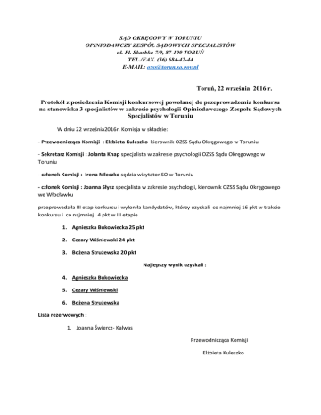 SĄD OKRĘGOWY W TORUNIU OPINIODAWCZY ZESPÓŁ SĄDOWYCH SPECJALISTÓW ul. Pl. Skarbka 7/9, 87-100 TORUŃ TEL./FAX. (56) 684-42-44 E-MAIL: [email protected] Toruń, 22 września 2016 r. Protokół z posiedzenia Komisji konkursowej powołanej do przeprowadzenia konkursu na stanowiska 3 specjalistów w zakresie psychologii Opiniodawczego Zespołu Sądowych Specjalistów w Toruniu W dniu 22 września2016r. Komisja w składzie: - Przewodnicząca Komisji : Elżbieta Kuleszko kierownik OZSS Sądu Okręgowego w Toruniu - Sekretarz Komisji : Jolanta Knap specjalista w zakresie psychologii OZSS Sądu Okręgowego w Toruniu - członek Komisji : Irena Mleczko sędzia wizytator SO w Toruniu - członek Komisji : Joanna Słysz specjalista w zakresie psychologii, kierownik OZSS Sądu Okręgowego we Włocławku przeprowadziła III etap konkursu i wyłoniła kandydatów, którzy uzyskali co najmniej 16 pkt w trakcie konkursu i co najmniej 4 pkt w III etapie 1. Agnieszka Bukowiecka 25 pkt 2. Cezary Wiśniewski 24 pkt 3. Bożena Strużewska 20 pkt Najlepszy wynik uzyskali : 4. Agnieszka Bukowiecka 5. Cezary Wiśniewski 6. Bożena Strużewska Lista rezerwowych : 1. Joanna Świercz- Kalwas Przewodnicząca Komisji Elżbieta Kuleszko
