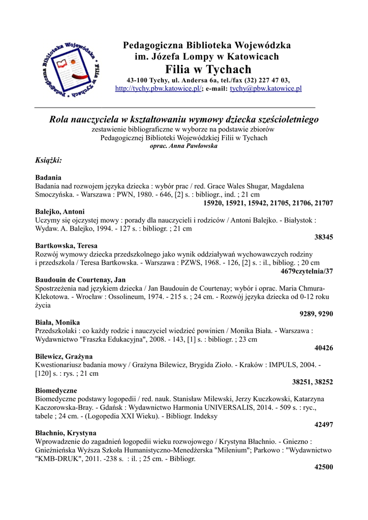 Pedagogiczna Biblioteka Wojewódzka im. Józefa Lompy w Katowicach Filia w Tychach 43-100 Tychy, ul. Andersa 6a, tel./fax (32) 227 47 03, http://tychy.pbw.katowice.pl/; e-mail: [email protected] Rola nauczyciela w kształtowaniu wymowy dziecka sześcioletniego zestawienie bibliograficzne w wyborze na podstawie zbiorów Pedagogicznej Biblioteki Wojewódzkiej Filii w Tychach oprac. Anna Pawłowska Książki: Badania Badania nad rozwojem języka dziecka : wybór prac / red. Grace Wales Shugar, Magdalena Smoczyńska. - Warszawa : PWN, 1980. - 646, [2] s. : bibliogr., ind. ; 21 cm 15920, 15921, 15942, 21705, 21706, 21707 Balejko, Antoni Uczymy się ojczystej mowy : porady dla nauczycieli i rodziców / Antoni Balejko. - Białystok : Wydaw. A. Balejko, 1994. - 127 s. : bibliogr. ; 21 cm 38345 Bartkowska, Teresa Rozwój wymowy dziecka przedszkolnego jako wynik oddziaływań wychowawczych rodziny i przedszkola / Teresa Bartkowska. - Warszawa : PZWS, 1968. - 126, [2] s. : il., bibliog. ; 20 cm 4679czytelnia/37 Baudouin de Courtenay, Jan Spostrzeżenia nad językiem dziecka / Jan Baudouin de Courtenay; wybór i oprac. Maria ChmuraKlekotowa. - Wrocław : Ossolineum, 1974. - 215 s. ; 24 cm. - Rozwój języka dziecka od 0-12 roku życia 9289, 9290 Biała, Monika Przedszkolaki : co każdy rodzic i nauczyciel wiedzieć powinien / Monika Biała. - Warszawa : Wydawnictwo "Fraszka Edukacyjna", 2008. - 143, [1] s. : bibliogr. ; 23 cm 40426 Bilewicz, Grażyna Kwestionariusz badania mowy / Grażyna Bilewicz, Brygida Zioło. - Kraków : IMPULS, 2004. [120] s. : rys. ; 21 cm 38251, 38252 Biomedyczne Biomedyczne podstawy logopedii / red. nauk. Stanisław Milewski, Jerzy Kuczkowski, Katarzyna Kaczorowska-Bray. - Gdańsk : Wydawnictwo Harmonia UNIVERSALIS, 2014. - 509 s. : ryc., tabele ; 24 cm. - (Logopedia XXI Wieku). - Bibliogr. Indeksy 42497 Błachnio, Krystyna Wprowadzenie do zagadnień logopedii wieku rozwojowego / Krystyna Błachnio. - Gniezno : Gnieźnieńska Wyższa Szkoła Humanistyczno-Menedżerska "Milenium"; Parkowo : "Wydawnictwo "KMB-DRUK", 2011. -238 s. : il. ; 25 cm. - Bibliogr. 42500 Bochniarz, Antoni Gdy masz dziecko z wadą wymowy / Antoni Bochniarz. - Wyd. 2. - Żory : "Demostenes", 2001. - 199, [1] s. : il. ; 24 cm 36215 Bogdańska, Teresa Głoskolandia : opowiadania logopedyczne dla dzieci / Teresa Bogdańska, Grażyna Maria Olszewska. - Warszawa : Fraszka Edukacyjna, 2009. - 59, [1] s. : kolor.rys., bibliogr. ; 29 cm. Książka zawiera cykl 40 opowiadań logopedycznych przeznaczone dla dzieci w wieku przedszkolnym i wczesnoszkolnym. 41984 Bokus, Barbara Tworzenie opowiadań przez dzieci : o linii i polu narracji / Barbara Bokus. - Kielce : Wydaw. Energeia, 1991. - 167 s. : rys., tabele, wykr., bibliogr., załączniki ; 21 cm. - (Język. Poznanie. Komunikacja ; T. 1) 30410 Boniecka, Barbara Kształt dziecięcego słowa / Barbara Boniecka. - Lublin : Wydaw. UMCS, 1997. - 348 s. : bibliogr. ; 21 cm. - (Komunikacja Językowa i Jej Zaburzenia) 33398 Cieszyńska, Jadwiga Od słowa przeczytanego do wypowiedzianego : droga nabywania systemu językowego przez dzieci niesłyszące w wieku poniemowlęcym i przedszkolnym / Jadwiga Cieszyńska. - Kraków : Wydaw. Nauk. AP, 2001. - 181, [5] s. : bibliogr., aneks ; 24 cm 36239, 37153 Cieszyńska, Jagoda Wczesna interwencja terapeutyczna : stymulacja rozwoju dziecka : od noworodka do 6 roku życia / Jagoda Cieszyńska, Marta Korendo. - Kraków : Wydaw. Edukacyjne, 2007. - 326 s. : rys., bibliogr. ; 24 cm 39604, 40371 Demel, Genowefa Elementy logopedii / Genowefa Demelowa. - Wyd. 3. - Warszawa : WSiP, 1987. - 103, [1] s. : il., bibliogr. ; 21 cm 24614, 24615, 24616 Demel, Genowefa Minimum logopedyczne nauczyciela przedszkola / Genowefa Demel. - Wyd. 4. - Warszawa : WSiP, 1996. - 104, [4] s. : bibliogr. ; 24 cm 32415, 32416 Demel, Genowefa Wady wymowy : profilaktyka i korekcja / Genowefa Demel. - Wyd. 2 popr. i uzup.. - Warszawa : PZWL, 1979. - 49, [3] s. ; 20 cm 14886czytelnia/37 Diagnoza Diagnoza logopedyczna : podręcznik akademicki / red. nauk. Ewa Czaplewska, Stanisław Milewski. - Sopot : Gdańskie Wydaw. Psychologiczne, 2012. - 527; [1] s. : ryc., tabele, ind. ; 24 cm. - (Biblioteka Logopedy). - Bibliogr. po rozdz. 41664, 41665 Diagnoza Diagnoza dysleksji : najważniejsze problemy / pod red. Grażyny Krasowicz-Kupis. - Gdańsk : Wydawnictwo Harmonia, 2009. - 355, [1] s. : bibliogr. ; 24 cm 40993, 41155 Dołęga, Zofia Promowanie rozwoju mowy w okresie dzieciństwa - prawidłowości rozwoju, diagnozowanie i profilaktyka / Zofia Dołęga. - Katowice : Wydaw. UŚ, 2003. - 225, [1] s. : bibliogr. ; 24 cm 37202 Doradca Doradca Nauczyciela Sześciolatków / pr.zb.. - Warszawa : CMPPP, 2006. - 62,[6], 48, 52, 68, 52, 48, 40 s. : tabele, rys., bibliogr. ; 27 cm. 39460, 39461 Dzieci Dzieci o specjalnych potrzebach komunikacyjnych : diagnoza - edukacja - terapia / red. nauk. Barbara Winczura. - Kraków : IMPULS, 2014. - 431 s. : wykr., tabele ; 24 cm. - Bibliogr. 42491, 42776 Dziecko Dziecko w świecie języka / Danuta Bula, Danuta Krzyżyk, Bernadeta Niesporek-Szamburska, Helena Synowiec. - Kraków : IMPULS, 2004. - 271, [1] s. : bibliogr. ; 24 cm. - (Nauczyciele Nauczycielom ; t. 13) 37809, 37889 Dziecko Dziecko w zabawie i świecie języka / red. Anna Brzezińska, T. Czuba, Grzegorz Lutomski, B. Smykowski. - Poznań : Zysk i S-ka Wydawnictwo, 1995. - 326, [1] s. ; 21 cm 31766 Emiluta-Rozya, Danuta Wspomaganie rozwoju mowy dziecka w wieku przedszkolnym / Danuta Emiluta-Rozya. - Wyd. 3 popr.. - Warszawa : CMPPP, 2006. - 58, [1] s. : bibliogr. ; 21 cm 39349, 41405 Filipiak, Ewa Aktywność językowa dzieci w wieku wczesnoszkolnym / Ewa Filipiak. - Bydgoszcz : Wydaw. WSP, 1996. - 189, [12] s. : tabele, bibliogr. ; 24 cm 33845 Filipiak, Ewa Konteksty rozwoju aktywności językowej dzieci w wieku wczesnoszkolnym / Ewa Filipiak. Bydgoszcz : Wydaw. AB, 2002. - 360 s. : wykr., tabele, bibliogr. ; 24 cm 36698 Hołyńska, Bożena Zabawy rozwijające mowę dziecka / Boż