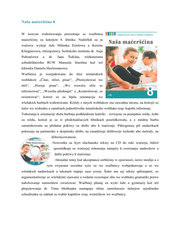 Naša maćeršćina 8 W nowym wuhotowanju prezentuje so wučbnica maćeršćiny za šulerjow 8. lětnika. Nadźěłali su ju wučerce wyšeje šule Milenka Ertelowa a Kerstin Klingnerowa, rěčespytnicy Serbskeho instituta dr. Anja Pohončowa a dr. Jana Šołćina, wědomostna sobudźěłaćerka RCW Manuela Smolina kaž tež lektorka Daniela Heelemanowa. Wučbnica je rozrjadowana do šěsć tematiskich wobłukow „Čitać, rěčeć, pisać“, „Přemyslować wo rěči“, „Prawje pisać“, „Wo wuwiću rěče so informować“, „Wosobu předstajić“ a „Kontrolować, so orientować“, kotrež su za lěpšu orientaciju we wšelakich barbach wuhotowane. Kóždy z tutych wobłukow ma zawodnu stronu, na kotrejž so šuler wo wobsahu a zaměrach jednotliweho tematiskeho wobłuka resp. kapitla informuje. Tohorunja k orientaciji słuža barbnje podkładźene kašćiki – čerwjene za pomjatnu wědu, žołte za wědu, kotraž je so w předchadźacych lětnikach posrědkowała, a z módrej barbu zaramikowane su přidatne pokiwy za dźěło abo k maćiznje. Piktogramy při nadawkach pokazuja na partnerske a skupinske dźěło, na zasadźenje dźěłoweje techniki abo metody, na diferencowanosć. Nowostka su štyri słuchanske teksty na CD do ruki wučerja, hdźež sposrědkuja so wučerjej tohorunja namjety k rozrisanju nadawkow a dalše pokiwy k maćiznje. Aktualne temy kaž akceptanca serbšćiny w zjawnosći, nowe medije a z tym zwjazane socialne syće so we wučbnicy wobjednawaja a so we wšelakich nadawkach a tekstach stajnje zaso jewja: Šuler ma sej teksty spřistupnić, so argumentatiwnje ze wšelakimi zjawami a widami rozestajeć abo we wobłuku gramatiki prawe nałožowanje numeralow zwučować. Wučbnej planaj za wyše šule a gymnazij kaž tež přepytowanja dr. Tima Meškanka nastupajo rěčne zamóžnosće šulerjow srjedźneho schodźenka su zakład za wuběr kapitlow resp. wotrězkow we wučbnicy.